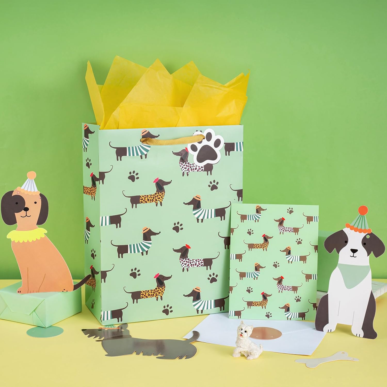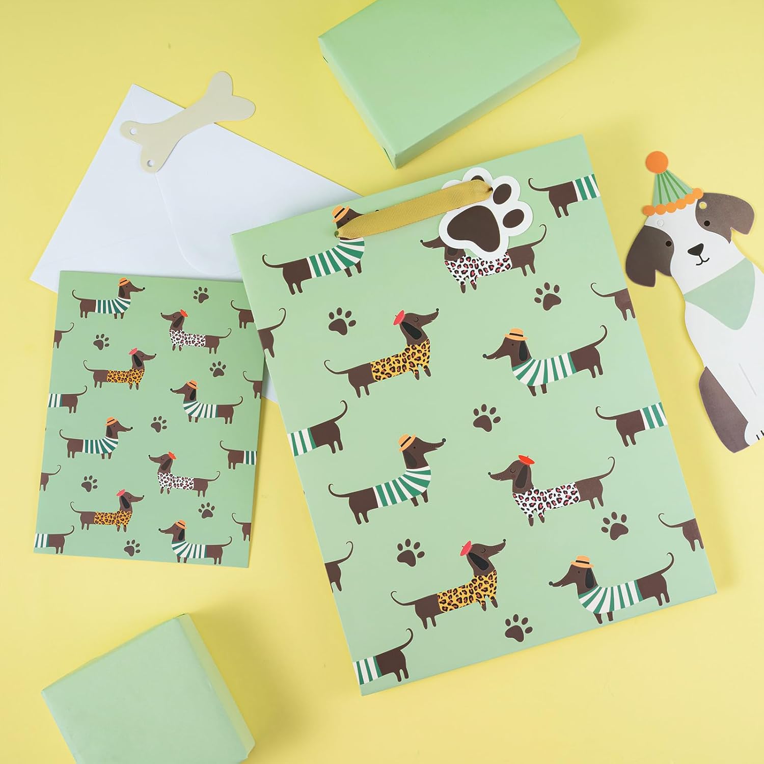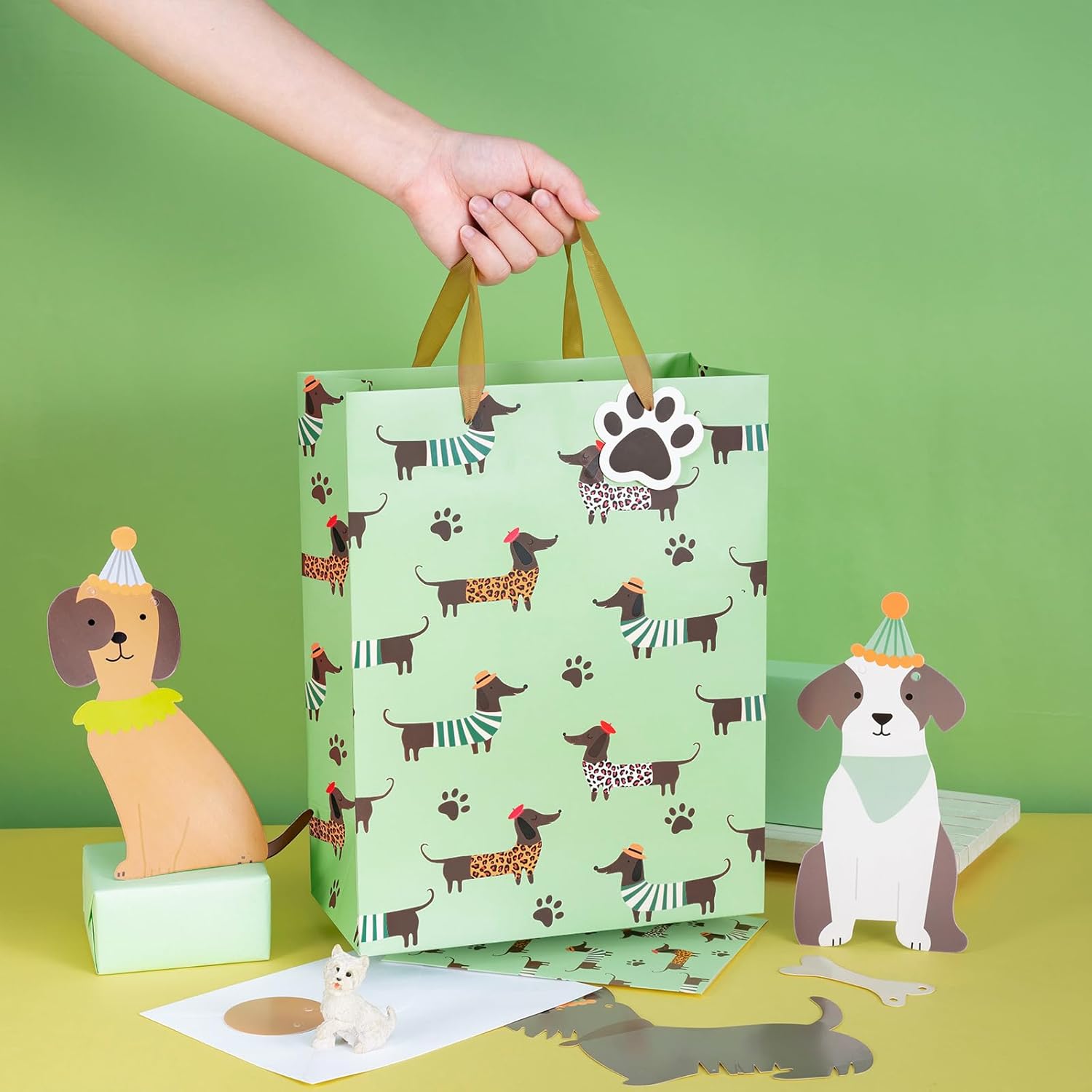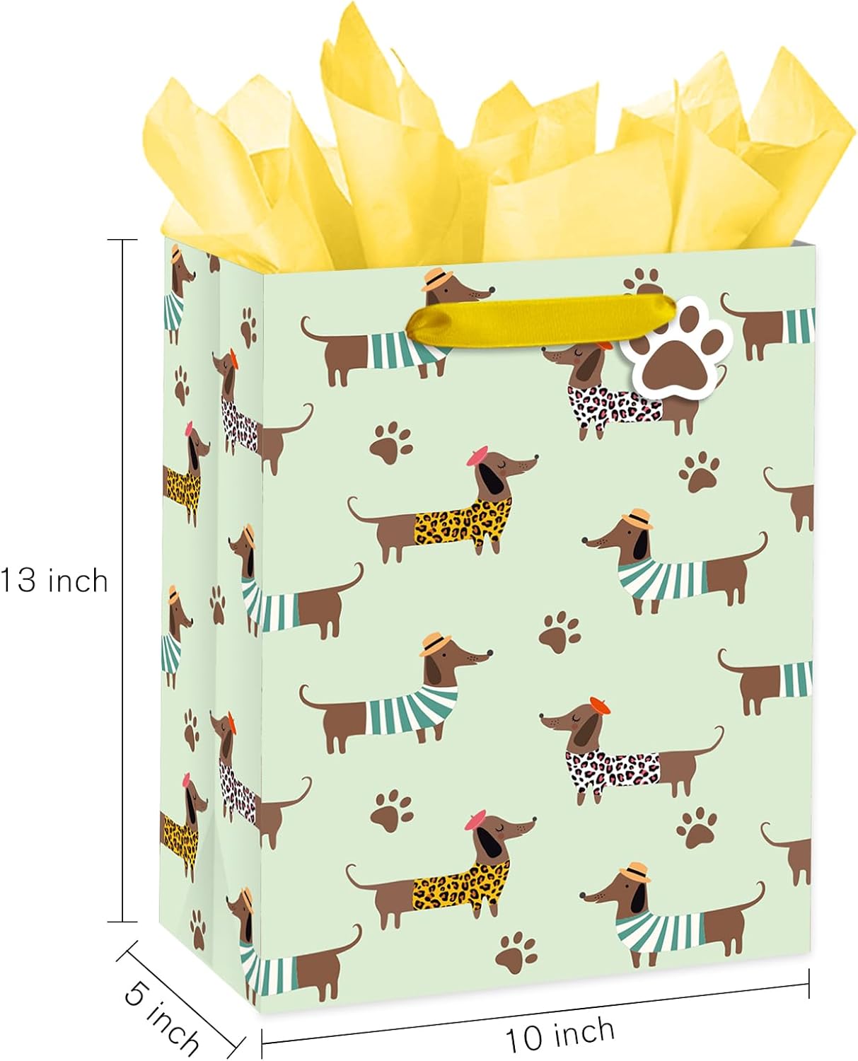 Adorabile design del bassotto: bassotti giocosi in abiti insoliti, camicie a righe, stampe leopardate, top a pois, cappelli e sciarpe in verde tenue con graziose impronte di zampe. Dimensioni perfette: 25 x 12 x 33 cm. Questa borsa regalo offre spazio sufficiente per regali come giocattoli, libri, vestiti o confezioni regalo, rendendola un'ottima aggiunta alle borse da festa. Alta qualità: i nostri sacchetti regalo in cartone robusto e riutilizzabile da 210 g/m² sono un'alternativa semplice e veloce alla confezione regalo tradizionale: prendi e via! La borsa riutilizzabile può essere conservata anche come simpatico ricordo della celebrazione. Confezione risparmio: questo set di cinque sacchetti regalo assortiti comprende 1 sacchetto grande, 2 veline, 1 biglietto di auguri e 1 busta ed è quindi pronto per l'uso. È perfetto per regali, dolcetti o oggetti per regali ed è ideale per tutti i tipi di esigenze. Perfetto per ogni occasione: Ideale per bambini, amanti degli animali e chiunque ami i bassotti! Ideale per compleanni, feste per l'adozione di animali domestici, feste per cani o come regalo per la mamma o il papà del tuo cane preferito.