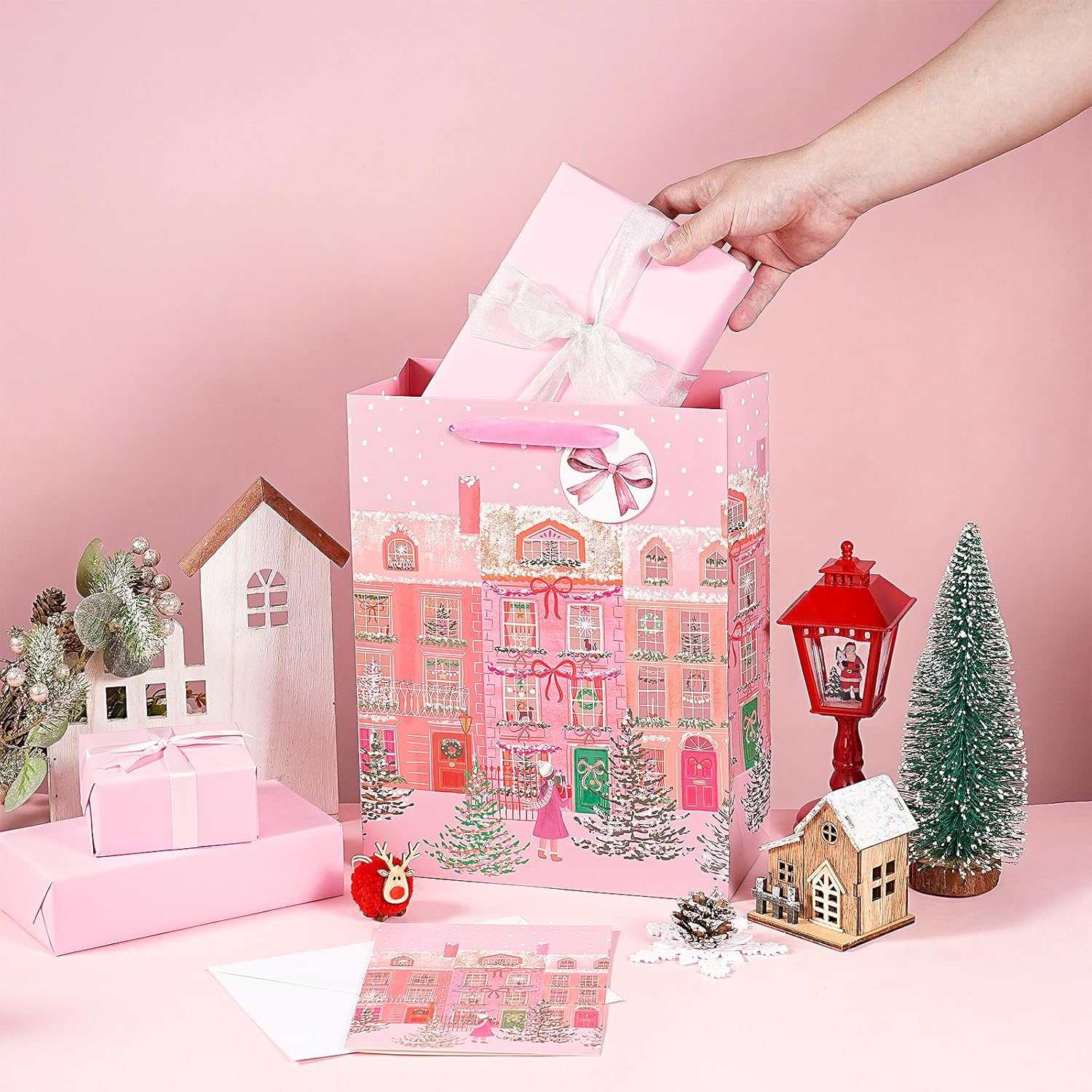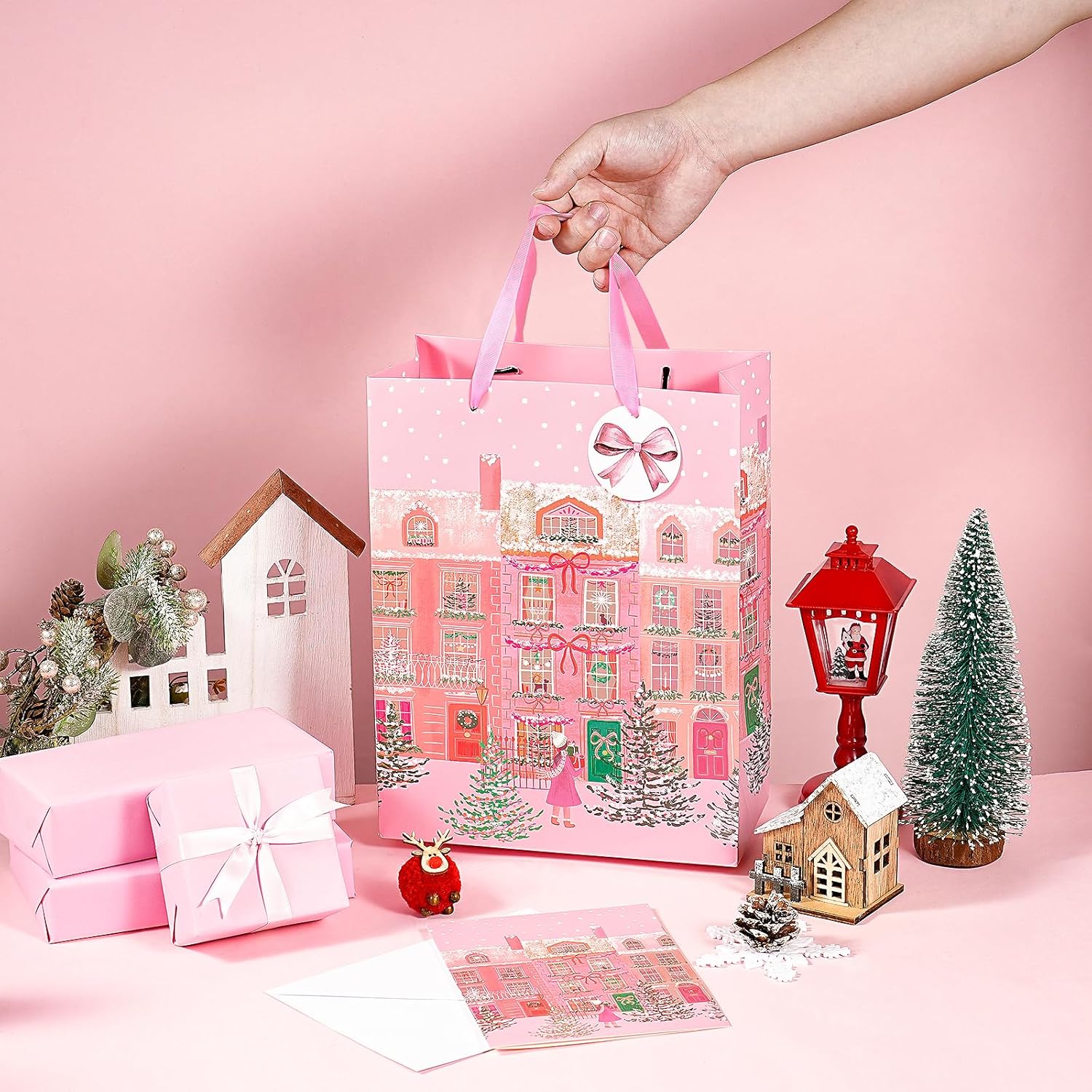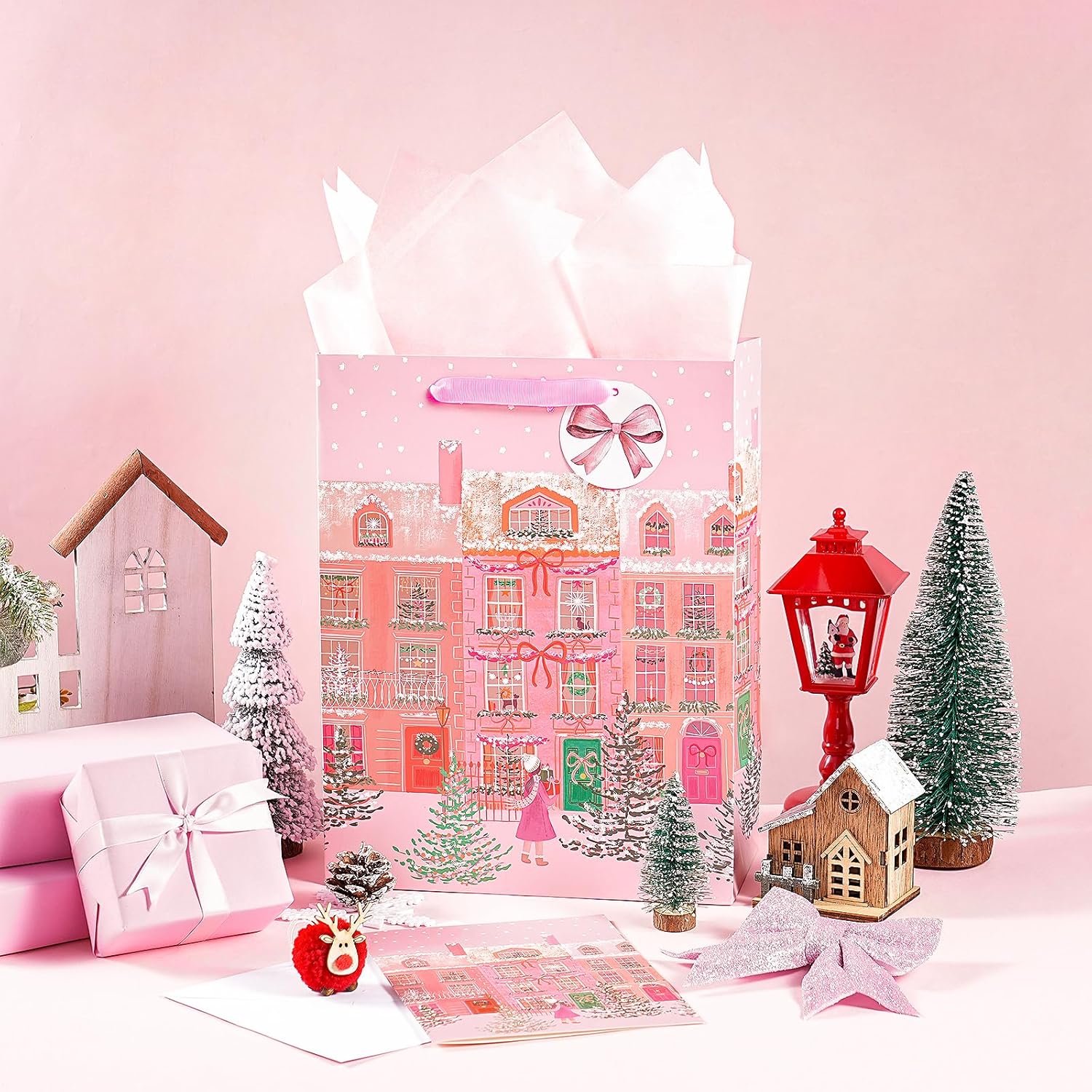 Winter Street Design: un'incantevole scena di strada rosa ricoperta di soffice neve, luci scintillanti e decorazioni natalizie. Con alberi di Natale, ghirlande e fiocchi rossi, l'illustrazione da sogno cattura la gioia di una passeggiata invernale. DIMENSIONE PERFETTA: Misura 10" x 5" x 13", questa borsa regalo offre spazio sufficiente per regali come giocattoli, libri, vestiti o confezioni regalo, rendendola un'ottima aggiunta alle borse da festa. Alta qualità: i nostri sacchetti regalo in cartone robusto e riutilizzabile da 210 g/m² sono un'alternativa semplice e veloce alla confezione regalo tradizionale: prendi e via! La borsa riutilizzabile può essere conservata anche come simpatico ricordo della celebrazione. Confezione risparmio: questo set di cinque sacchetti regalo assortiti comprende 1 sacchetto grande, 2 veline, 1 biglietto di auguri e 1 busta ed è quindi pronto per l'uso. È perfetto per regali, dolcetti o oggetti per regali ed è ideale per tutti i tipi di esigenze. IDEALE PER TUTTE LE VACANZE: perfetto per regali di Natale, riunioni di famiglia, sorprese natalizie, regali di classe o regali per feste stagionali. Adatto a ragazze, donne, adolescenti e vicini di casa