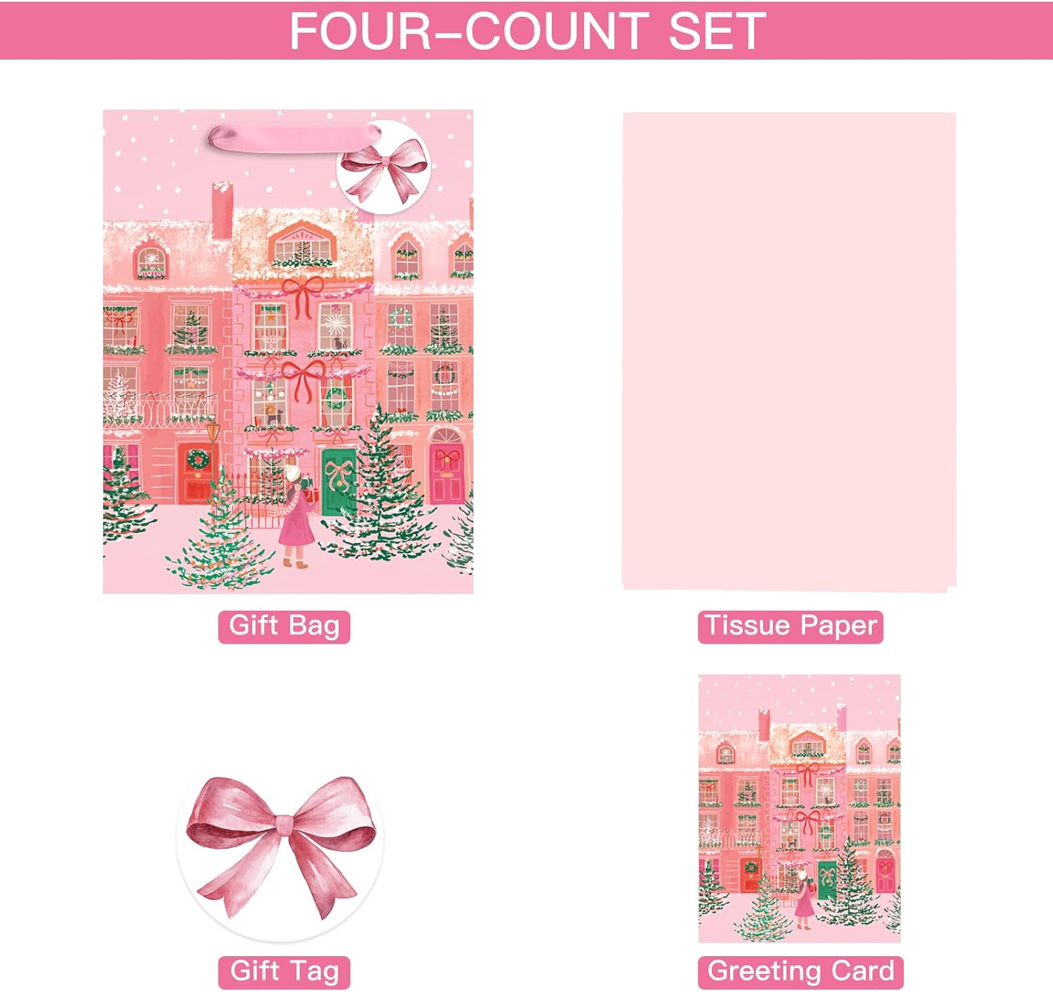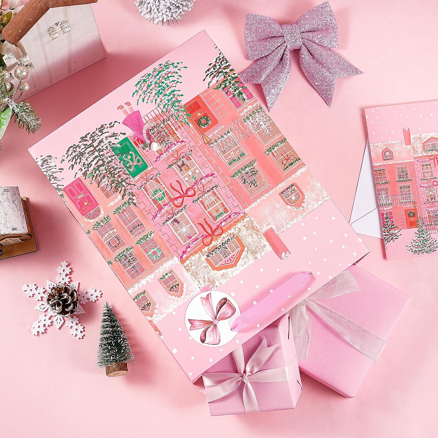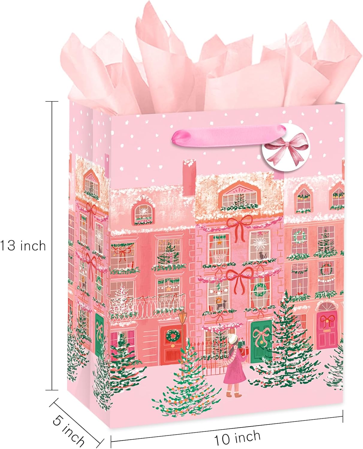 Winter Street Design: un'incantevole scena di strada rosa ricoperta di soffice neve, luci scintillanti e decorazioni natalizie. Con alberi di Natale, ghirlande e fiocchi rossi, l'illustrazione da sogno cattura la gioia di una passeggiata invernale. DIMENSIONE PERFETTA: Misura 10" x 5" x 13", questa borsa regalo offre spazio sufficiente per regali come giocattoli, libri, vestiti o confezioni regalo, rendendola un'ottima aggiunta alle borse da festa. Alta qualità: i nostri sacchetti regalo in cartone robusto e riutilizzabile da 210 g/m² sono un'alternativa semplice e veloce alla confezione regalo tradizionale: prendi e via! La borsa riutilizzabile può essere conservata anche come simpatico ricordo della celebrazione. Confezione risparmio: questo set di cinque sacchetti regalo assortiti comprende 1 sacchetto grande, 2 veline, 1 biglietto di auguri e 1 busta ed è quindi pronto per l'uso. È perfetto per regali, dolcetti o oggetti per regali ed è ideale per tutti i tipi di esigenze. IDEALE PER TUTTE LE VACANZE: perfetto per regali di Natale, riunioni di famiglia, sorprese natalizie, regali di classe o regali per feste stagionali. Adatto a ragazze, donne, adolescenti e vicini di casa