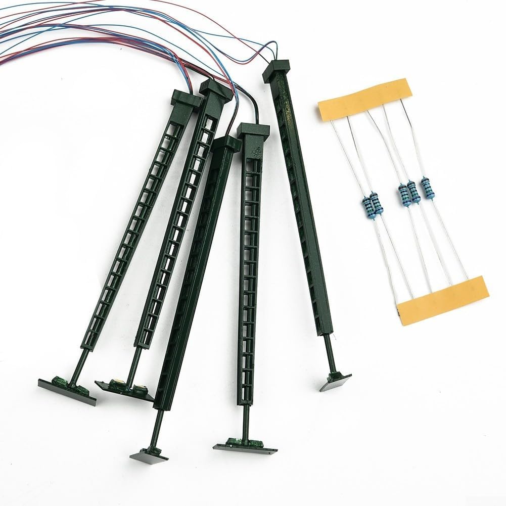 【Luci ferroviarie modello】 Soluzione di illuminazione perfetta per il layout di binari e edifici. Progettate specificamente per la scala N gauge, queste luci a traliccio aggiungono un tocco sorprendente al tuo mondo in miniatura. 【LED】 【Tensione e corrente adeguate】 prestazioni ottimali applicando la corretta corrente di funzionamento di 20mA ad ogni LED. La tensione di collegamento può essere 3V DC o AC. Nella confezione sono inclusi resistori in serie per il collegamento a 12-16V, consentendo la compatibilità con un trasformatore di tale gamma. 【 Costruzione】 Realizzate in metallo robusto, queste luci a traliccio sono costruite per durare. Il loro design robusto s stabilità e longevità, che li rende adatti per l'uso a lungo termine nel vostro modellismo ferroviario o layout. Contenuto della confezione: