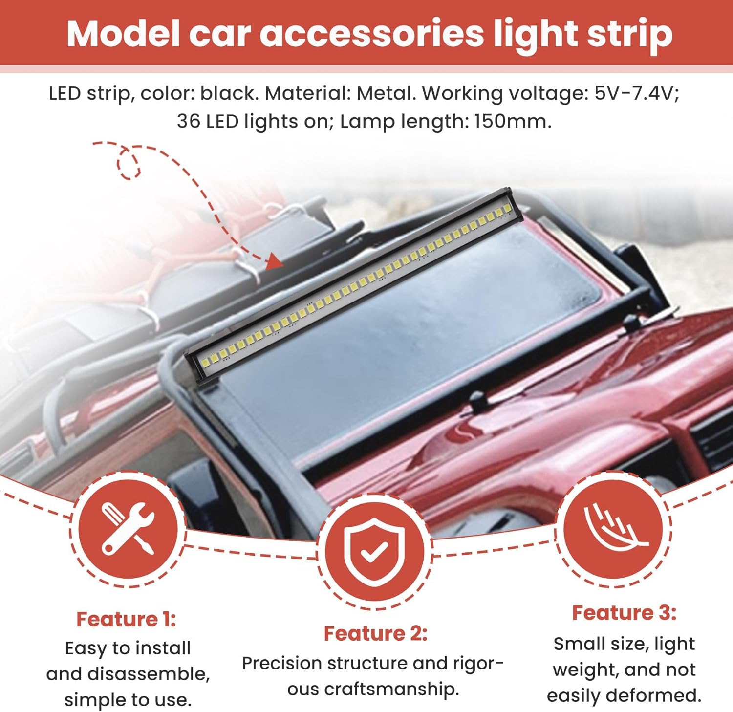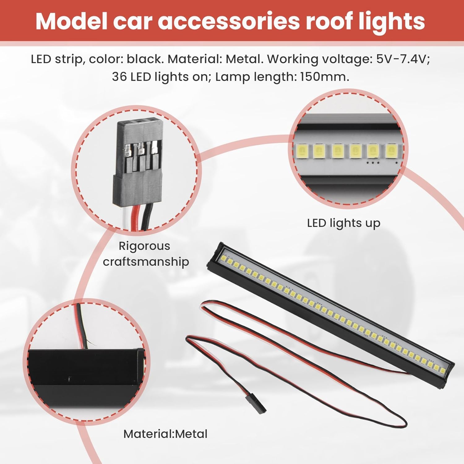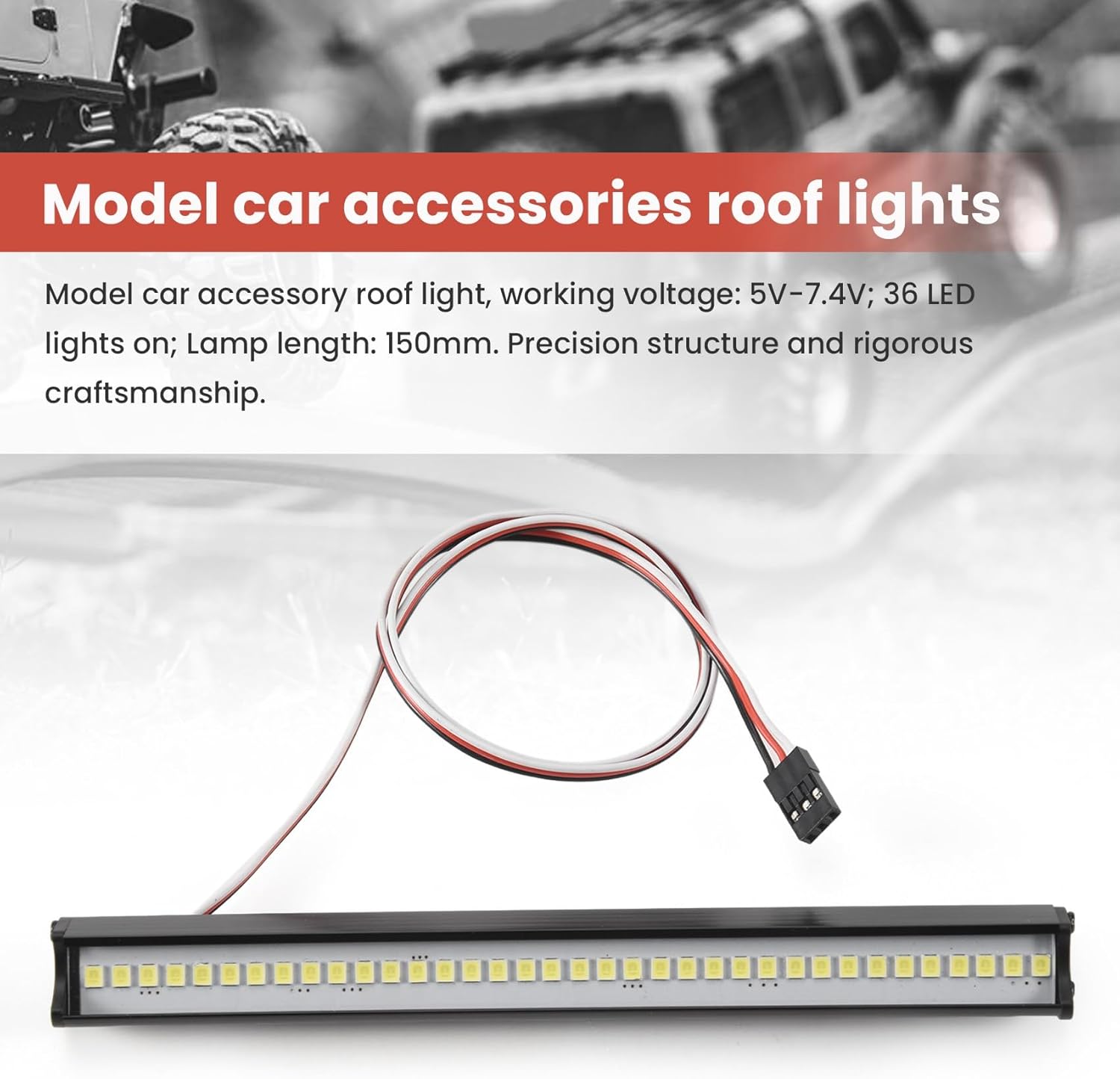 Accessori per barra luminosa RC fai-da-te super luminosi per scala 1/10 1/8, Slash, TRX4, Arrma Senton, Kraton, Axial SCX10, , , , Redcat ecc. Peso: 40 g Alimentato dal ricevitore (potrebbe richiedere il cavo JST Y); non collegare direttamente alle batterie Tensione di funzionamento: 5 V-7,4 V; 36 luci LED; Lunghezza luce: 150 mm Progettato per giocatori professionisti; Luce super brillante per rendere le tue corse RC fresche e attraenti