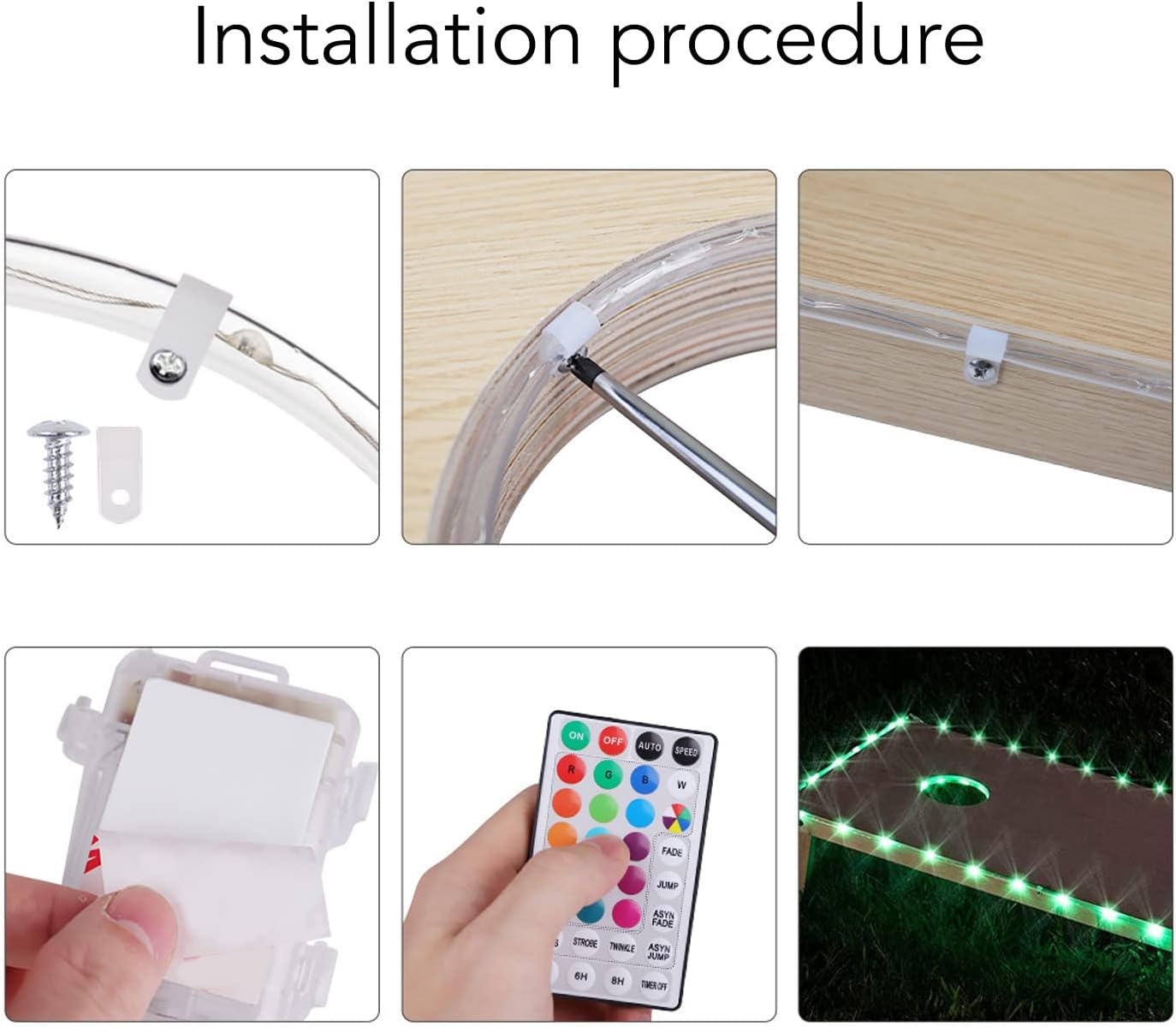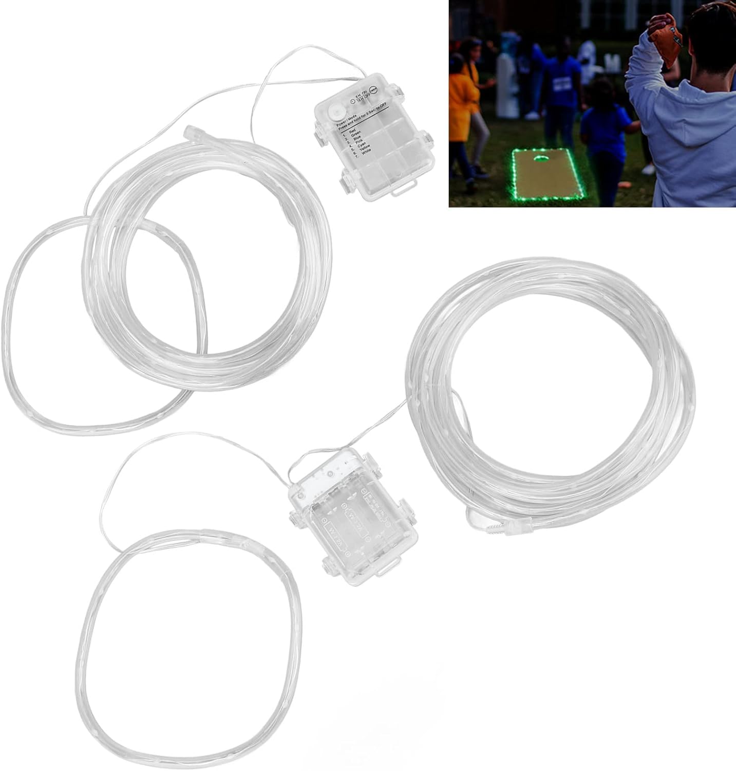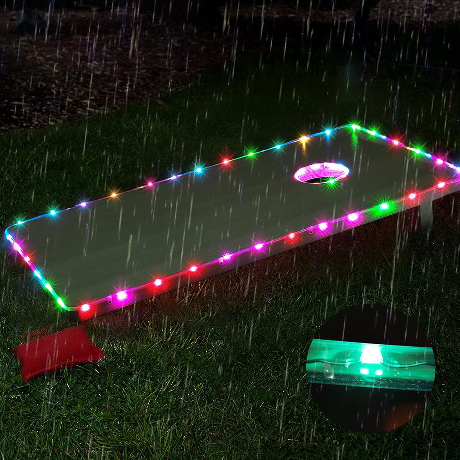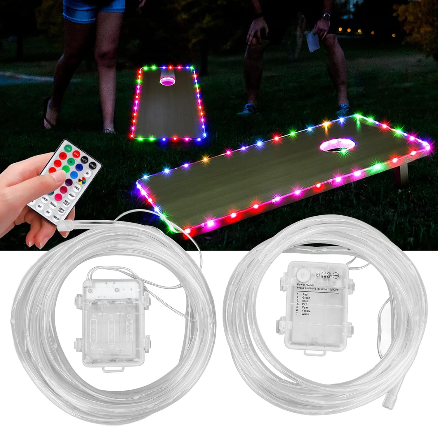 [Personalizza l'illuminazione] Scegli il tuo colore preferito per le luci a LED e trasforma la tua tavola da cornhole in una superficie di gioco colorata e attraente. [GIOCO NOTTURNO MIGLIORATO] Illumina il tuo gioco di cornhole con luci LED luminose, aumentando l'eccitazione di giocare al buio. [TELECOMANDO INTELLIGENTE] Cambia i colori senza sforzo con il telecomando a 32 pulsanti, offrendoti un comodo accesso a una varietà di opzioni di illuminazione. [CONFIGURAZIONE FACILE] Utilizza le Clamp/Holder e le viti incluse facile installazione attorno alla tavola per cornhole, garantendo un processo di assemblaggio rapido e senza problemi. [OPZIONI COLORE DINAMICHE] Scegli tra sedici diversi colori e motivi di luce per illuminare l' e il bordo del cornhole e rendere la tua serata di gioco indimenticabile.
