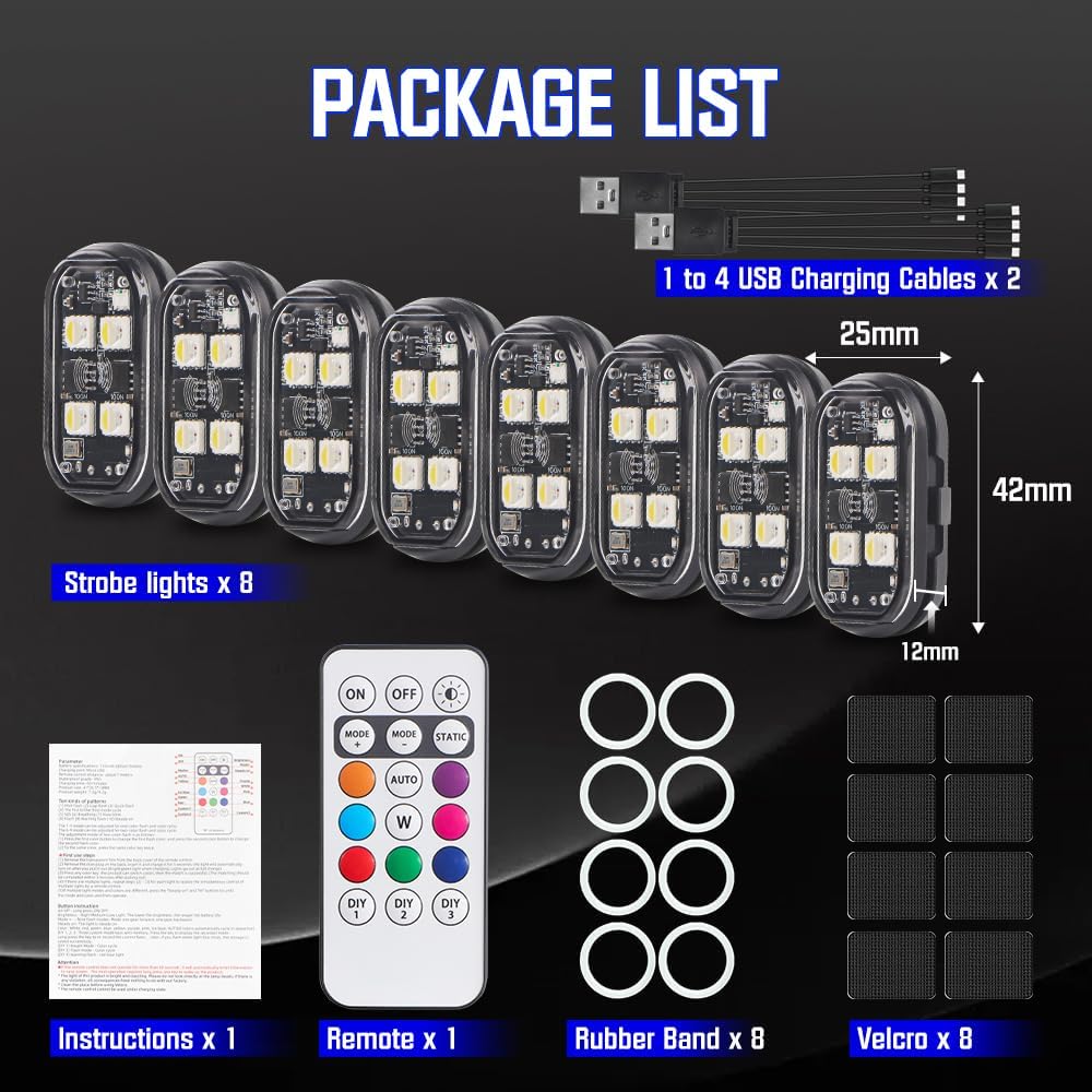 ★ 【Luminosità Regolabile e Ricaricabile USB】 Le nostre Luce stroboscopica del drone wireless 2025 recentemente aggiornate ognuna ha quattro perline a LED ad alta luminosità con 3 livelli di regolazione della luminosità: bassa, media e alta; Basta collegare la porta USB per 1 ora per caricare completamente; È facile da caricare, è possibile caricarlo con la banca di potenza, caricabatteria, caricabatteria per auto, computer desktop e così via. ★【Luminosità Regolabile e Ricaricabile USB】 Le nostre Strobe drone light forniscono 8 colori (bianco, rosso, verde, blu, giallo, rosa, viola, blu ghiaccio) e 10 modalità: statico, lampeggio rapido, respirazione, lampeggio di avvertimento, lampeggio lento e altro ancora. È possibile controllare vari modelli di lampeggio come le vostre esigenze, consentendo di regolare le luci per adattarsi a diversi umori e occasioni. È il miglior regalo che fai alla tua famiglia, parenti e amici ★ 【Progettazione Telecomando Wireless】 Le nostre luci a LED wireless per auto hanno un telecomando per cambiare facilmente il colore e la modalità entro 7 metri, con funzione di memoria. Riduci senza sforzo le modalità RGB, regola 8 temperature di colore e imposta gli effetti stroboscopici / solidi dal tuo sedile del conducente - luci LED wireless perfette per gli appassionati di auto che cercano un'atmosfera personalizzata. ★ 【Facile Installazione e Ampia Applicazione】 Le luci lampeggiantiauto condotte sono fatte di materiale impermeabile IP65 e sono dotate di una spina impermeabile per proteggere la porta di ricarica. Offriamo due metodi di installazione convenienti: velcro e anello in gomma. Queste luci dell'auto condotte interni con telecomando sono adatte a una varietà di veicoli come motociclette, droni, automobili, biciclette, barche, campeggio, illuminazione ambientale e decorazione di Halloween. ★ 【Design Resistente Alle Collisioni, Sicuro e Affidabile】La nostra luce stroboscopica anti-collisione a LED fatta di materiali ad alta resistenza e sottoposta a un trattamento speciale resistente alle collisioni, protegge efficacemente l'illuminazione dai danni anche in ambienti esterni complessi, aggiungendo uno spruzzo di colore al vostro veicolo garantendo al contempo sicurezza e affidabilità durante l'uso. ★ 【Metodo di attivazione】 Per attivare, caricare ogni luce strobo per 5 secondi, quindi scollegare il cavo. Premere e tenere premuto il pulsante "ON" sul telecomando per attivarlo. Questo deve essere fatto entro 1 minuto dall'arresto del cavo. 2. Il telecomando non può essere utilizzato durante la ricarica. 3. Non è possibile utilizzare la testa di ricarica rapida per caricare, è necessario utilizzare la normale testa di ricarica 5V 1A.