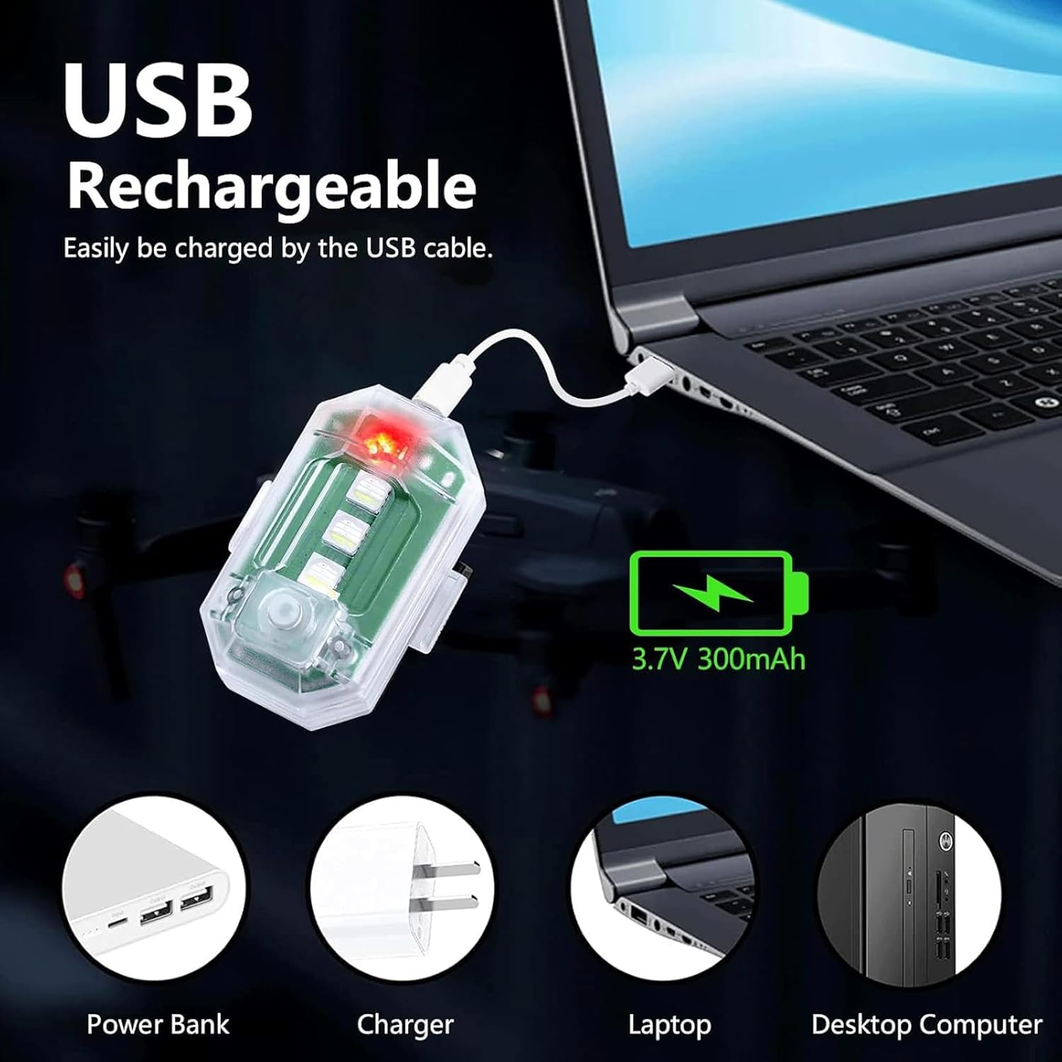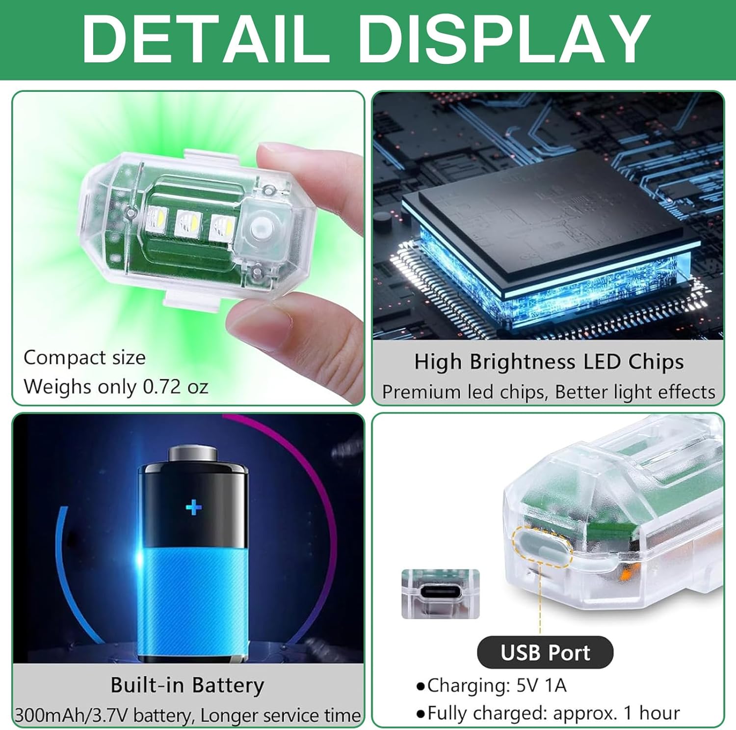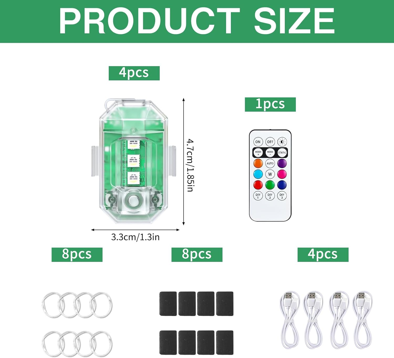 Luce Flash Con Telecomando: Le nostre luci flash a LED sono dotate di un telecomando per cambiare facilmente colore e modalità entro 7 metri, con funzione di memoria. Hai a disposizione 8 colori e diverse modalità: flash di navigazione; flash stroboscopico; flash dell'aereo; luce flash SOS rapida; Luce lampeggiante, luce fissa e altre modalità. È possibile controllare a distanza diversi colori e modalità a seconda delle necessità Materiale Di Alta Qualità: Lo stoppino con i suoi colori vivaci attira l'attenzione, basta collegarlo a una porta USB per una ricarica rapida. Si ricarica completamente in 1,5 ore. Dura più di 6 ore in modalità flash e 10 ore nella modalità che consuma più energia. Ad esempio, luce rossa 2 ore e luce bianca 4 ore. La durata effettiva può variare a seconda della modalità Impermeabile: Le nostre luci lampeggianti sono testate per l'impermeabilità. Sono adatte a tutte le condizioni atmosferiche, ma si prega di non lasciarle in acqua per troppo tempo. Per garantirne la longevità, proteggete le vostre luci lampeggianti dall'acqua pesante. Godetevi la sicurezza e la visibilità che offrono Facile Da Usare: Il design leggero e compatto consente una facile trasportabilità, così puoi portarlo ovunque. Due comodi metodi di installazione: velcro e anello di gomma. La torcia ricaricabile può aiutarti notevolmente a identificarti di notte o nella nebbia per garantire la sicurezza Ampia Applicazione: Le luci anticollisione sono adatte per droni, skateboard, campeggio, pesca, escursionismo, ecc. In situazioni di illuminazione insufficiente, può essere utilizzato come luce notturna per fornire illuminazione e sicurezza per te stesso e per gli altri