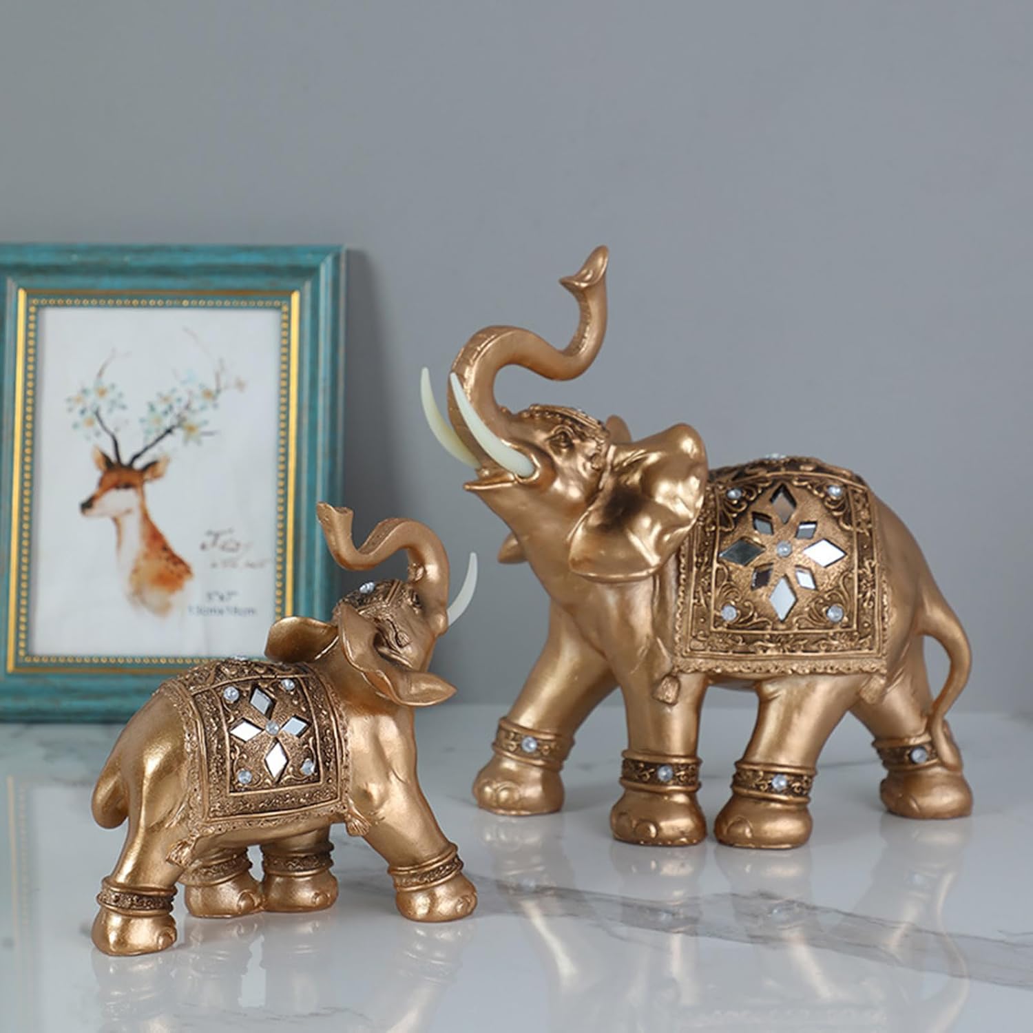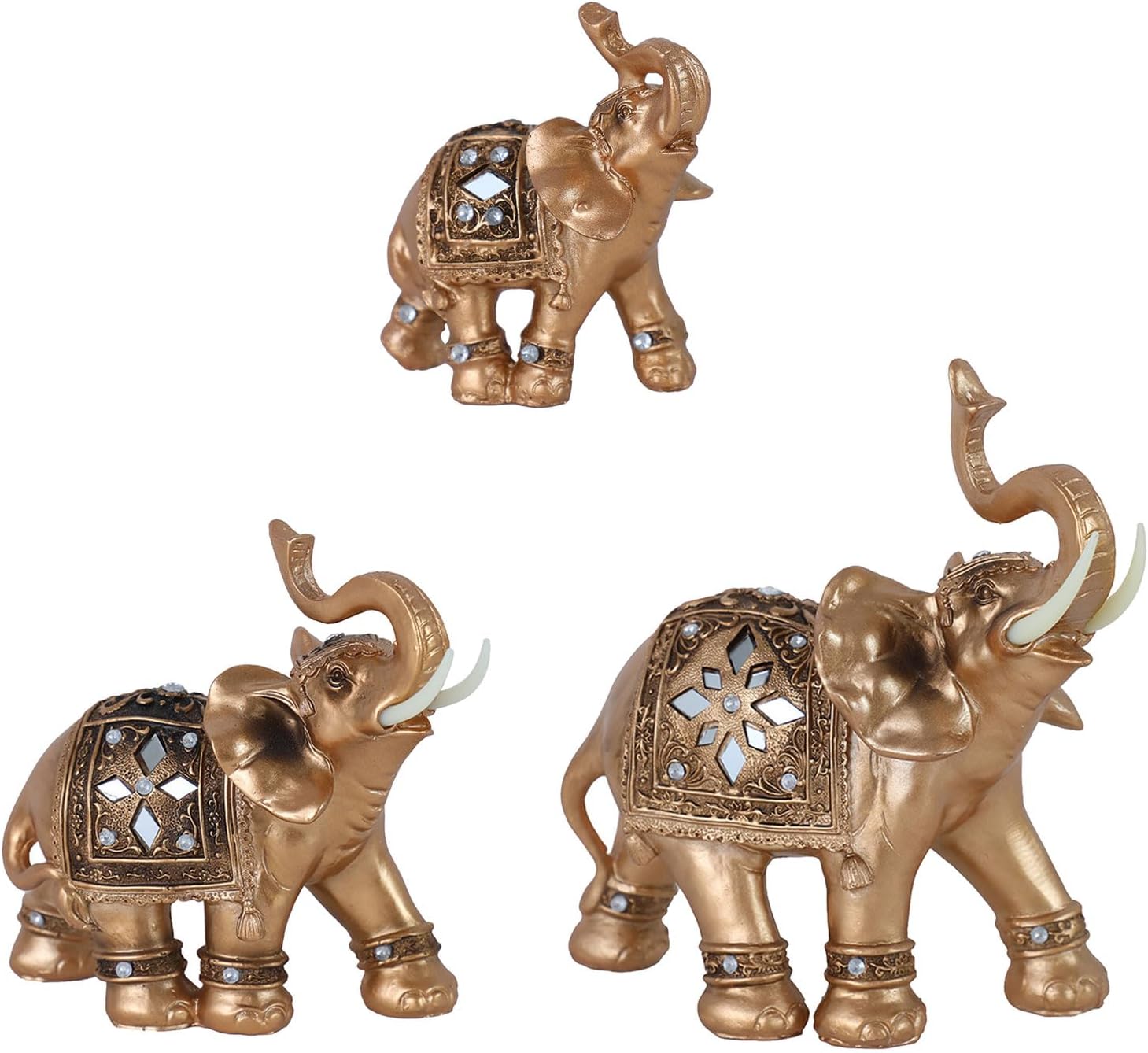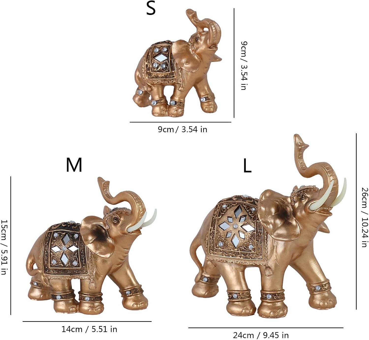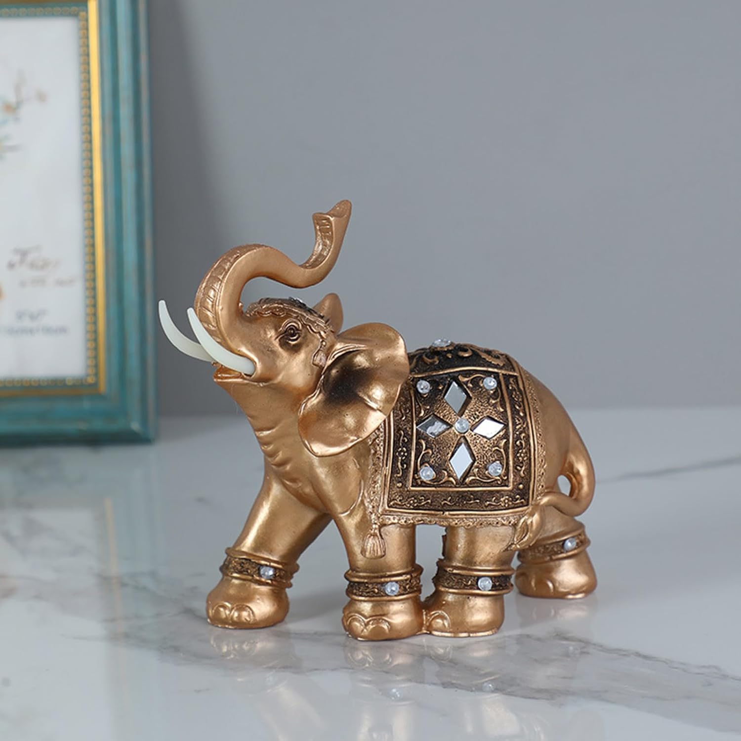 Il fai da te con dettagli in resina e oro questa statua Feng Shuis Elephant simboleggia saggezza e prosperità e funge da elegante "decorazione per la casa" e "ornamento felice" per la stanza La statuetta presenta una posizione del bagagliaio per ottenere il successo, con la costruzione di durata, trama dei dettagli e ispirazioni antiche di uomini artigianali ideali per "prosperità decorazione domestica Perfetto per gli appassionati di Feng Shui, interior designer o regalo che vogliono dare un tocco positivo a soggiorno, ufficio o camera da letto con decorazioni simboliche Presenta in modo prominente vicino agli ingressi per accogliere la ricchezza, alle scrivanie per migliorare la messa a fuoco, o accanto ai letti come un rilassante decorativo in ambienti residenziali o di lavoro Il suo design versatile si fonde perfettamente con l'estetica moderna e tradizionale e lo rende un ricordo significativo per inaugurazioni domestiche, matrimoni o celebrazioni culturali