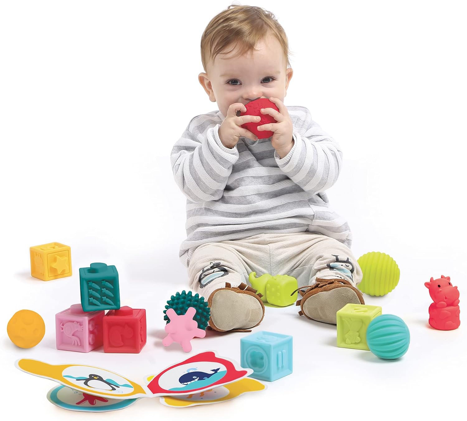 Palline sensoriali di diverse misure e con diverse trame per offrire maggior esperienze sensoriali Pallina di diametro 15 cm con punte morbide in rilievo ideali per massaggiare il bambino Palline di diametro 8cm vellutate per trame e disegni diversi Facilmente pulibile con un panno umido