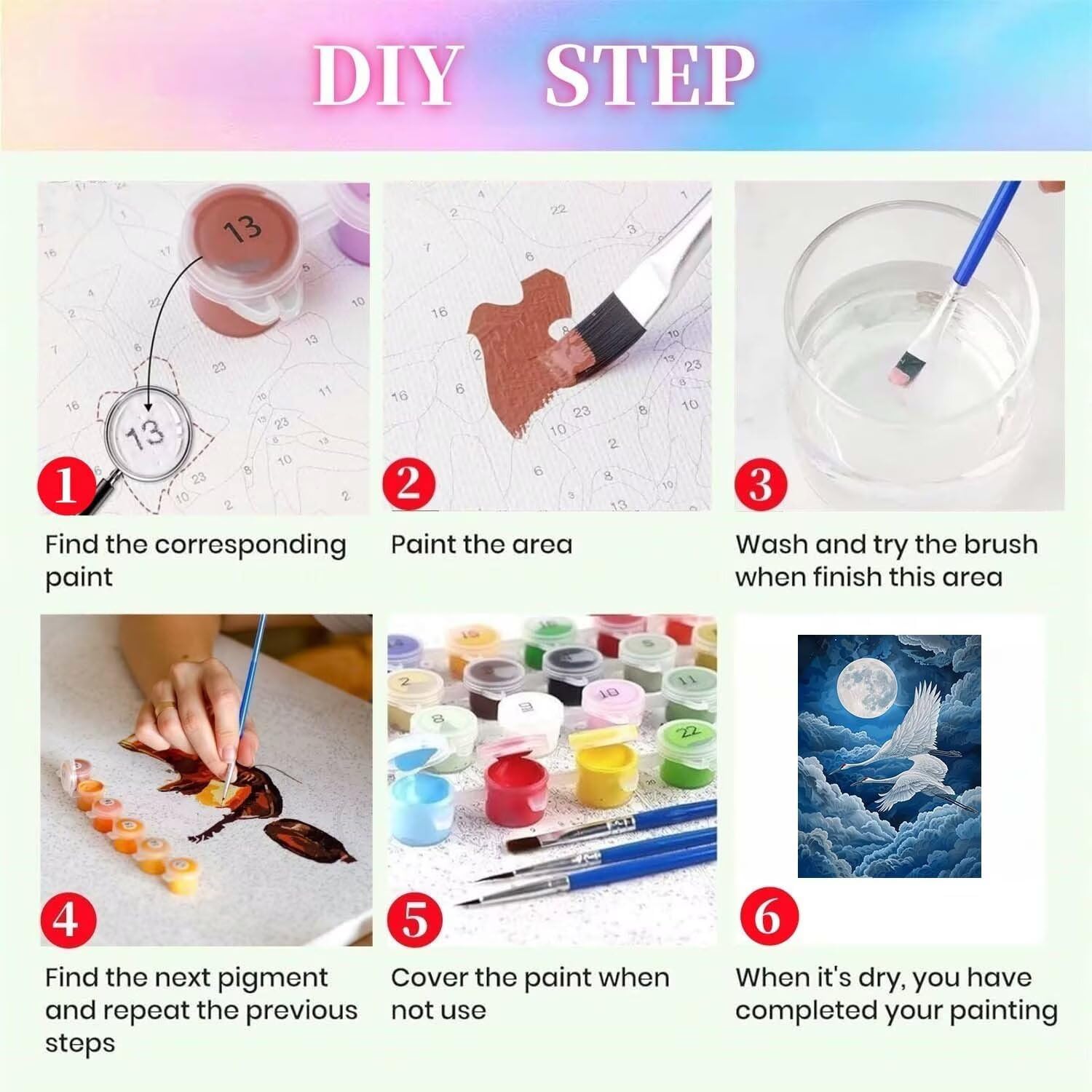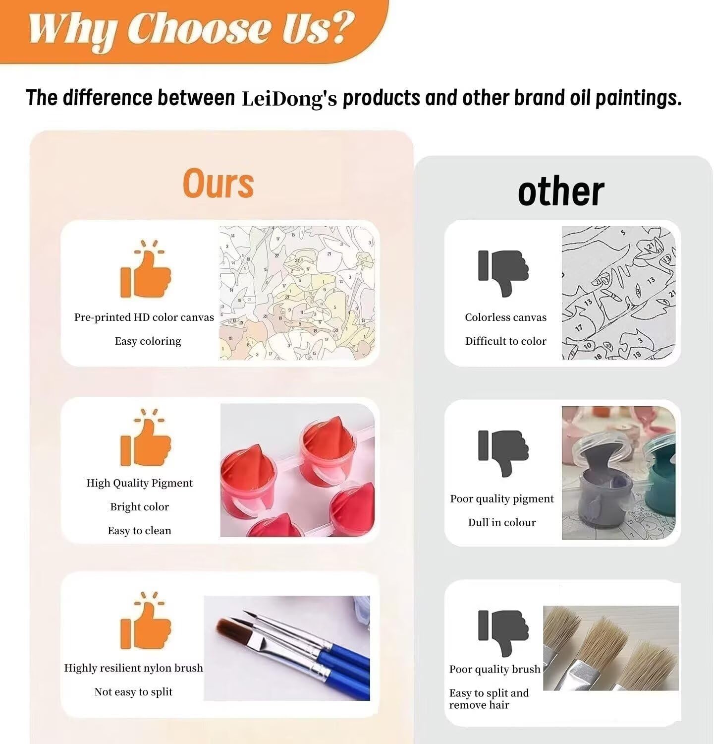 Kit di Dipingere con i Numeri – I kit di pittura con i numeri includono tela prestampata(Senza Cornice), 1 set di colori acrilici, 3 pennarelli per pittura, 2 ganci metallici e viti Kit di Dipingi con i Numeri – Che tu sia un principiante o un artista esperto, il nostro kit di pittura con i numeri rende la pittura facile e divertente. Basta abbinare i numeri sulla tela con i colori corrispondenti e dare vita alla tua opera d'arte! Painting by Numbers Kits – La nostra tela è spessa e resistente, offrendo un'eccellente superficie di pittura. I colori acrilici sono vivaci, ecologici e forniscono una copertura completa. I pennelli di alta qualità consentono una pittura dettagliata e senza sforzo. Ottimo per l'arredamento della casa e come regalo – Esponi la tua opera d'arte finita nel tuo soggiorno, camera da letto, ufficio o qualsiasi spazio che necessiti di un tocco creativo. Questo kit è anche un regalo premuroso e unico per gli amanti dell'arte, gli hobbisti e gli appassionati del fai da te. Sollievo dallo stress e aumento della creatività – La pittura è un ottimo modo per rilassarsi, migliorare la concentrazione e aumentare la creatività. Prenditi il ​​tuo tempo, goditi il ​​processo e assapora la gioia di creare il tuo capolavoro!