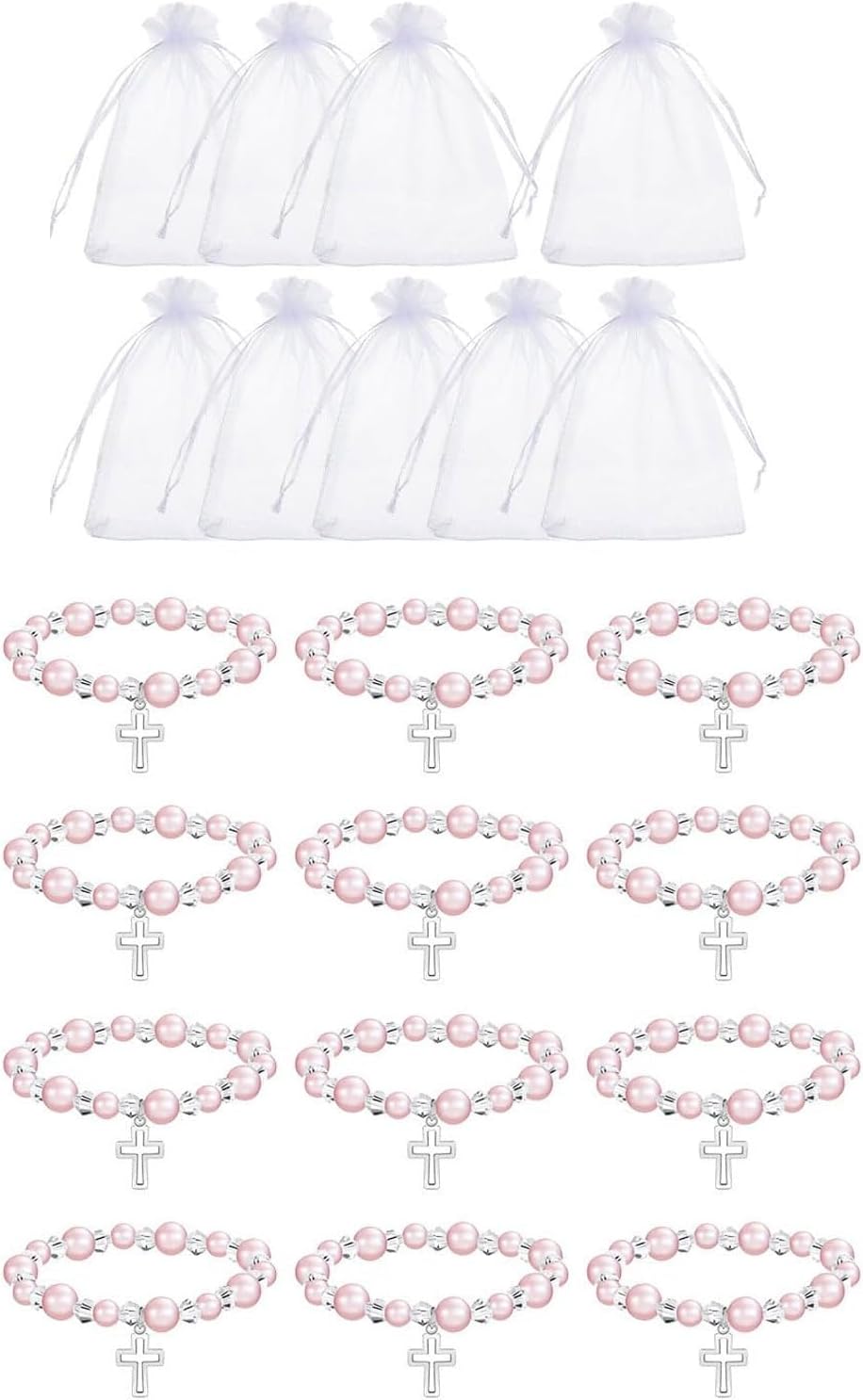 LUOFENG Confezione da 12 eleganti braccialetti rosa con perle finte a forma di crocifisso, per battesimo, matrimonio, bomboniere, con sacchetti in organza