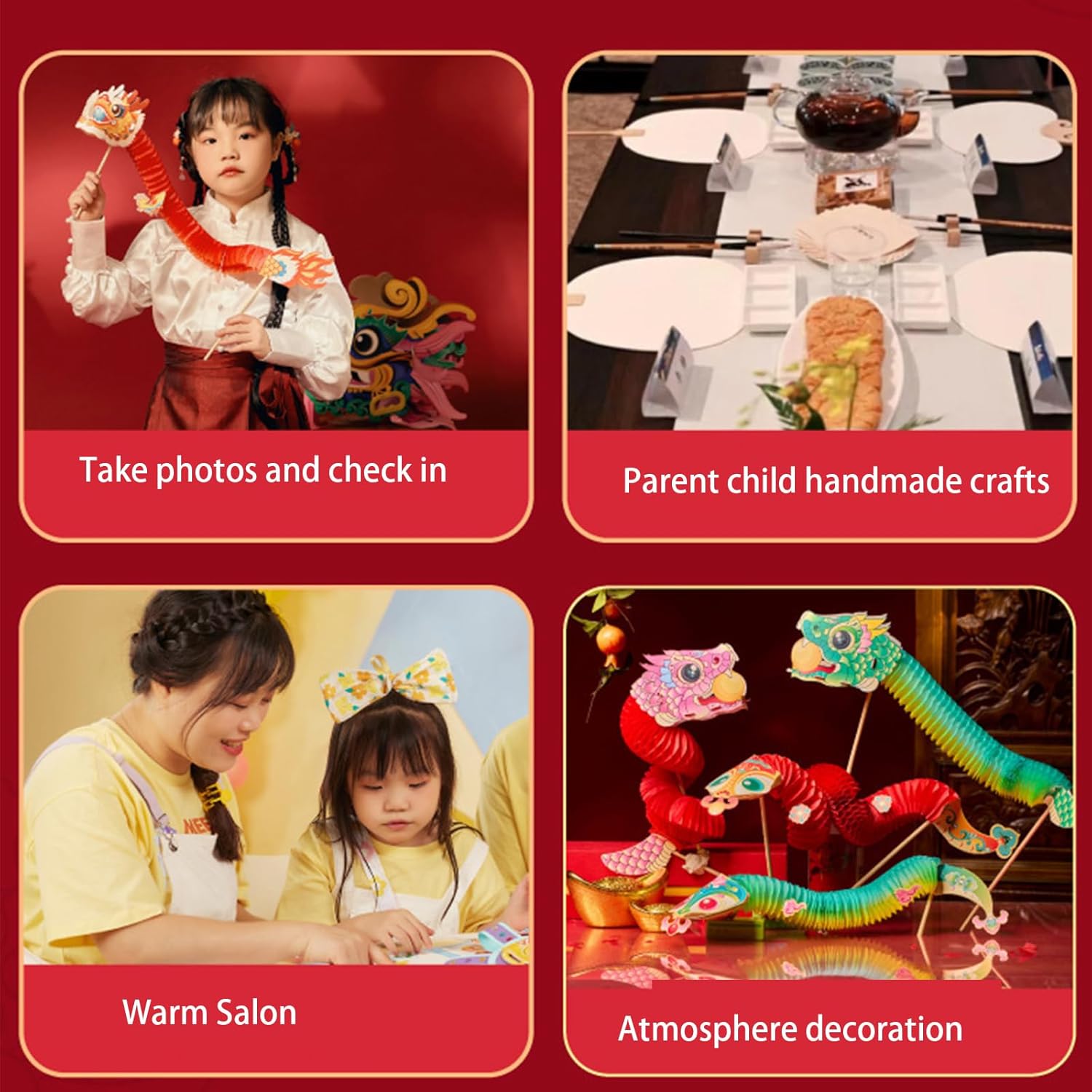 Scatena la tua creatività e immaginazione con questo set di burattini di carta drago 3D, un giocattolo interattivo 3D che dà vita alla tradizionale danza del drago. Realizzato in legno e carta, questo set di marionette cinesi di carta fatte a mano è facile da assemblare e consente varie trasformazioni di forma, aumentando il divertimento e la sfida. Molto adatto a bambini dai 3 anni in su e agli adolescenti, in particolare a coloro che sono interessati all'artigianato tradizionale cinese fatto a mano o alle persone che desiderano sviluppare la coordinazione occhio-mano e la pazienza. Ampiamente usato per giochi di interazione genitore-figlio, scuola, scuola materna, lezioni di artigianato, Festival di primavera cinese ed è un ottimo regalo di compleanno o una ricompensa di gioco, offrendo ore di divertimento artigianale. Questo set unico di pupazzi di drago funge non solo da giocattolo educativo ma anche da delizioso oggetto di scena per giochi di ruolo, oggetti di scena fotografici e decorazioni per il Festival di Primavera cinese, costituendo un'aggiunta accattivante a qualsiasi collezione di giochi creativi.