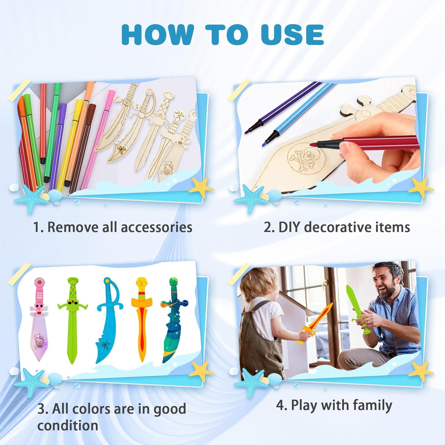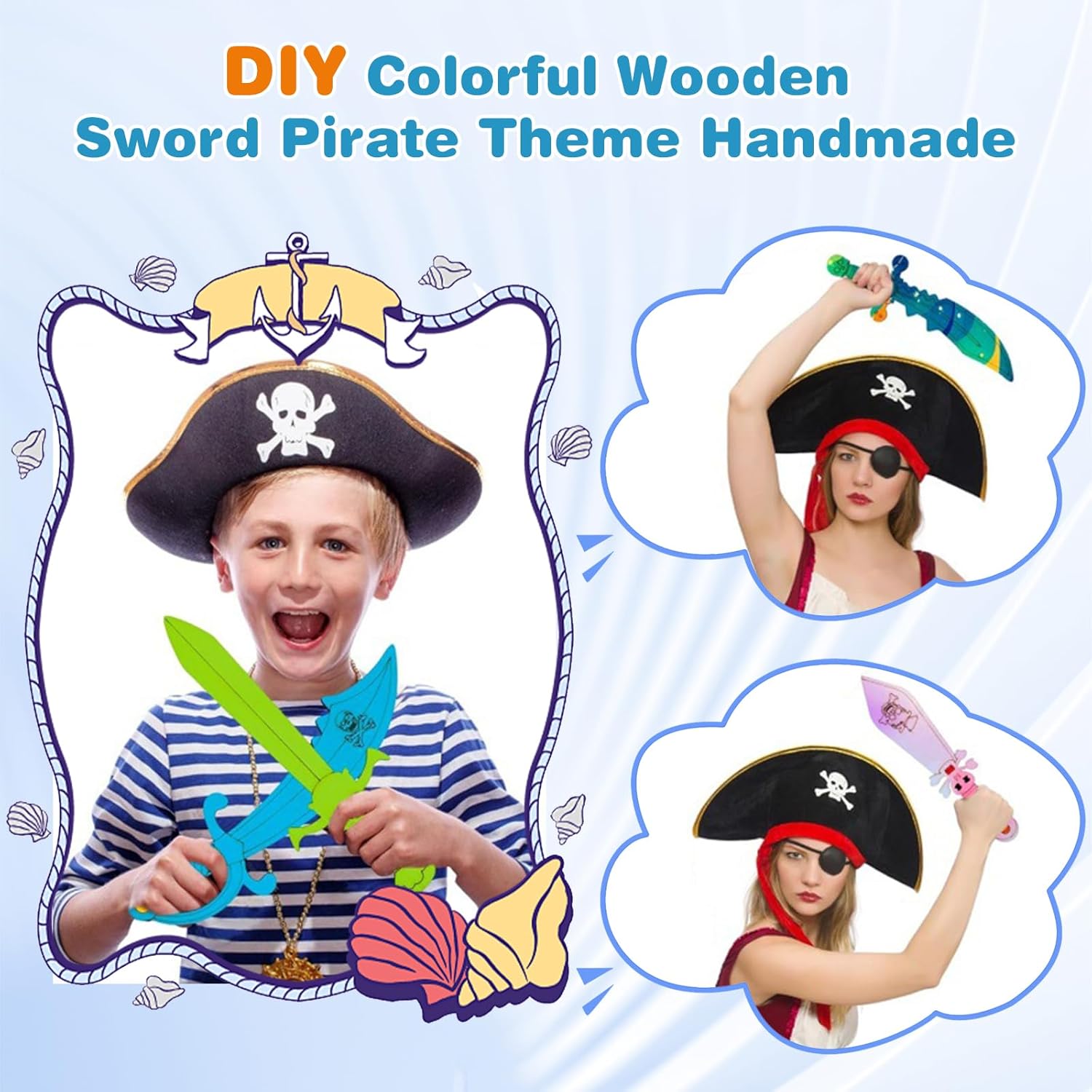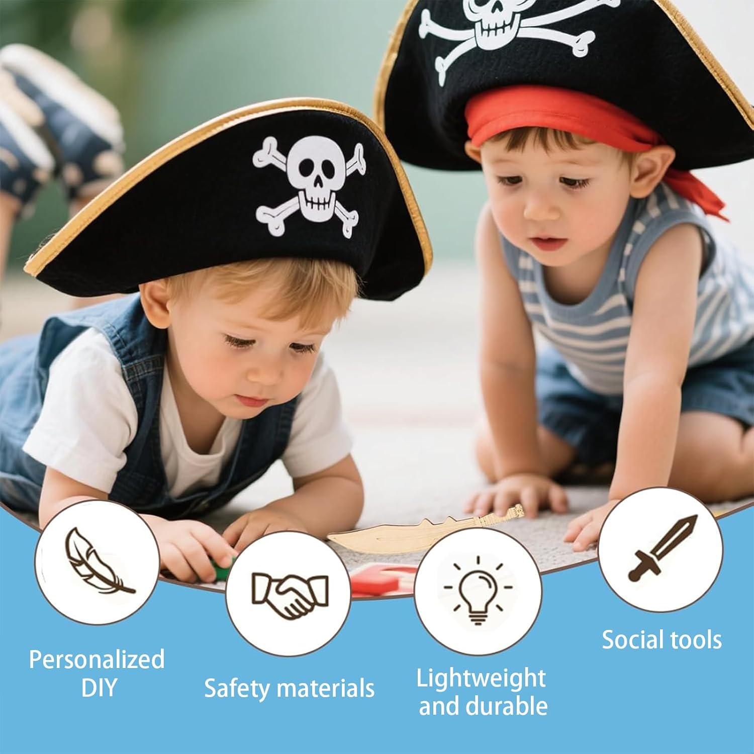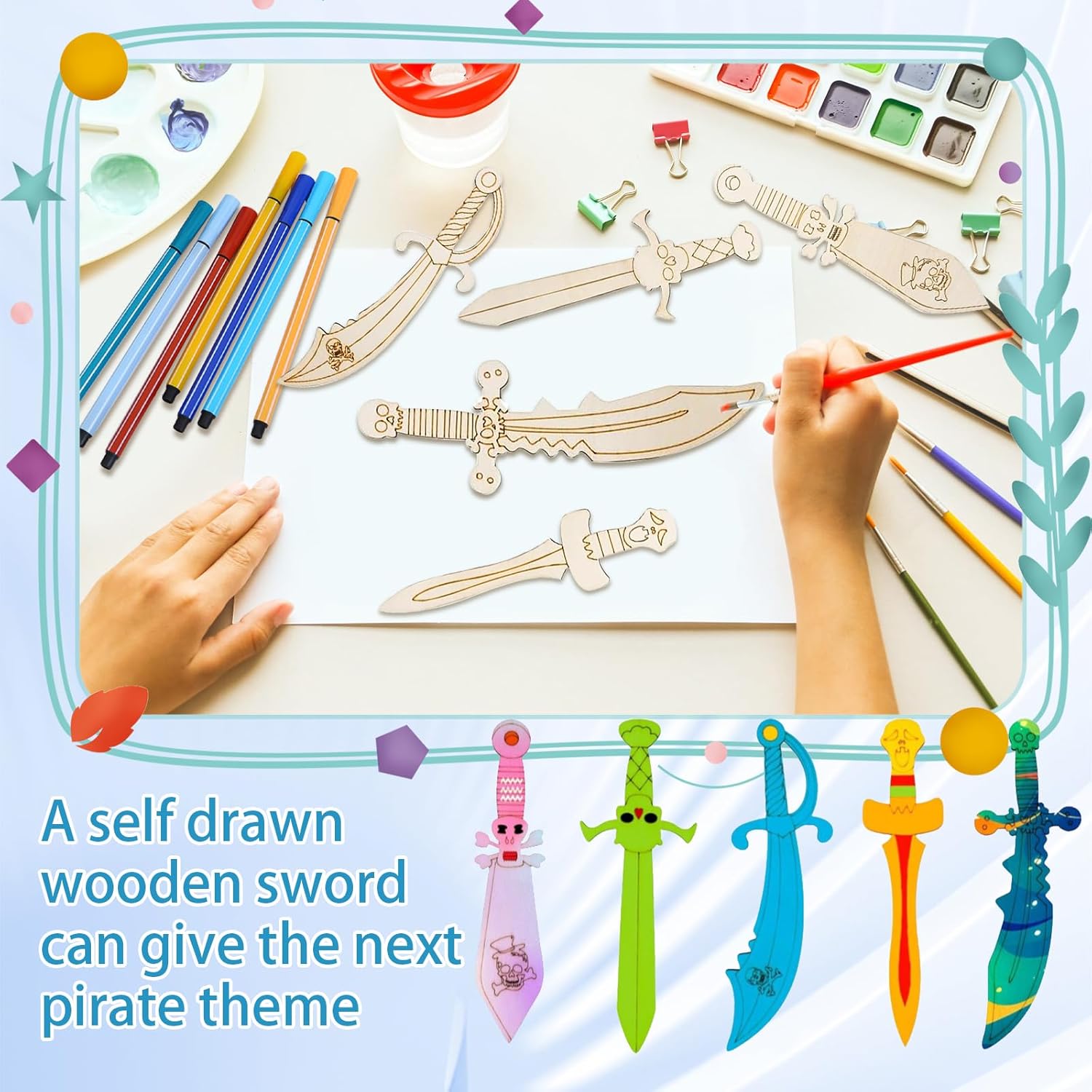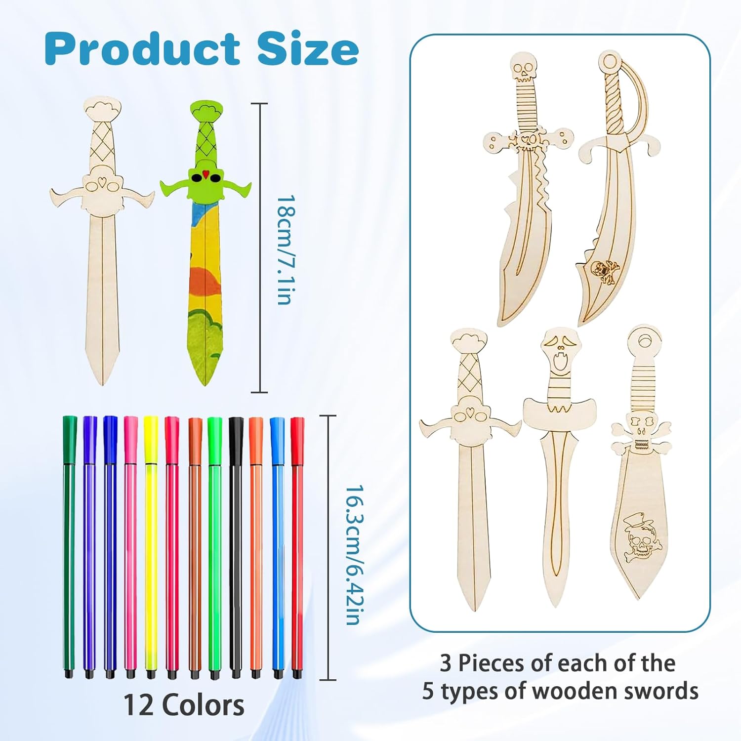 Contenuto: Questo set creativo contiene 15 spade pirata in legno in 5 design (circa 18 x 4 cm) e 12 pennarelli in colori assortiti (15 cm). La loro superficie in legno naturale è ideale per dipingere e decorare. Ricchi di stile e quantità, sono perfetti per progetti creativi fai da te con i bambini. Materiali di alta qualità: Qualità e sicurezza sono le nostre priorità! Queste spade pirata sono realizzate in legno massello non trattato e sono piacevoli al tatto. I pennarelli inclusi sono atossici e sicuri per i bambini. I tuoi bambini potranno dare libero sfogo alla loro creatività in tutta tranquillità. La vernice è facile da applicare e si asciuga rapidamente, permettendoti di ammirare subito queste piccole opere d'arte. Esperienza creativa fai da te: Queste spade pirata dipingibili ti permettono di creare opere d'arte uniche. Classiche o colorate, i design creativi delle sciabole pirata stimolano l'immaginazione. Anche i principianti possono creare risultati sorprendenti con questo set di spade in legno per bambini. Ideale per una festa a tema pirata: personalizza la tua prossima festa di compleanno per bambini a tema pirata con spade di legno dipinte a mano! Queste piccole spade possono essere utilizzate come decorazioni da tavola, distribuite ai piccoli ospiti o regalate come bomboniere. I bambini adoreranno creare le proprie spade e immergersi in fantasiose avventure piratesche. Un'attività creativa e indimenticabile per qualsiasi festa di compleanno per bambini! Versatile: questo kit per la creazione di spade pirata è ideale per feste di compleanno per bambini a tema pirata, progetti scolastici, attività in classe e laboratori artigianali. È anche un ottimo regalo per Natale, Halloween, compleanno o Pasqua, per giochi di ruolo fantasiosi e come accessorio per costumi.