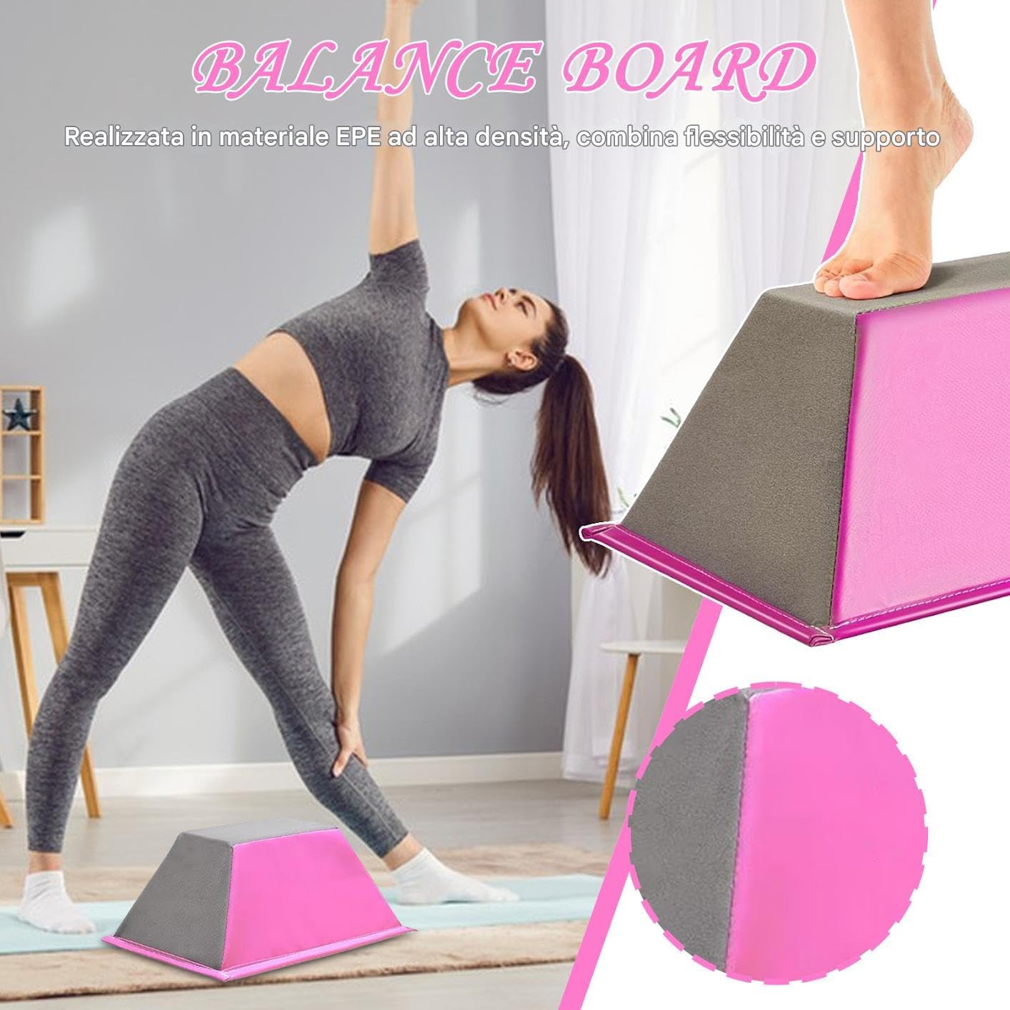 Design Compatto: Grazie al design continuo anti-accumulo, i Cheer si mantengono senza sforzo con un panno umido e salvano spazio per un'organizzazione pratica. Ampia Applicabilità: Abilitano routine yoga base e avanzato sviluppo 'equilibrio, ideali per casa o assistenza al recupero con ingombro minimo Ammortizzazione Resistente: Design con EPE ad alta densità bilancia ammortizzazione leggera e supporto efficace, mantenendo la forma nel e garantendo comfort duraturo senza deformazioni Superfici Antiscivolo: La texture in rilievo e la struttura scanalata sul fondo aumentano l'attrito, prevenendo scivolamenti e garantendo prestazioni affidabili su qualsiasi superficie Strumento Stabilità: Design trapezoidale scientifico garantisce stabilità elevata, con piani inclinati angolati che migliorano efficacemente l'equilibrio durante l'allenamento