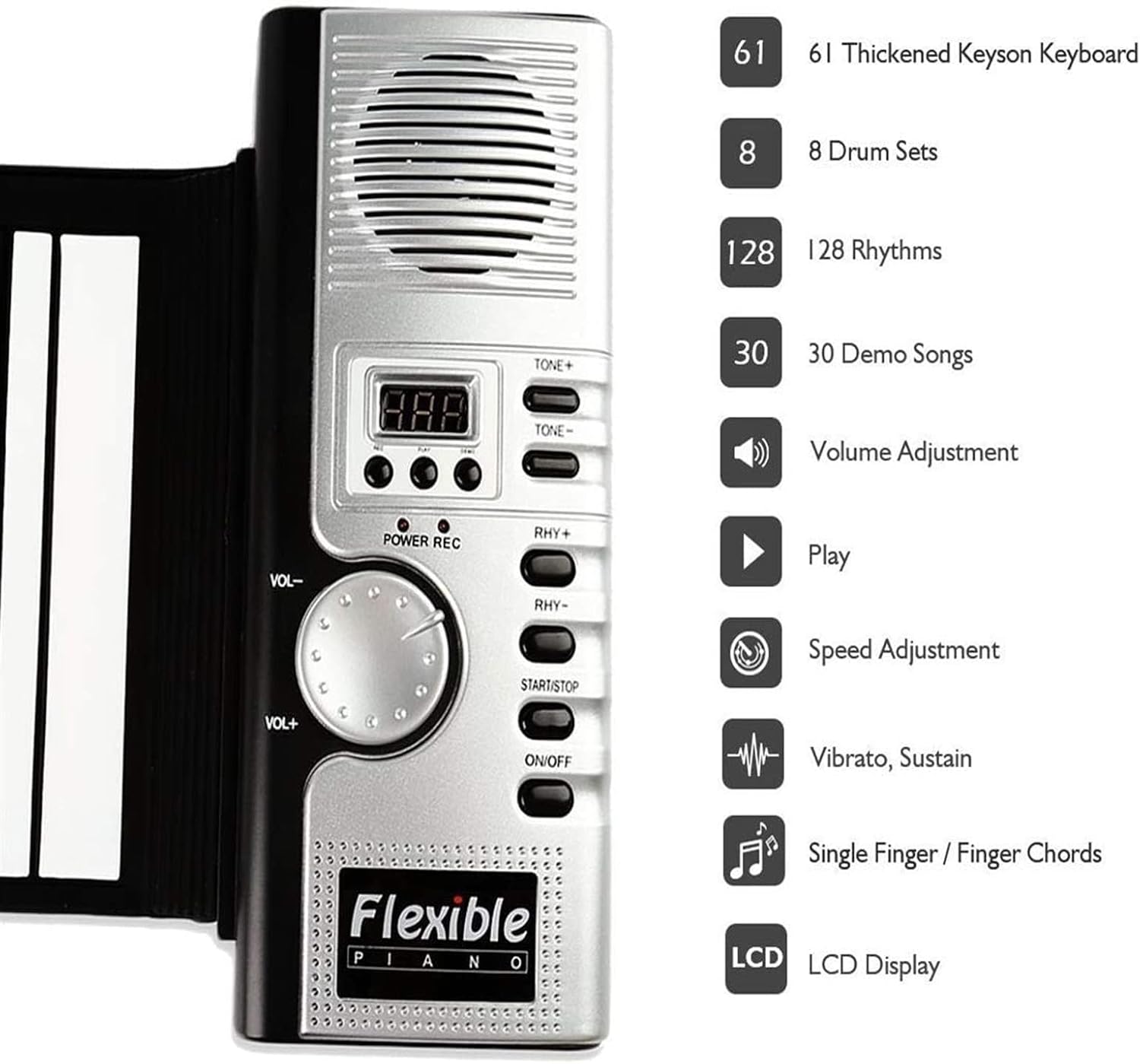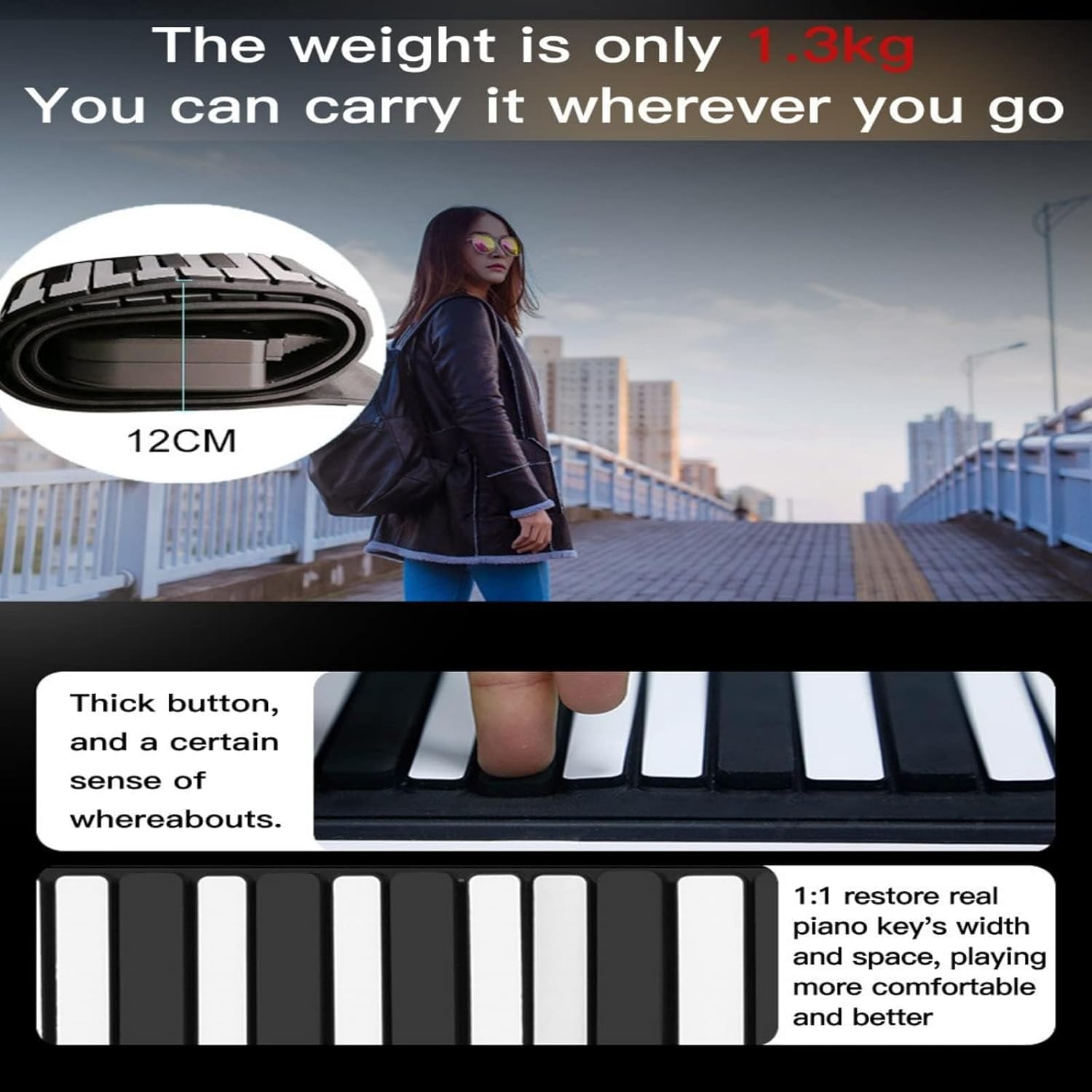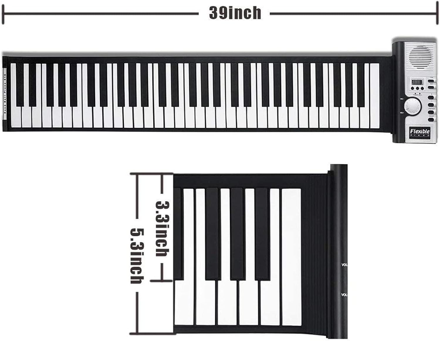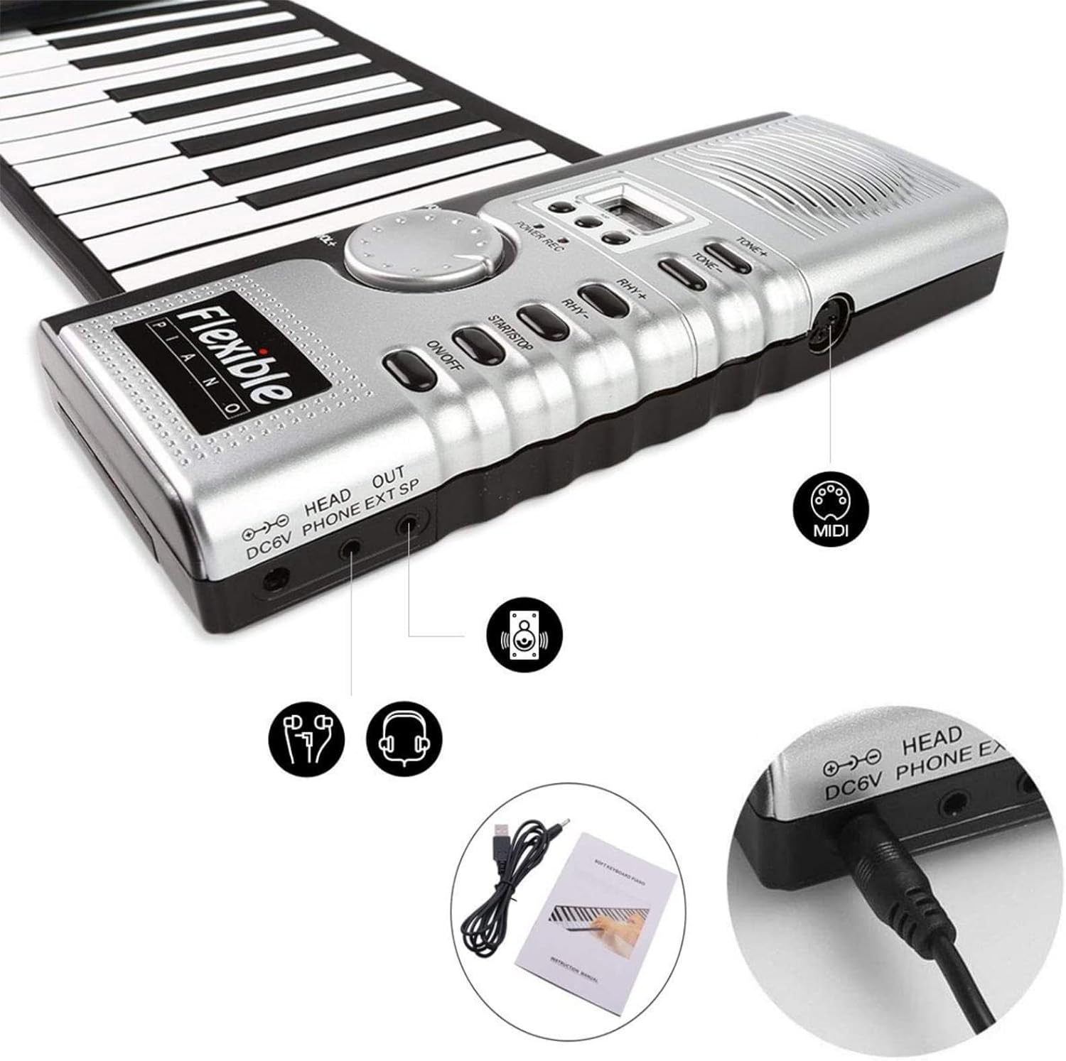Nuovo di zecca e suono nitido: abbiamo aggiornato il nostro pianoforte in base al feedback dei clienti. Ora, questo pianoforte a 61 tasti suona in modo molto nitido e vivace, facendoti sentire come un vero pianoforte. Perfetto per bambini/adulti. Multifunzionale: 128 suoni sintetici diversi, altoparlante integrato, uscita MIDI USB, suono standard internazionale, 100 ritmi diversi da riprodurre, 40 brani demo disponibili e la più recente tecnologia di chip MIDI. Il miglior regalo: piccolo, arrotolabile, facile da trasportare, così puoi esercitarti con le dita sempre e ovunque. Uno strumento divertente che puoi usare per far amare la musica ai bambini. Regala subito ai tuoi amici e bambini un bel regalo di Natale o di compleanno. Alta qualità: questa porta a rulli standard a 61 tasti è di alta qualità con tastiera in silicone ambientale, non tossica, resistente all'usura, morbida e durevole e ha ottenuto la certificazione di qualità del prodotto FCC. Design adatto: dimensioni 89 cm x 17 cm x 0,7 cm, può essere alimentato tramite adattatore DC 5 V e 4 batterie AA (non incluse), con un tempo di riproduzione fino a 12-15 ore.