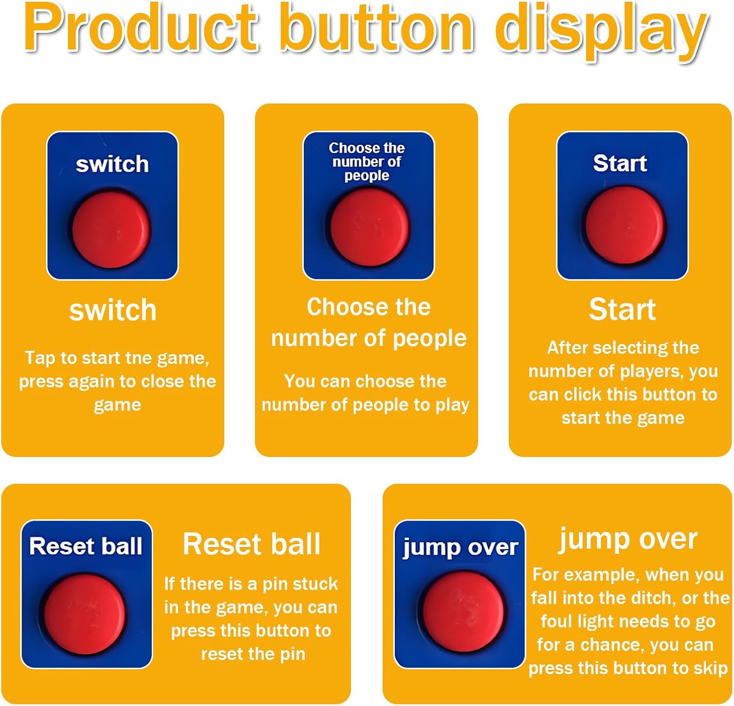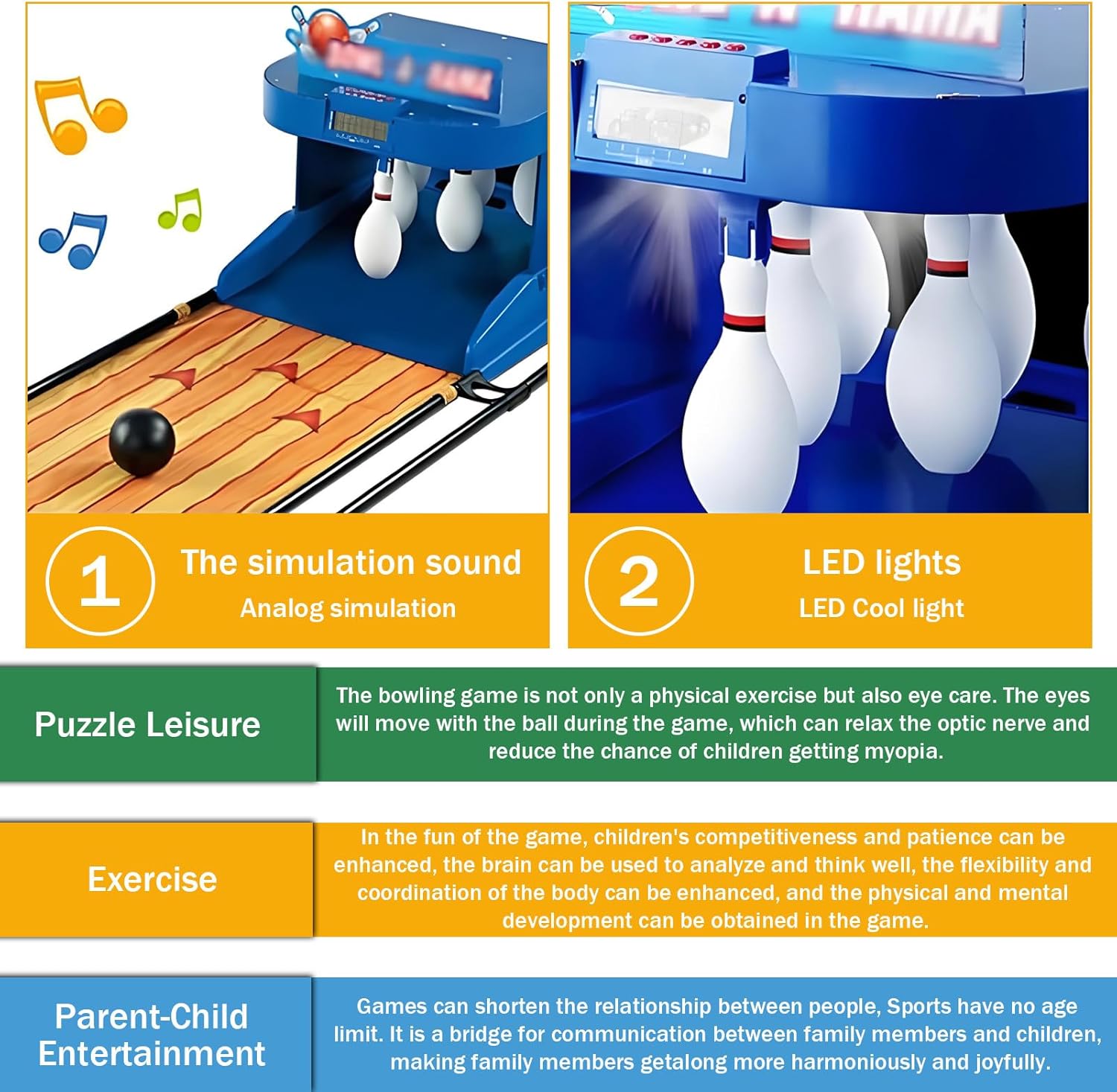 【BOWLING ELETTRICO】Realizzato in plastica atossica di alta qualità e componenti elettronici robusti, questo set da bowling è sicuro per bambini dai 6 anni in su. Il set da bowling include 6 birilli in plastica e 2 palle da bowling. I birilli e le palle da bowling sono realizzati in plastica di alta qualità, atossica e sicura per i bambini. 【PUNTEGGIO ELETTRONICO E RESET AUTOMATICO DEI BIRILLI】Il tabellone segnapunti a LED integrato tiene traccia automaticamente del punteggio dopo ogni lancio. I birilli si resettano con un suono realistico per un'esperienza più coinvolgente. Consiglio: evitare di lanciare la palla quando la luce di reset è accesa per garantire il corretto funzionamento. 【FEEDBACK REALISTICO DEL COLPO】Simula il peso e il movimento reali delle palle da bowling con prestazioni di rotolamento fluide. Goditi un feedback realistico del colpo ogni volta che colpisci i birilli. La corsia di ritorno curva assicura che la palla scivoli indietro senza sforzo. Facile da piegare e riporre quando non in uso. 【FACILE DA INSTALLARE】Set da bowling elettrico portatile per uso domestico, che semplifica e velocizza l'installazione del gioco, simula bene il peso relativo della palla ed è abbastanza scorrevole da poter essere ripiegato quando non in uso, senza lasciare angoli. 【DIVERTIMENTO INTERATTIVO PER TUTTA LA FAMIGLIA】Goditi il momento di creare un legame tra genitori e figli con questo gioco di bowling elettronico interattivo. Supporta sia la modalità a 1 giocatore che a 2 giocatori: basta premere un pulsante per iniziare! Perfetto per giocare al chiuso e rafforzare i legami familiari attraverso una competizione amichevole.