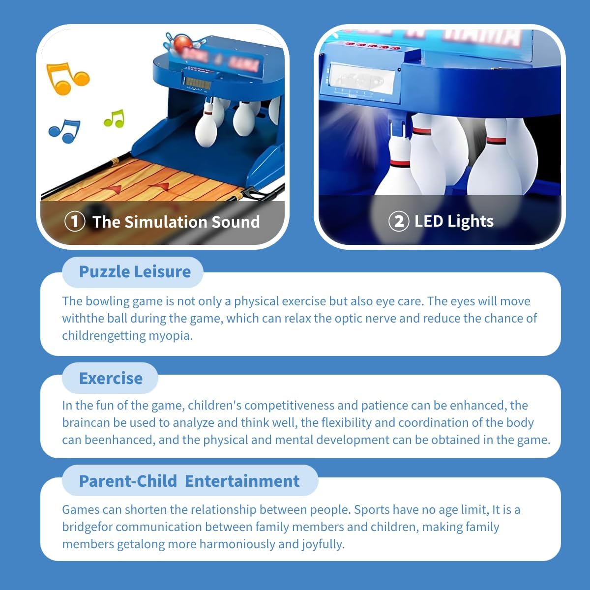 【Bowling elettronico per interni】Questo set da bowling è dotato di ritorno automatico della pallina e punteggio. È alimentato a batteria e facile da usare, e include 6 birilli e 2 palline, entrambi in plastica, il che lo rende adatto ai bambini. 【Punteggio elettronico automatico】Supporta il gioco interattivo per uno o due giocatori, con un tabellone segnapunti elettronico a LED che registra automaticamente il punteggio. 【Ritorno automatico della pallina】Quando la pallina viene lanciata sui birilli, questi tornano automaticamente nella loro posizione originale con un suono simulato di ritorno, rendendo il gioco più realistico e pratico. 【Intrattenimento genitori-figli】Il bowling è divertente, competitivo e basato sulle abilità, avvicinando le persone. Funge da ponte per la comunicazione tra famiglie e bambini, promuovendo armonia e felicità. 【Installazione semplice】Questo set da bowling elettrico portatile e di grandi dimensioni, perfetto per l'uso familiare, consente un'installazione di gioco rapida e semplice, simula accuratamente il peso delle palline e si ripiega per risparmiare spazio.