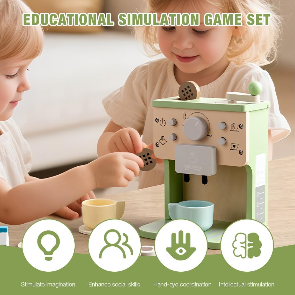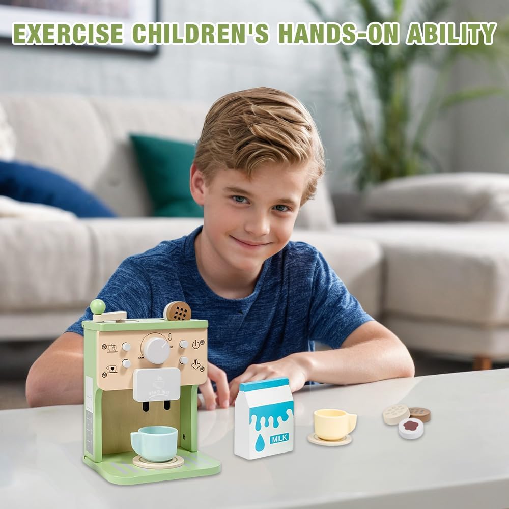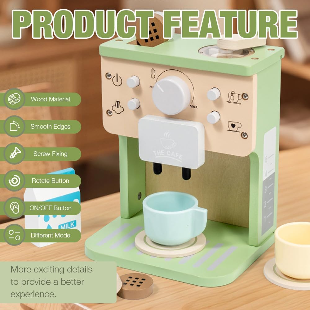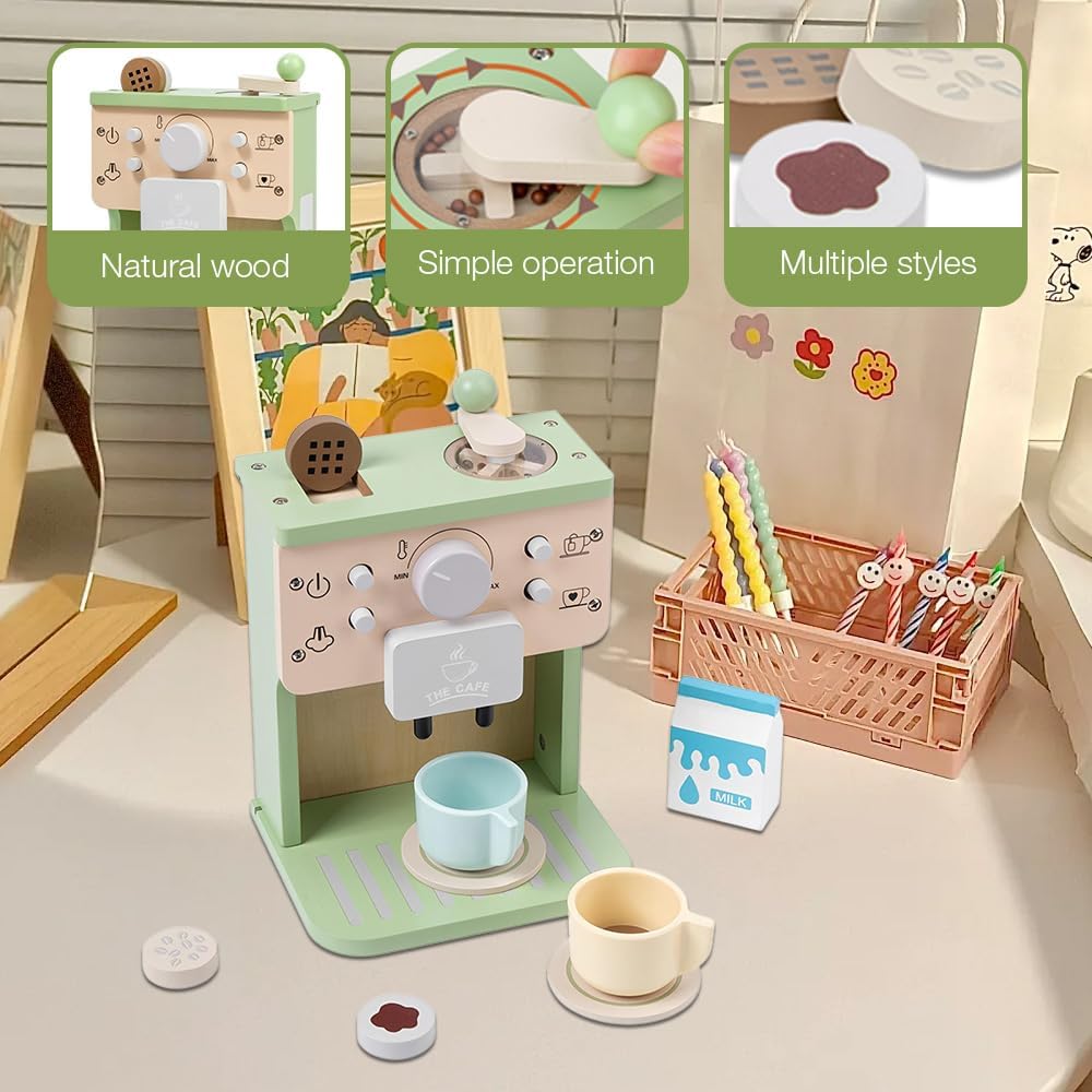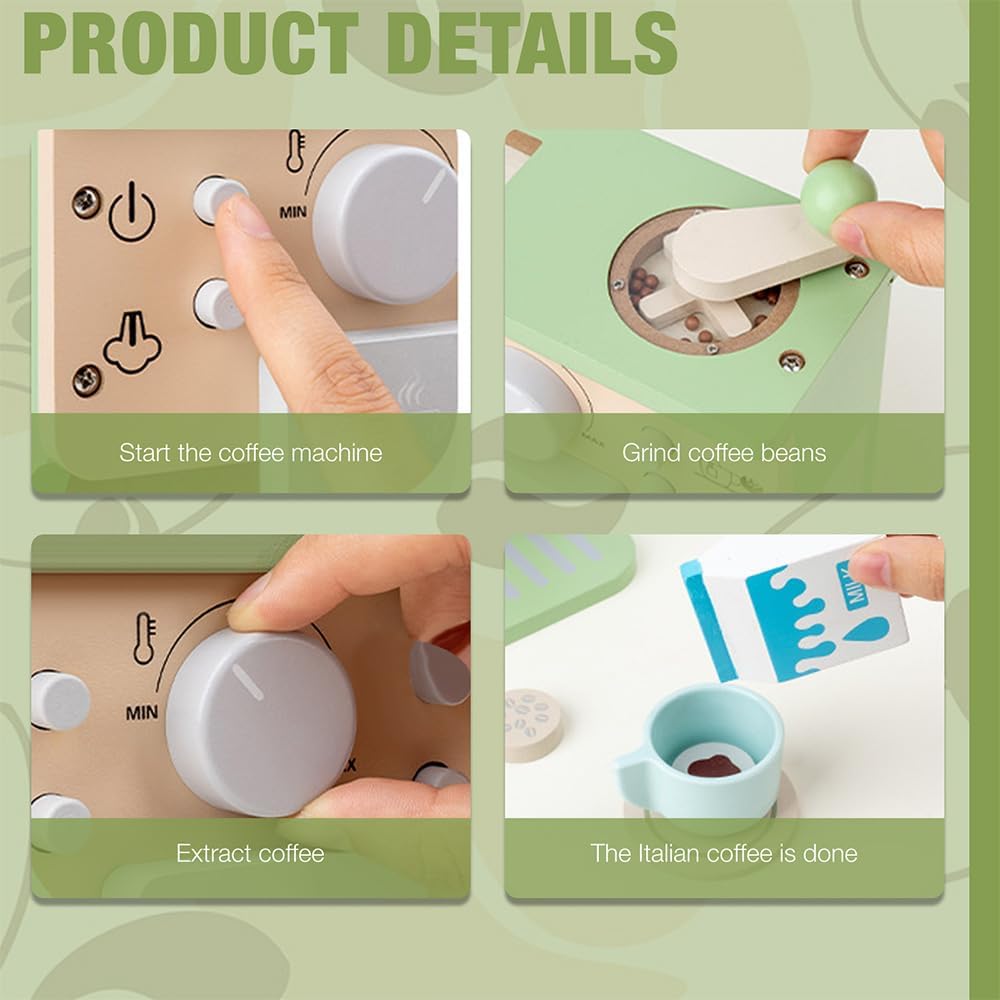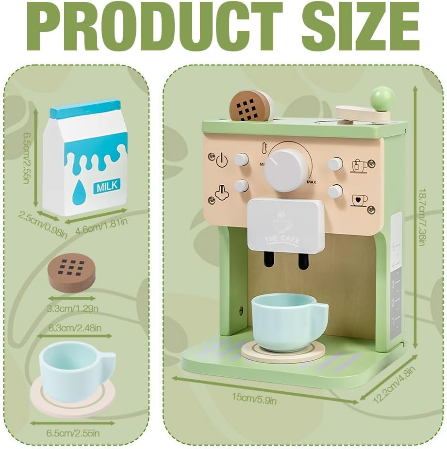 [Set di macchine da caffè giocattolo da cucina]Macchina da caffè in legno presenta un design dettagliato e realistico, che simula il processo di macinatura dei chicchi di caffè, permettendo ai bambini di osservare direttamente la preparazione del caffè. Le macchina caffe giocattolo in legno riproducono fedelmente il funzionamento di una vera macchina da caffè, rendendola ideale per i giochi di ruolo e aumentando l'interattività e il divertimento. [Materiali sicuri ed ecologici] Macchina da caffè in legno è realizzata in legno di alta qualità e vernice ecologica, che la rende sicura e inodore per i bambini. La sua superficie liscia e gli angoli arrotondati sono delicati sulle mani delicate e le dimensioni sono perfette per i bambini, rendendola facile da usare. [Diventa facilmente un barista professionista] Con questa macchina caffe giocattolo in legno, puoi creare la tua caffetteria! I bambini possono giocare a fare i baristi, fingendo di servire latte e cappuccini a familiari e amici. Questa Macchina da caffè in legno li aiuta a sviluppare le abilità sociali e a sperimentare il piacere di preparare il caffè. [Esperienza di gioco realistica] Il set Macchina da caffè in legno include due tazze, due piattini, una lattiera, quattro chicchi di caffè e una caffettiera. Caffettiera giochi bambini è dotato di diversi pulsanti e, ruotando la manopola superiore, si sente un clic, simulando la macinatura del caffè, stimolando le abilità pratiche e il gioco di ruolo. [Regalo ideale] Macchina da caffè in legno offre un'ampia varietà di accessori, perfetti per una varietà di scenari. I bambini non solo si divertono con il gioco di ruolo, ma sviluppano anche abilità pratiche, sociali ed emotive. Macchina da caffè per bambini in legno con macinino è un regalo ideale per compleanni, Ringraziamento e Natale.