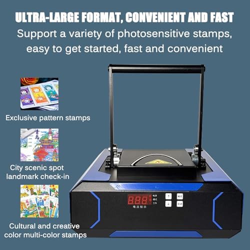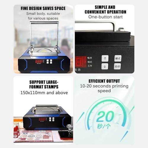 SUPPORTO DI GRANDI FORMATO: progettata per l'alta efficienza, questa stampante gestisce timbri e firme di grande formato fino a 150 x 110 mm, raggiungendo una velocità di stampa rapida di 10-20 secondi per grandi volumi di produzione. FACILE FUNZIONAMENTO CON UN PULSANTE UTILIZZAZIONE: utilizzo senza problemi con una funzione di avvio con un solo pulsante che offre controlli intuitivi e un display della tensione per una facile gestione durante la stampa. DESIGN COMPATTO PER RISPARMIARE SPAZIO: Progettata con un ingombro ridotto, questa stampante si adatta facilmente a qualsiasi spazio di lavoro e include parametri integrati per l'ottimizzazione automatica dell'output in base alle dimensioni del pad fotosensibile. Applicazioni versatili: ideale per l'industria dei francobolli, questa stampante è perfetta per negozi di francobolli ritrattistici professionali, luoghi turistici e progetti fai da te, consentendo la creazione di francobolli personalizzati, loghi e francobolli di nozze. Leggera e portatile: con un peso di soli 10,25 kg, questa stampante è realizzata per comodità e portabilità, consentendo di produrre più timbri per bambini contemporaneamente, rendendola un'opzione eccellente per la produzione di timbri mobili.