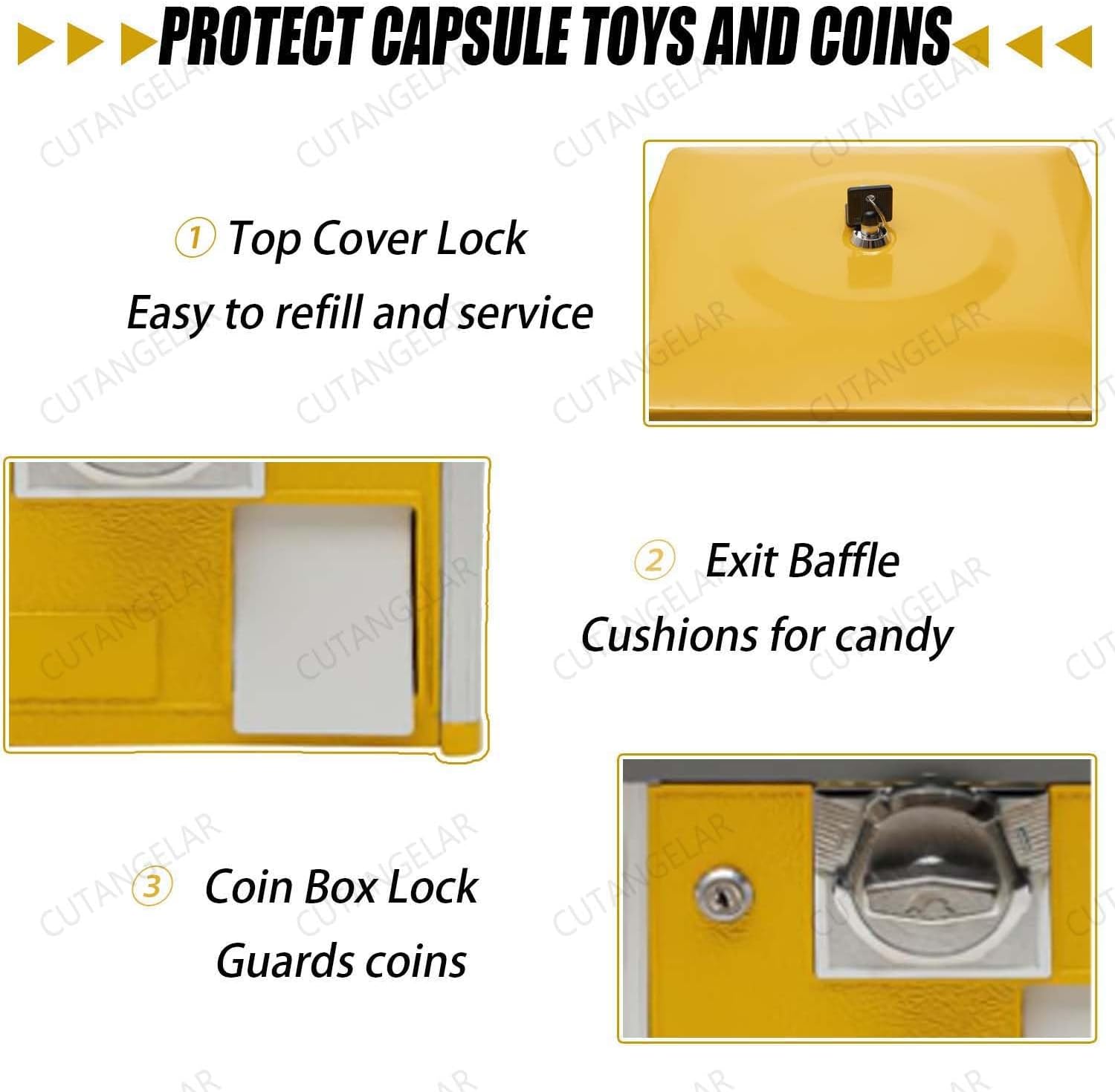 ⭐【Capacità ed Efficienza Professionale】: Questo distributore automatico commerciale ha una grande capacità di 26x29x53 cm, può ospitare 150 capsule standard da 4,8 cm o 200 capsule piccole da 4,3 cm ed è dotato di un salvadanaio che può contenere 800 monete. Progettato per luoghi ad alto traffico come centri commerciali e parchi divertimento. ⭐ 【Elevata sicurezza, robusto e durevole】: la macchina per capsule e caramelle, la gettoniera e la cassa principale adottano un sistema di chiusura a chiave per proteggere le entrate e le scorte. Il telaio rettangolare è realizzato in lega di zinco-alluminio rinforzata e materiale composito infrangibile ABS/Ps, supportando un carico di 7 kg. Il telaio ruota per visualizzare gli elementi. ⭐【Adattamento flessibile multi-valuta】: erogatore di monete, design internazionale con accettatore di monete personalizzabile (set per due monete da 25 centesimi). Accetta 1-4 pezzi (29-30 mm di diametro) provenienti da diversi paesi. Contattaci per regolare l'accettatore in base alla tua valuta, ideale per le zone turistiche. ⭐【Funzionamento meccanico a misura di bambino】: i mini distributori automatici funzionano senza elettricità o monitoraggio. Operazione in 3 passaggi (Inserimento parte → Ruota maniglia → Ricevi). Base Girevole a 360° Con Finestra Trasparente. Dispositivo Antiblocco e Anticaduta - Perfetto per i bambini. ⭐ 【Ampia gamma di usi, rendimento elevato】: distributore di caramelle portatile a distribuzione flessibile. Adatto a sale giochi, centri commerciali, negozi, ecc. È disponibile in sei colori vivaci (blu/rosso/giallo/verde/bianco/nero) che attira l'attenzione e aumenta le entrate.