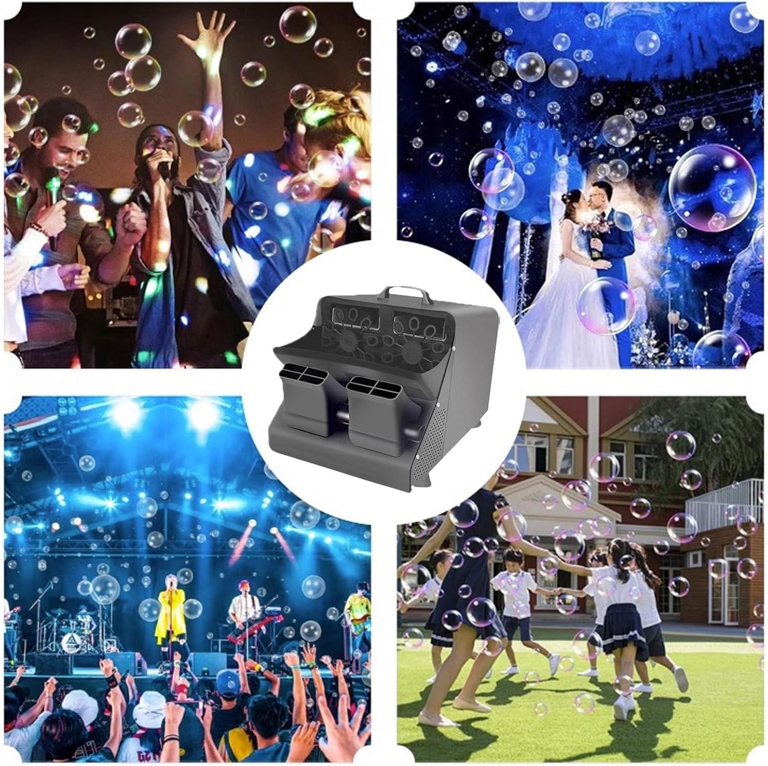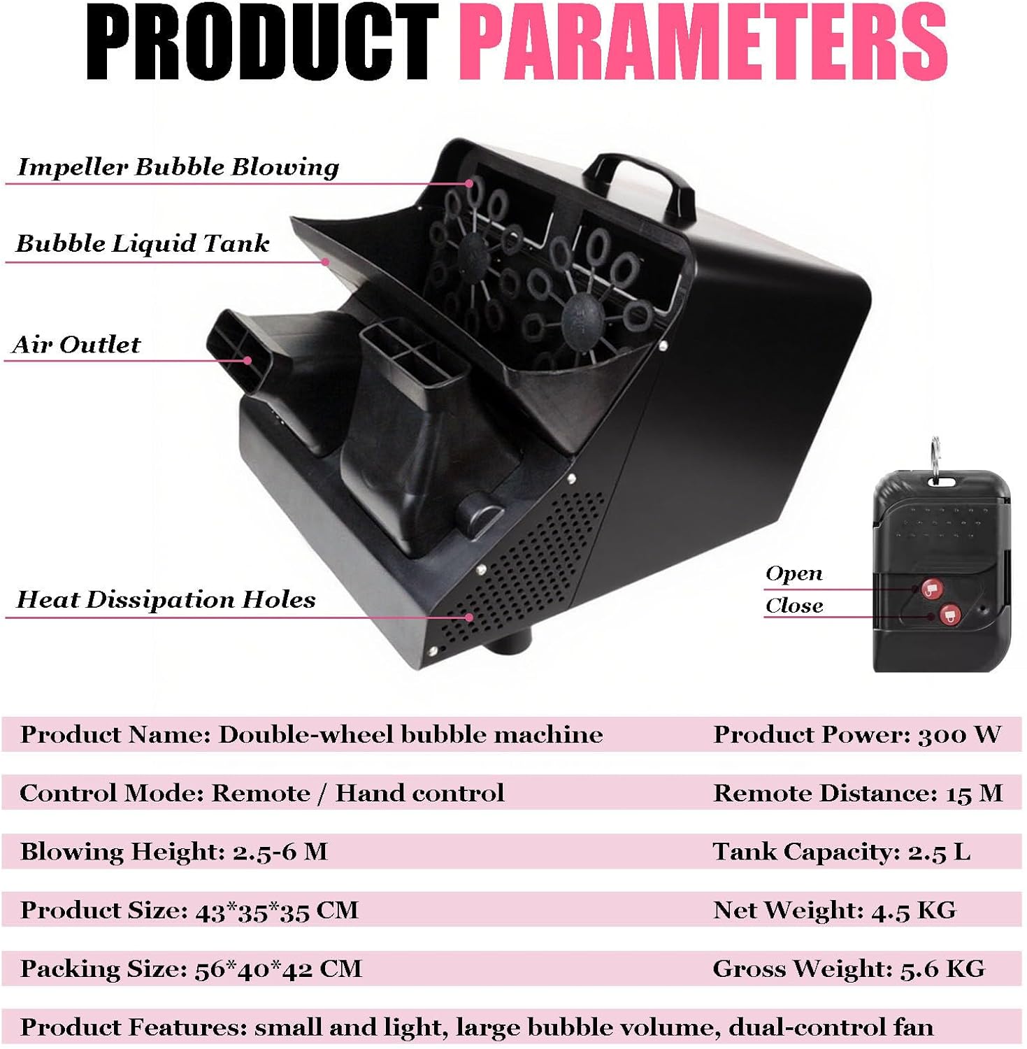 CREATORE DI ATMOSFERA DA SOGNO La nostra macchina per bolle a doppia ventola potenziata è dotata di 2 ventole da 12 cm ad alta velocità che spingono nell'aria oltre 20.000 bolle al minuto, creando all'istante un'atmosfera magica e sognante. Perfetta per eventi di tutte le dimensioni: feste di compleanno, spettacoli teatrali, matrimoni, eventi aziendali (CD), barbecue in giardino e festività importanti come Halloween e Natale. Progettata sia per uso interno che esterno, trasforma qualsi MOTORE AVANZATO PER BOLLE Il Bubble Maker è dotato di motore passo-passo + riduttore da 300 W. Il dispositivo a doppia ruota genera 3 tipi di bolle: Standard (2-4"), Gigante (6-8") e Micro (0,5-1"). Con un'enorme copertura di oltre 1000 piedi quadrati per riempimento, è adatto per grandi esposizioni che attirano un pubblico e per eventi professionali! CONTROLLO PRECISO DELLE BOLLE Dotato di uscita dell'aria regolabile (inclinazione 30°-90°) per un controllo preciso della traiettoria delle bolle (raggiungendo un'altezza massima di 5 m/16 piedi, una distanza di 6 m/20 piedi). L'intuitiva manopola della velocità offre diverse modalità di produzione di bolle: da "Brezza delicata" (800/min) a "Modalità tempesta" (15.000/min), ideale per ogni tipo di attività, dai matrimoni agli spettacoli teatrali. TELECOMANDO INTELLIGENTE Imposta facilmente Bubble Blower con il nostro telecomando! Avvio/arresto con un solo pulsante e indicatore di stato a LED. Il design tascabile (+ moschettone) garantisce la massima portabilità, mentre la tecnologia anti-interferenza avanzata fornisce un segnale stabile fino a 15 m/50 piedi (in linea di vista). Lo spegnimento automatico dopo 60 minuti di utilizzo continuo previene il surriscaldamento. COSTRUZIONE DI LIVELLO COMMERCIALE La nostra macchina automatica per bolle è dotata di una scocca monoblocco in ABS+PC di alta qualità che pesa solo 4,5 kg e supera rigorosi test di durata di oltre 500 ore, superando di gran lunga le tradizionali scocche in ferro soggette a ruggine a causa del liquido per bolle. Include una base antiscivolo per un posizionamento sicuro su palchi professionali o superfici irregolari.