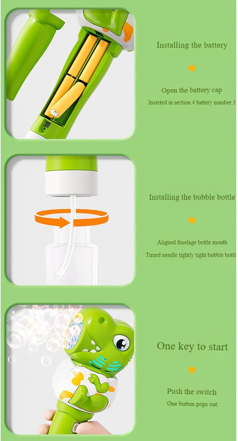 Forma accattivante: la forma del dinosauro è attentamente progettata per attirare l'attenzione dei bambini. Non solo è un giocattolo, ma funge anche da decorazione unica per la casa o la festa. Aggiungi un tocco di divertimento a qualsiasi evento con questa macchina per bolle di dinosauri sapientemente progettata. Bubbly Maker: la macchina per bolle di dinosauro garantisce ore di divertimento con la sua funzione automatica che sputa bolle colorate in grandi quantità grazie al sistema di azionamento del motore ad alta efficienza integrato. Migliora l'atmosfera: migliora qualsiasi riunione o festa con l'accattivante effetto di illuminazione a LED della nostra macchina per bolle di dinosauro. Guarda le bolle ballare al ritmo e creare un'atmosfera divertente e vivace che tutti adoreranno. Semplice da usare: la macchina per bolle dei dinosauri è dotata di un'interfaccia semplice e di facile comprensione, con accensione/spegnimento con un solo pulsante per un funzionamento conveniente e un facile controllo. Divertiti di più con questa macchina per bolle facile da usare che richiede poco sforzo. Intrattenimento ininterrotto: progettata per soddisfare le esigenze di intrattenimento a lungo termine, la nostra macchina per bolle a forma di dinosauro presenta un design ricaricabile con una batteria al litio di grande capacità che consente diverse ore di divertimento ininterrotto nel soffiare bolle. Preparati per un intrattenimento senza fine che dura e dura