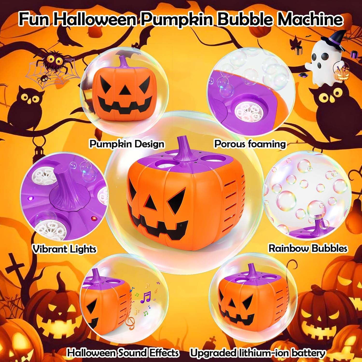 Macchina per bolle di zucca: crea una fantastica atmosfera da festa di Halloween con una macchina per bolle di zucca che rilascia una grande quantità di bolle tramite più ugelli. Queste dense bolle abbinate a luci LED in diverse tonalità riempiranno ogni stanza con una magica decorazione a bolle. Con musica e luci: trasforma la tua festa con un design a forma di zucca 4 in 1, spettrali effetti sonori di Halloween, vibranti luci a LED e flussi di bolle. Questa combinazione fa appello alla vista, all'udito e al tatto, rendendolo ideale per le decorazioni delle feste di Halloween e per il divertimento di Halloween all'aperto. Traboccamento di bolle: la nostra macchina per bolle presenta un esclusivo design a tre ugelli e 15 fori che fornisce bolle abbondanti, dense e distribuite uniformemente eliminando i problemi di bolle e accumulo di liquidi comuni con le macchine standard. Sia all'interno che all'esterno, il tuo bambino sarà circondato da bolle magiche. A prova di perdite: per evitare perdite di liquido a bolle, abbiamo sviluppato un doppio sistema di protezione dalle perdite che include una guarnizione a bolle ad alta densità, un dispositivo antiriflusso e fori di montaggio sul fondo della bottiglia. Anche se la macchina per bolle viene capovolta o agitata, non può fuoriuscire alcun liquido. La scelta ideale per Halloween e feste festive: questa macchina per bolle di zucca crea un'atmosfera magica per Halloween aggiungendo divertimento alle feste di compleanno, alle riunioni del Ringraziamento e alle celebrazioni festive. Il loro allegro effetto bolla delizia sia i bambini che gli adulti, rendendoli un'aggiunta versatile a qualsiasi evento.