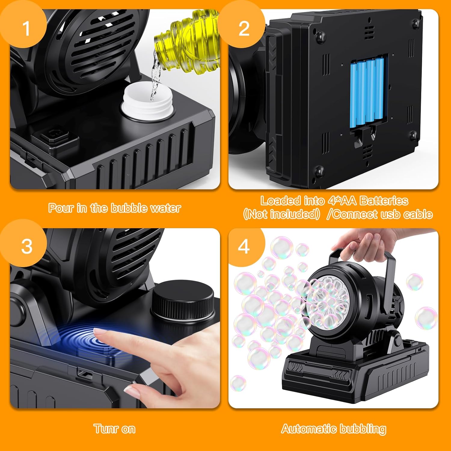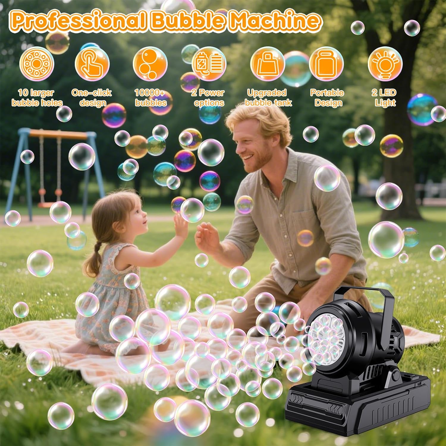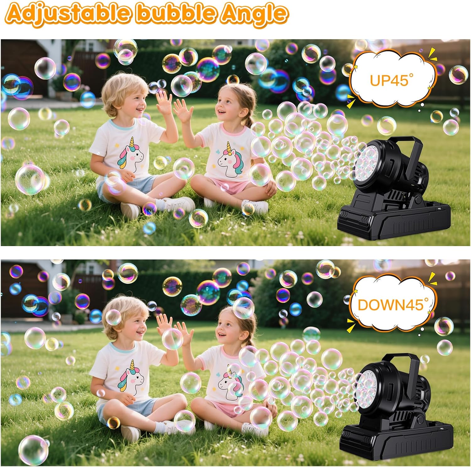 [Macchina per bolle ad angolo regolabile] La macchina per bolle automatica è progettata con angolo regolabile, può essere regolata di 45° su e giù per diverse occasioni, le bolle soffiano più velocemente, più in alto e più lontano nell'aria anche senza vento, affascinando i bambini e intrattenendo affettuosi animali domestici nel gioco delle bolle, creando anche fantastiche decorazioni per feste, compleanni, matrimoni, spettacoli teatrali o altri eventi all'aperto. [Più di 20.000 bolle grandi ad alto rendimento] Dotata di un motore potente e 10 grandi fori per bolle, la macchina per bolle può produrre automaticamente più di 20.000 grandi bolle colorate al minuto. Tonnellate di grandi bolle trasformano il giardino sul retro in un parco giochi per bambini pieno di risate. Viene fornito con 120 ml di soluzione per bolle e 20 confezioni di ricariche per creare e goderti un divertente mondo di bolle, rendendo più piacevole il tempo di gioco all'aperto. [Luci abbaglianti, maniglia portatile] Le luci integrate rendono le bolle più scintillanti e visibili anche al buio, rendendo la festa notturna più attraente. Il design leggero e la maniglia portatile consentono ai bambini di trasportarlo ovunque in giardino, cortile o parco. Basta premere un pulsante per fare bolle e divertirsi. [Doppia alimentazione, materiali ecocompatibili] La macchina per bolle elettrica può essere alimentata da 4 batterie AA (non incluse) o cavo USB (incluso) per il collegamento a un adattatore/power bank. La flessibilità della batteria o del cavo USB ne consente l'utilizzo all'interno o all'esterno. La macchina per bolle utilizza materiali robusti, superficie liscia senza spigoli vivi, consentendo ai bambini di giocare in tutta tranquillità. [Giocattoli a bolle per tutte le scene] - I bambini di tutte le età adorano le bolle, la macchina per le bolle permette ai bambini di godersi ore di divertimento, è anche una parte essenziale per creare un'atmosfera piacevole nei parchi all'aperto, feste di compleanno, matrimoni, cortili, giardini, campeggi, giochi in piscina, ecc. Una macchina per bolle automatica è un regalo ideale per i tuoi bambini.