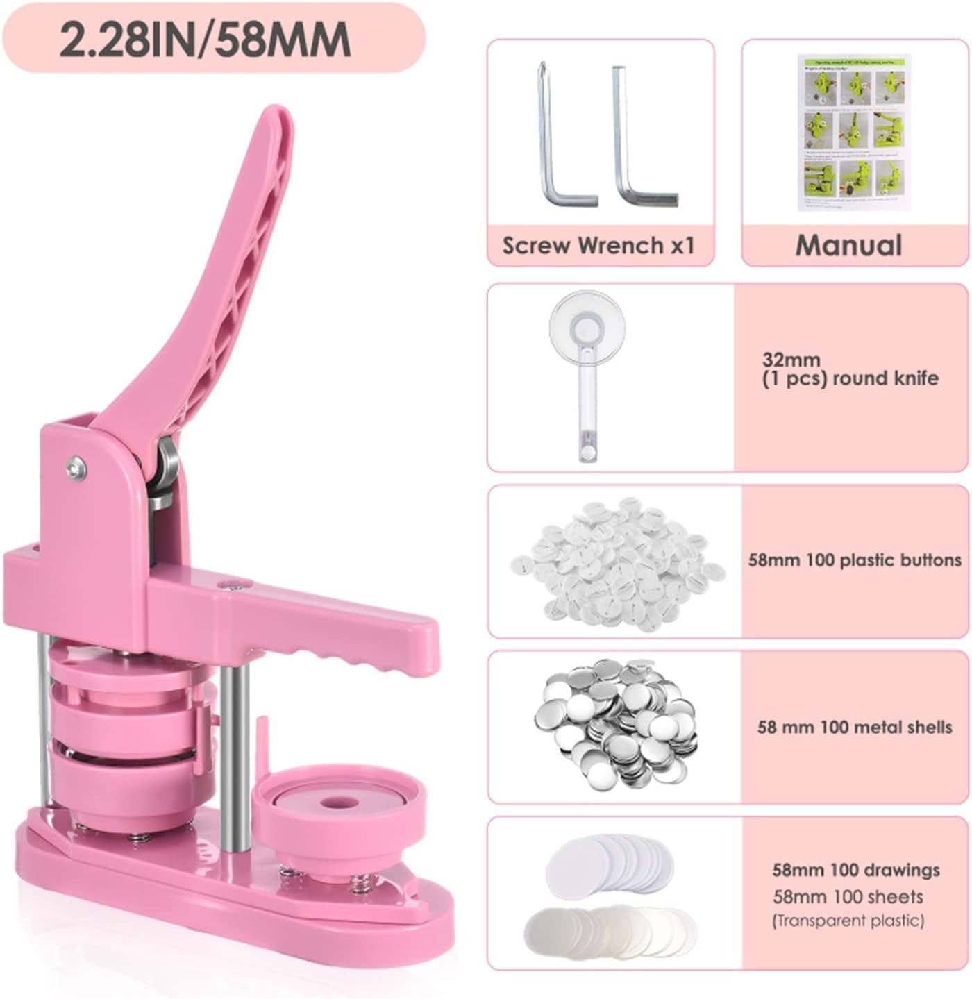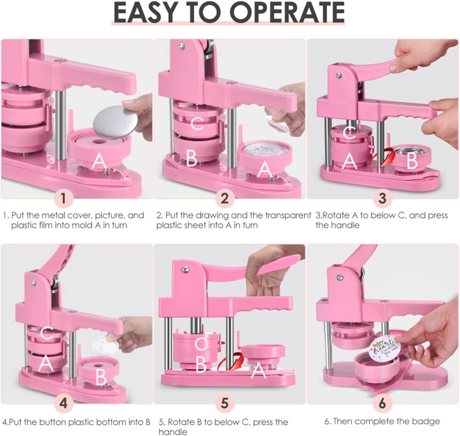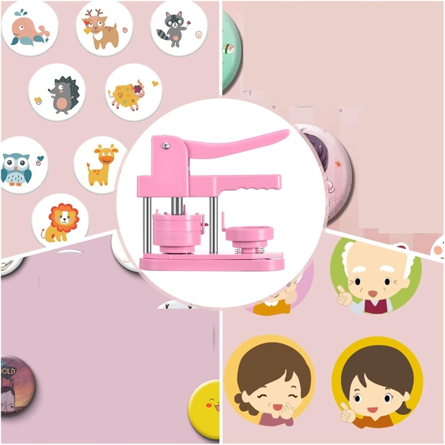 Il kit per la creazione di badge per bottoni fai da te include una macchina per bottoni da 58 mm (2¼ pollici), 100 parti per bottoni, una taglierina circolare da 58 mm (2¼ pollici), 100 immagini da 58 mm (2¼ pollici). Fai da te 58mm, una sorta di macchina per la produzione di badge, che può realizzare piccoli regali come spille, apriscatole, grucce, rosette, portachiavi, ecc. Questa macchina utilizza tecnopolimeri ad alta resistenza, corpo macchina ed è integrata, è leggera, lunga durata e funzionamento semplice, sfruttando appieno l'abilità pratica del bambino. Innanzitutto, taglia l'immagine alla dimensione corretta con una fustellatrice circolare semplice e facile da usare. In secondo luogo, posizionare la parte inferiore e superiore del distintivo da 58 mm sulla macchina per bottoni. In terzo luogo, posizionare la copertura metallica del badge nello stampo del coperchio superiore. Immagine sulla copertina Posiziona la pellicola trasparente sull'immagine e premi verso il basso la maniglia della macchina per la produzione di badge. Infine, l'aggiunta di un perno metallico sul supporto della tecnologia di montaggio girevole non solo migliora l'efficienza e la precisione, ma aiuta anche a posizionare meglio, garantendo che pulsanti e badge abbiano esattamente l'aspetto desiderato.
