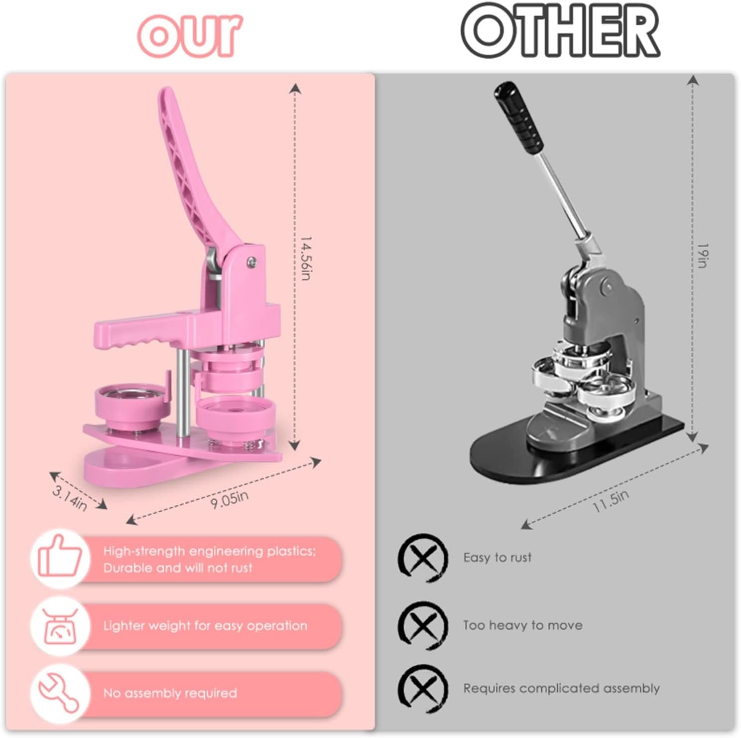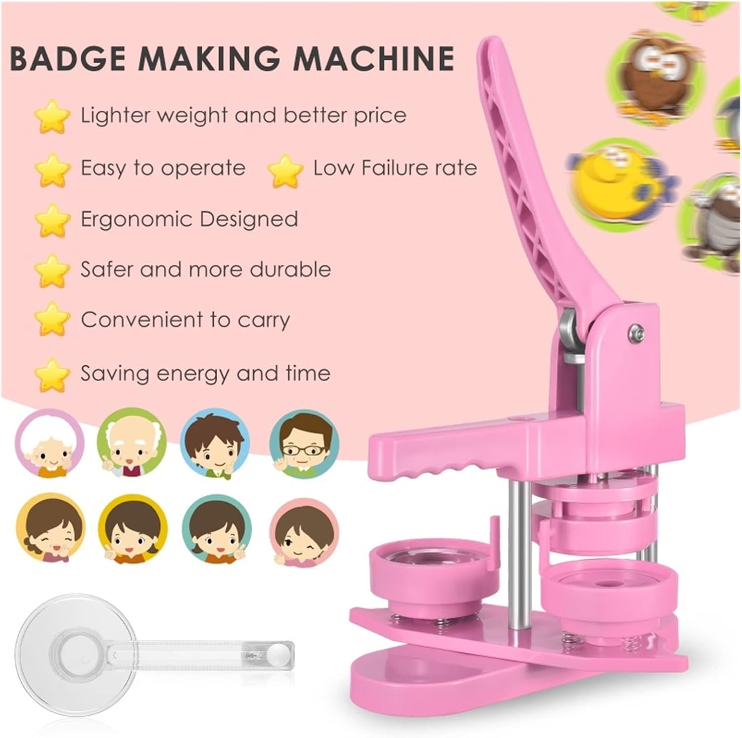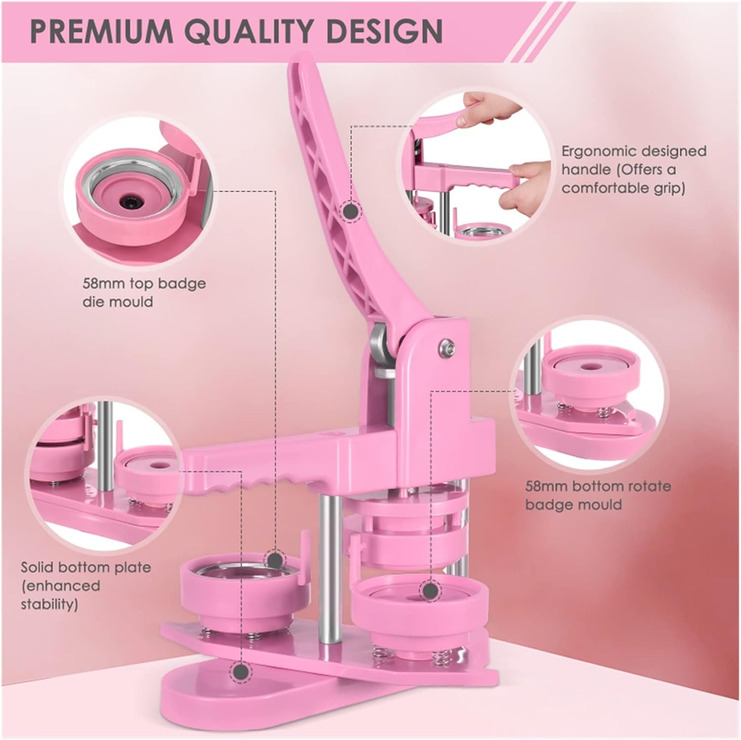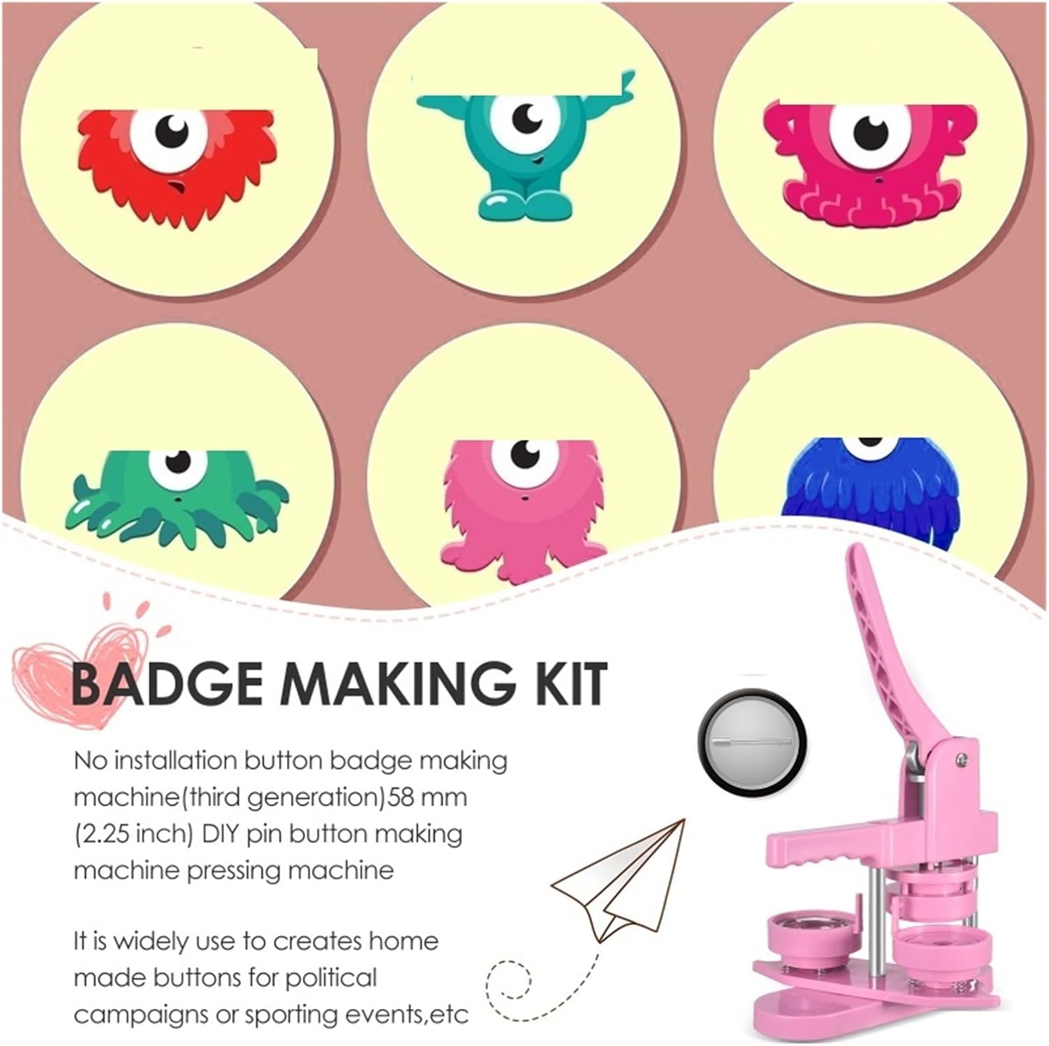 Il kit per la creazione di badge per bottoni fai da te include una macchina per bottoni da 58 mm (2¼ pollici), 100 parti per bottoni, una taglierina circolare da 58 mm (2¼ pollici), 100 immagini da 58 mm (2¼ pollici). Fai da te 58mm, una sorta di macchina per la produzione di badge, che può realizzare piccoli regali come spille, apriscatole, grucce, rosette, portachiavi, ecc. Questa macchina utilizza tecnopolimeri ad alta resistenza, corpo macchina ed è integrata, è leggera, lunga durata e funzionamento semplice, sfruttando appieno l'abilità pratica del bambino. Innanzitutto, taglia l'immagine alla dimensione corretta con una fustellatrice circolare semplice e facile da usare. In secondo luogo, posizionare la parte inferiore e superiore del distintivo da 58 mm sulla macchina per bottoni. In terzo luogo, posizionare la copertura metallica del badge nello stampo del coperchio superiore. Immagine sulla copertina Posiziona la pellicola trasparente sull'immagine e premi verso il basso la maniglia della macchina per la produzione di badge. Infine, l'aggiunta di un perno metallico sul supporto della tecnologia di montaggio girevole non solo migliora l'efficienza e la precisione, ma aiuta anche a posizionare meglio, garantendo che pulsanti e badge abbiano esattamente l'aspetto desiderato.