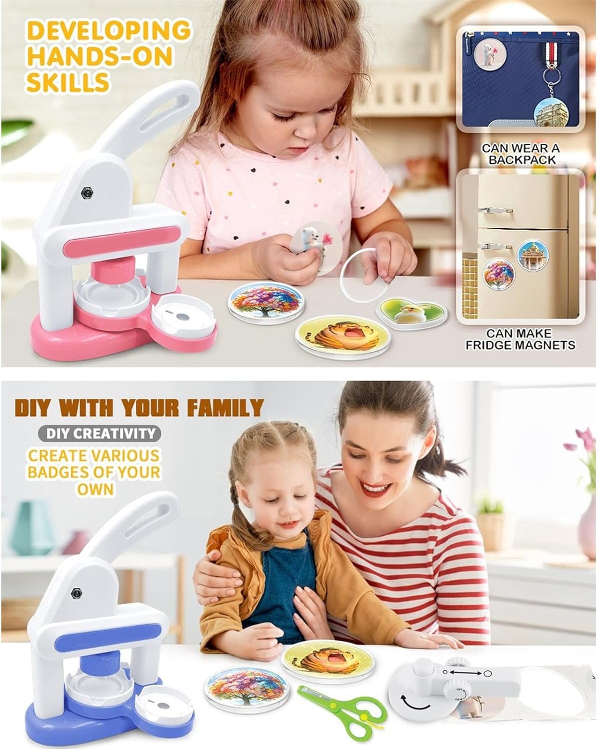 Crea fino a 48 distintivi unici con questo set Button Maker Machine, con struttura in ABS e bordi arrotondati sicuri per i bambini per il fai da te Il meccanismo di stampa integrato con taglierina circolare da 55 mm garantisce il taglio del modello e il montaggio sicuro del badge utilizzando modelli di design e componenti riutilizzabili Per progetti scolastici, regali di festa come ornamenti di Natale, forniture per feste di compleanno o personalizzare con foto, disegni e adesivi decorativi La confezione regalo portatile include tutti gli accessori Badge Maker per bambini, consentendo un'espressione artistica immediata senza configurazioni o strumenti complessi Ideale per bambini e appassionati di artigianato, questo strumento educativo migliora la creatività sviluppando abilità motorie attraverso le personalizzazioni manuali sui badge