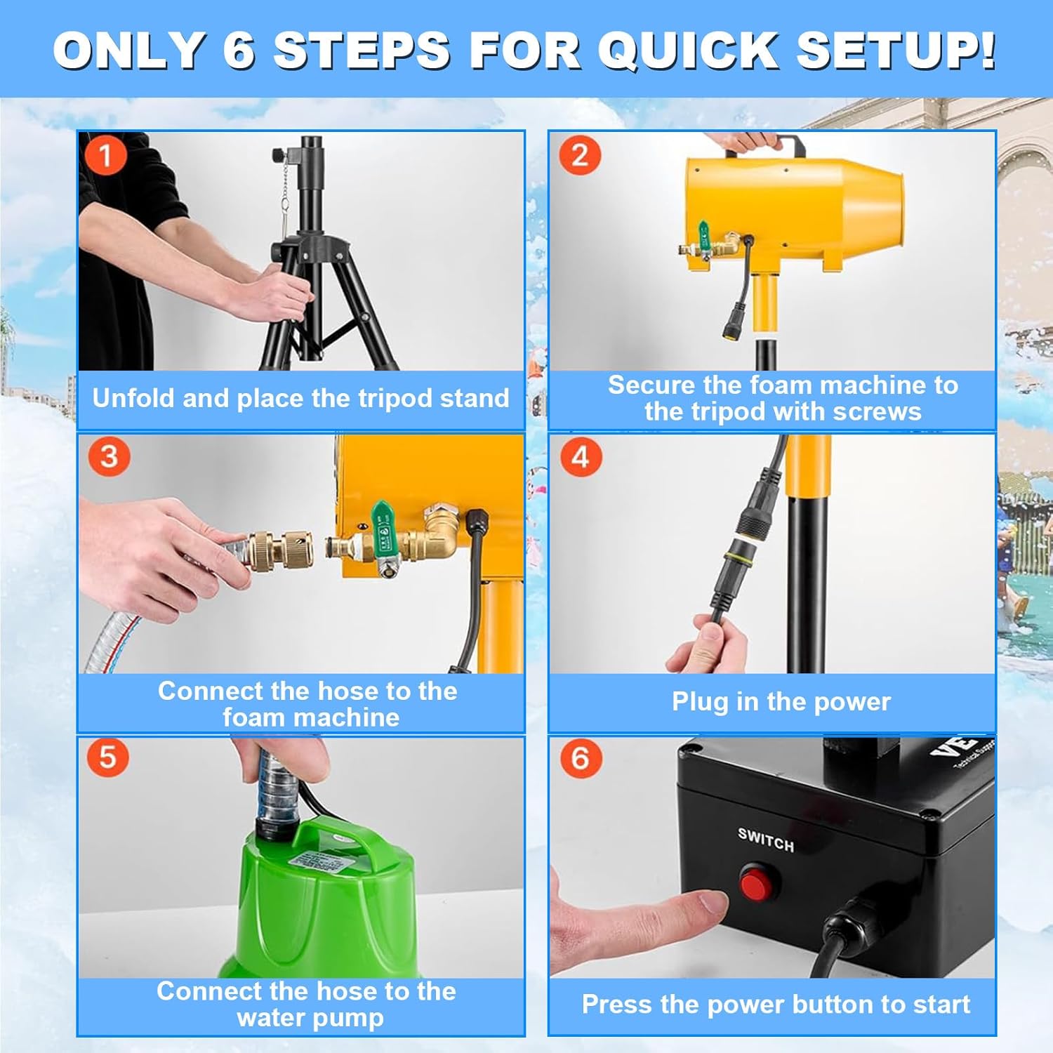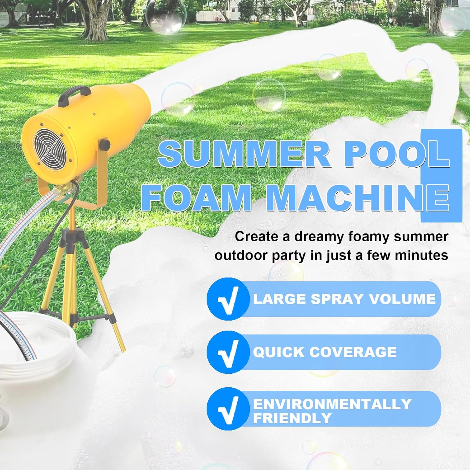 【Macchina Schiuma per Feste】: Vivi l'esperienza della macchina per schiuma più flessibile! Perfetta per battaglie di schiuma dinamiche, interazioni con la folla o attività in aree specifiche. Macchina per schiuma ad alta potenza da 1000W, compatibile con la maggior parte delle soluzioni di polvere per schiuma sul mercato. 【Alta resa, spruzzo continuo di schiuma】: La grande macchina per schiuma utilizza ventilatori importati per accelerare il flusso. L'area di copertura della schiuma è di circa 80 metri quadrati, la distanza di spruzzo può raggiungere i 6-10 metri e l'ugello per schiuma da 1000 watt può regolare l'angolo verso l'alto e verso il basso. 【Quantità di schiuma regolabile】: Controlla la quantità di schiuma in base alle tue esigenze. Che tu voglia una cascata di schiuma leggera o una schiuma densa, questa macchina può soddisfare le tue necessità. 【Leggera e portatile】: Questa piccola macchina leggera è facile da trasportare e conservare. Dotata di una piccola macchina per la schiuma, controller di potenza, pompa dell'acqua, treppiede e manuale dell'utente. Non è necessario un serbatoio speciale per l'acqua, qualsiasi contenitore che possa contenere la soluzione schiumogena va bene. 【Ampia Applicazione】: Questa macchina per schiuma da piscina è perfetta per varie occasioni che richiedono un'atmosfera gioiosa e effetti interattivi. Adatta per feste di Natale in piscina, feste di compleanno, attività genitore-figlio, parchi giochi, parchi acquatici all'aperto, palcoscenici e centri commerciali.