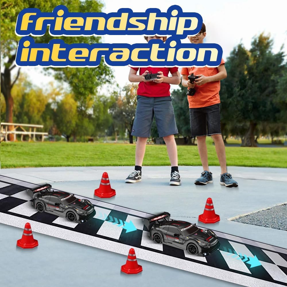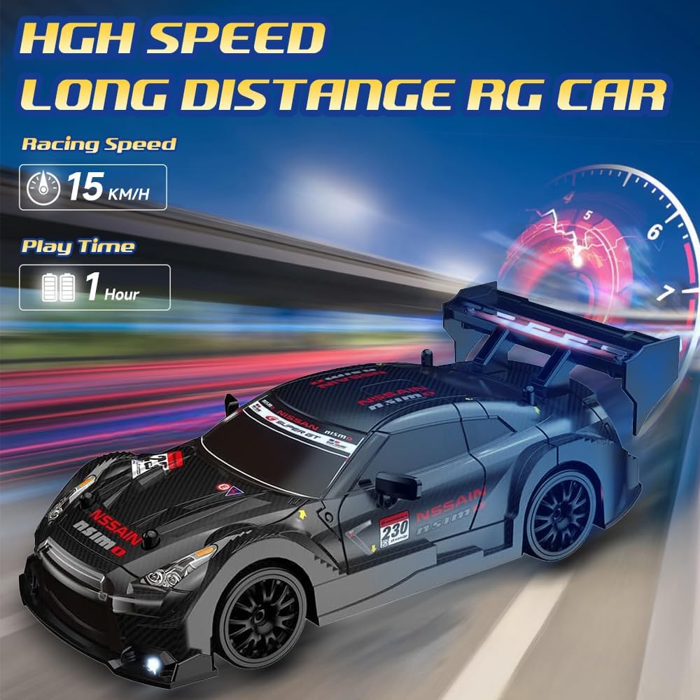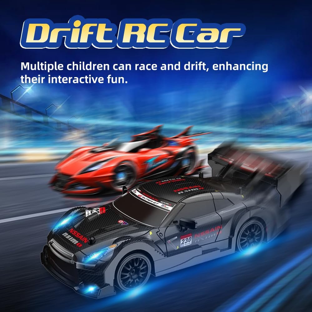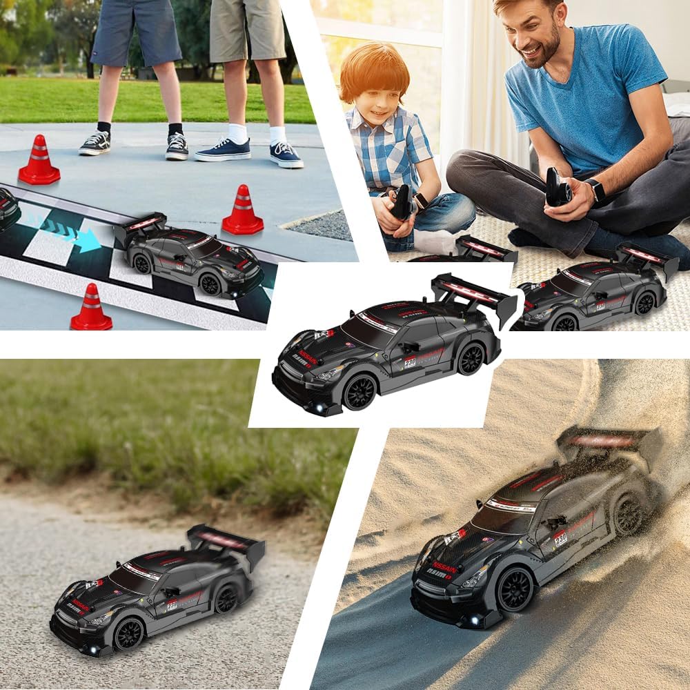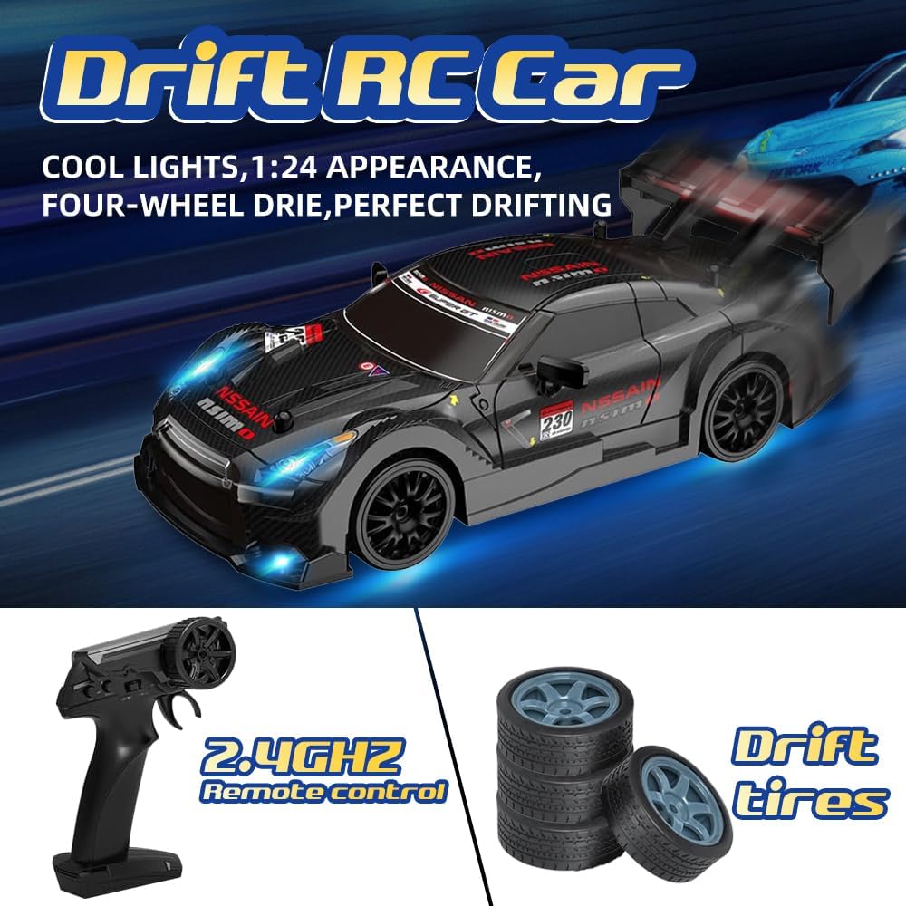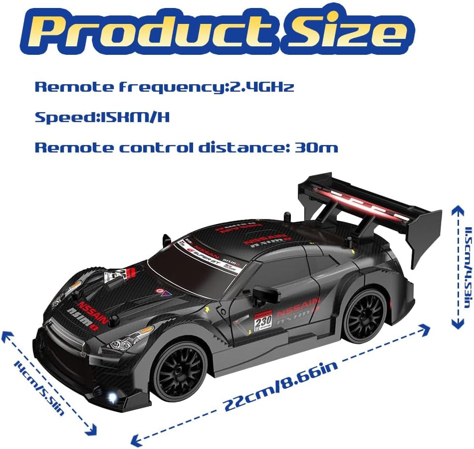 【Esperienza di drifting definitiva】Questa macchina telecomandata riproduce la forma di un'auto da corsa GTR in scala 1:24, con un design dettagliato e realistico e fantastici effetti visivi. L'macchina telecomandata è dotata di pneumatici da drift professionali e offre ai bambini un divertimento entusiasmante. 【Capacità 4WD】Questa macchina telecomandata è dotata di trazione integrale e può raggiungere una velocità massima di 15 km/h. Ha un sistema di trazione integrale che distribuisce la potenza in modo efficiente durante il drifting, con una coppia maggiore per un drifting più fluido. 【Telecomando stabile a 2,4 GHz】Questa macchina telecomandata è dotata di un telecomando a 2,4 GHz, con una portata di controllo fino a 30 metri (100 piedi). Più macchinine radiocomandate possono competere contemporaneamente senza interferire tra loro, sia all'interno che all'esterno. Giocare e competere con amici e fratelli promuove le capacità comunicative e di lavoro di squadra dei bambini. 【Accessori multifunzionali e funzionamento pratico】Includiamo 4 coni stradali con l'macchina telecomandata, permettendoti di costruire la tua pista da corsa in uno spazio aperto ed eseguire drift creativi. Dotata di 4 pneumatici da corsa e 4 pneumatici da drift, avrai bisogno di una sola auto. Puoi facilmente rimuovere e sostituire gli pneumatici e provare il divertimento di correre e driftare. 【Materiale adatto ai bambini】La custodia in plastica ABS offre un'eccellente resistenza agli urti. La carrozzeria dell'macchina telecomandata è realizzata in materiale ABS di alta qualità per una maggiore durata e i bordi arrotondati proteggono le mani dai graffi.