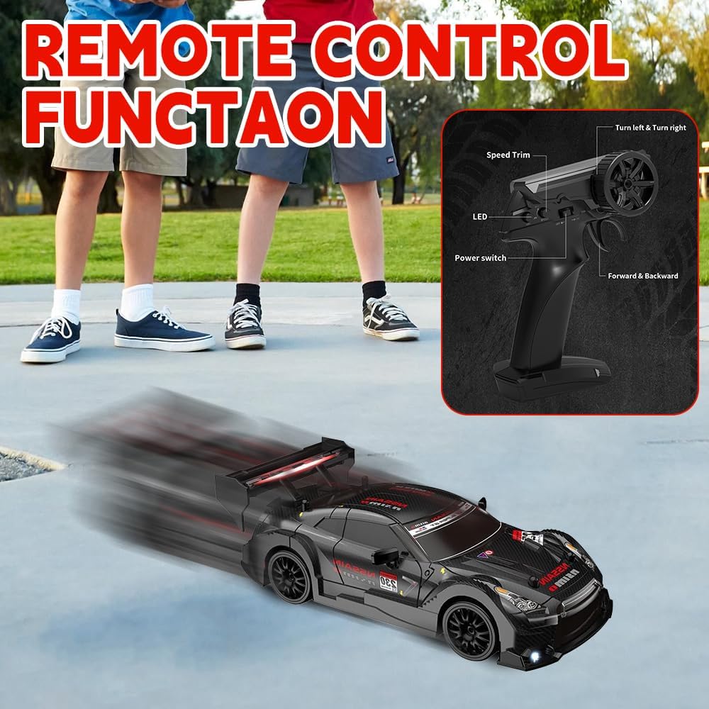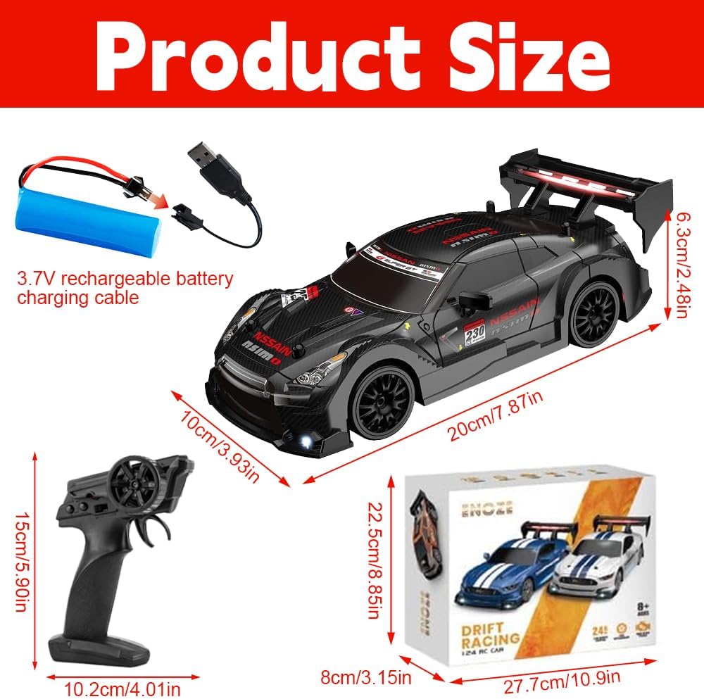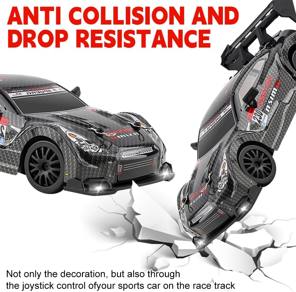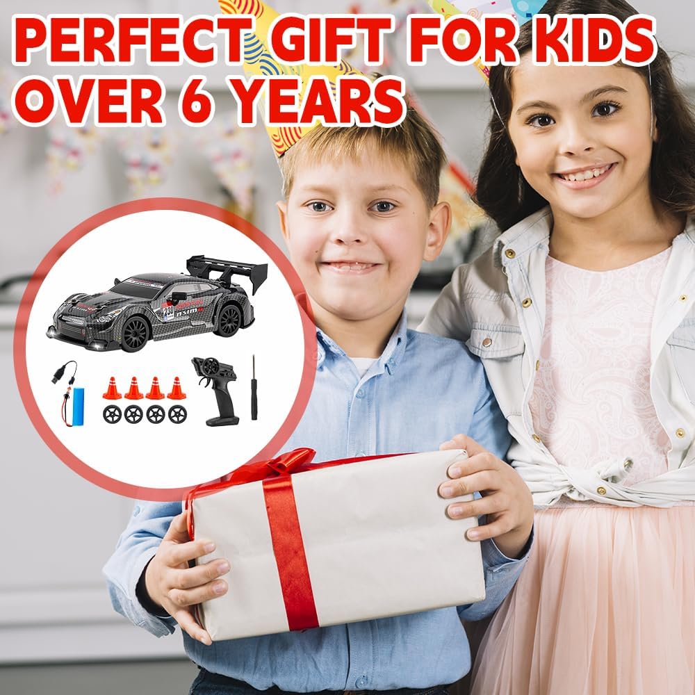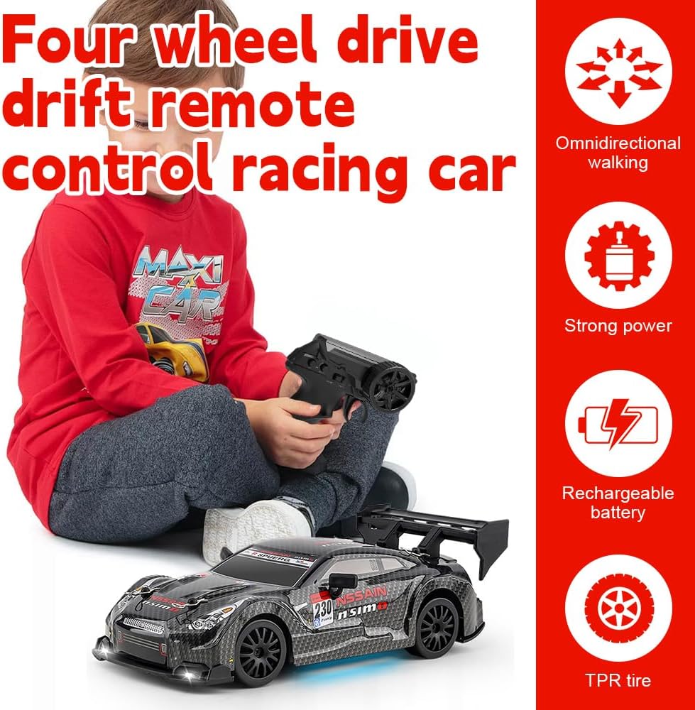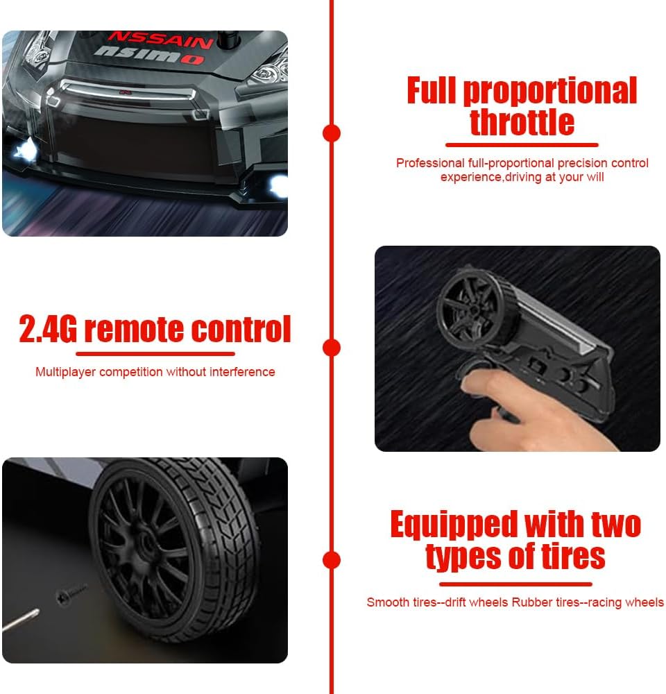 【Auto da drift telecomandata a quattro ruote motrici】Questa macchina telecomandata è dotata di quattro pneumatici da corsa e quattro blocchi stradali. Include anche una batteria ricaricabile e un cavo di ricarica, che consentono di passare facilmente dalla modalità corsa ad alta velocità a quella drifting per adattarsi a diverse superfici stradali e stili di gioco. Grazie alla trazione integrale e a un motore potente, può raggiungere una velocità massima di 30 km/h. 【Controllo del segnale a 2,4 GHz】Macchina telecomandata grazie all'avanzata tecnologia a 2,4 GHz, più giocatori possono giocare facilmente senza interferire tra loro. Il segnale a lungo raggio garantisce un controllo fluido e reattivo. Che si tratti di accelerare in linea retta o di curvare, è facile da controllare, permettendo ai bambini di divertirsi senza fine. 【Effetti di luce fantastici e design anticollisione】La nostra RC drift car è dotata di luci a LED, quindi, che tu stia correndo al tramonto o godendoti un'avventura notturna, le luci luminose e colorate possono migliorare la visibilità e l'eccitazione. È macchina telecomandata realizzata in materiale ABS di alta qualità e dotata di una scocca anticollisione staccabile e di un telaio anticaduta, garantendo che il veicolo rimanga intatto anche durante la guida intensa, prolungandone la durata. 【Facile da usare】Il telecomando portatile a forma di pistola è semplice da usare (richiede due batterie AA, non incluse), consentendo anche ai principianti di padroneggiare rapidamente e godersi il divertimento delle corse. Il telecomando può controllare macchina telecomandata da drift in avanti, indietro e girare a sinistra e a destra. Il telecomando è regolabile sia per utenti destrimani che mancini, rendendolo comodo per tutti. 【Regalo ideale per I bambini】La confezione raffinata, gli accessori completi e l'alta qualità lo rendono un regalo ideale per compleanni, pasqua, natale o altre occasioni. È RC drift car perfetto per principianti, adolescenti e piloti amatoriali. Questa macchina telecomandata non è solo bella e potente, ma aiuta anche a sviluppare le capacità sociali e il lavoro di squadra dei bambini.