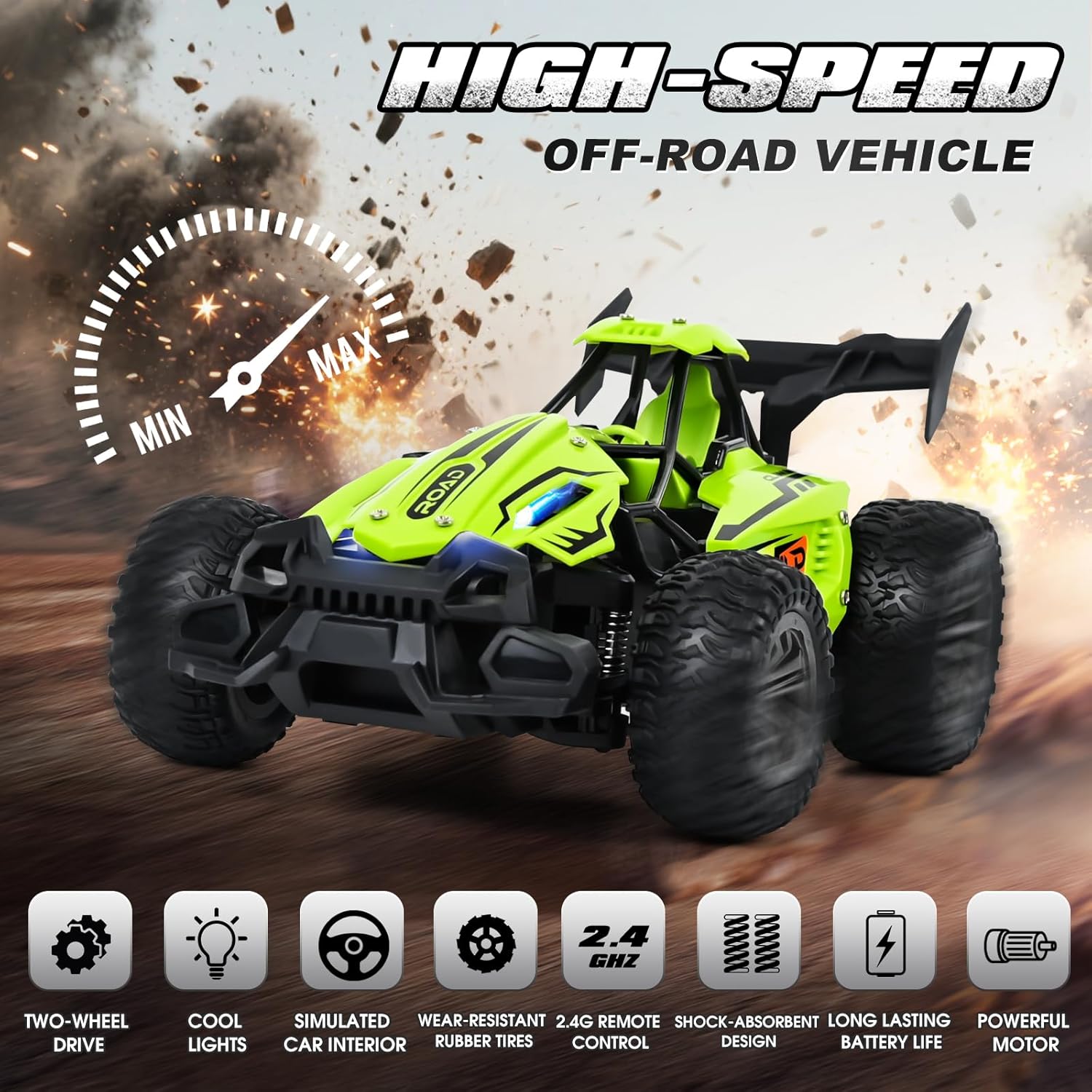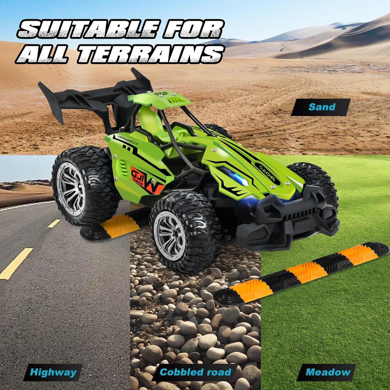 🏎️🏎️【Auto RC ad alta Velocità per Arrampicata】Riceverete 1 auto telecomandata, 1 telecomando, 2 batterie ricaricabili, 2 modelli di limitatori di velocità, 1 cacciavite, 1 cavo USB e 1 manuale di istruzioni. Il telecomando manuale utilizza una tecnologia radio avanzata a 2,4 GHz con una portata fino a 40 m, consentendo a più persone di controllare l'auto contemporaneamente senza interferire tra loro. 🏎️🏎️【Design Bicolore】 Offriamo due colori tra cui scegliere: Blu dinamico e verde giungla, combinati con un sistema di luci a 7 colori che cambia automaticamente tra i diversi colori dell'arcobaleno durante la guida. Anche di notte, l'auto può viaggiare senza ostacoli a una velocità massima di 15 km/h, garantendo un divertimento fresco e accattivante e rendendo il vostro bambino il centro dell'attenzione! 🏎️🏎️【Auto Fuoristrada】Pneumatici fuoristrada professionali antiscivolo, ammortizzatori e telaio trapezoidale in nylon + la capacità di superare piccole salite consentono di superare senza sforzo terreni complessi come erba e arenaria. Con due marce (alta velocità per le gare/bassa velocità per un controllo preciso) e due freni, potrete costruire una pista da corsa fuoristrada a casa vostra. 🏎️🏎️【Doppia Durata della Batteria】Con due batterie per una durata extra lunga, senza tempi di attesa. Una singola batteria dura 25-35 minuti, due batterie 50-70 minuti. Questa auto telecomandata è impermeabile e resistente, così i bambini possono guidare senza problemi attraverso le pozzanghere, schizzare sotto la pioggia o guidare su terreni bagnati e scivolosi. 🏎️🏎️ 【Un Eccellente Regalo di Natale】Cerchi il regalo perfetto? Questo fuoristrada telecomandato è adatto a bambini dai 6 anni in su ed è ideale come regalo di compleanno, per le festività e le occasioni speciali. Combina luci colorate lampeggianti, giochi avventurosi e resistenza, garantendo ore di divertimento ai bambini.