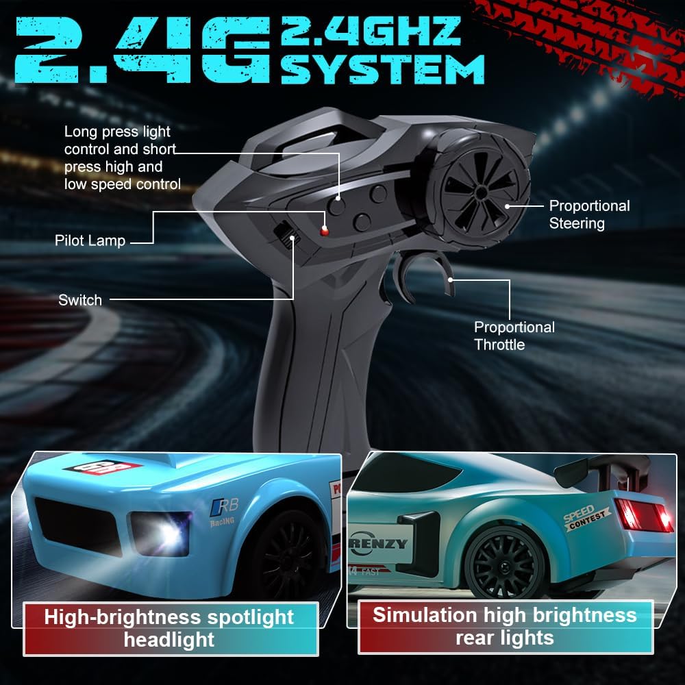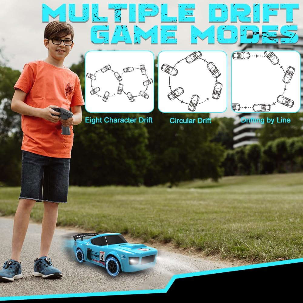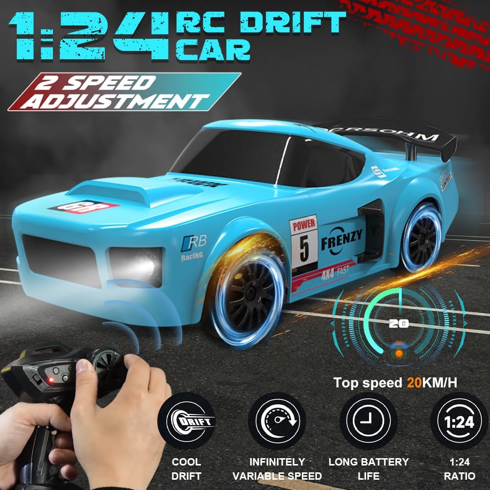 【Design realistico】Questa rc drift car è modellata su un'auto da corsa GTR in scala 1:24 e colpisce per il suo design dettagliato e realistico. Le luci a LED luminose consentono di identificare la posizione e la direzione in qualsiasi momento. Grazie alle luci fredde, è possibile trovare rapidamente l'auto da drift telecomandata anche al buio, mantenendo comunque un'eccellente visibilità 【Trazione integrale】La nostra rc drift car è dotata di trazione integrale e di un motore ad alte prestazioni per drift potenti. La velocità massima è fino a 20 km/h, perfetta per emozionanti gare di drift. Questa mini auto da drift è dotata di una batteria da 3,7 V che può essere caricata per 100 minuti e offre un'autonomia di 18-25 minuti 【Controllo preciso】Questa macchina telecomandata drift utilizza una radiofrequenza a 2,4 GHz, consentendo a più persone di controllarla contemporaneamente senza interferenze reciproche. La portata è fino a 50 metri. Il telecomando richiede due batterie AA non ricaricabili da 1,5 V (non incluse) 【Sistema di illuminazione a LED】 La nostra rc car è dotata di illuminazione a LED, inclusi fari anteriori, luci del telaio e fanali posteriori, particolarmente alla moda e che creano un look accattivante di notte 【Facile da usare】 La velocità e la direzione dell'auto da drift possono essere facilmente controllate con il telecomando a 2,4 GHz. L'macchina telecomandata drift può procedere avanti e indietro, frenare e girare a sinistra e a destra: è incredibilmente facile da usare. È un'auto giocattolo per adulti e bambini