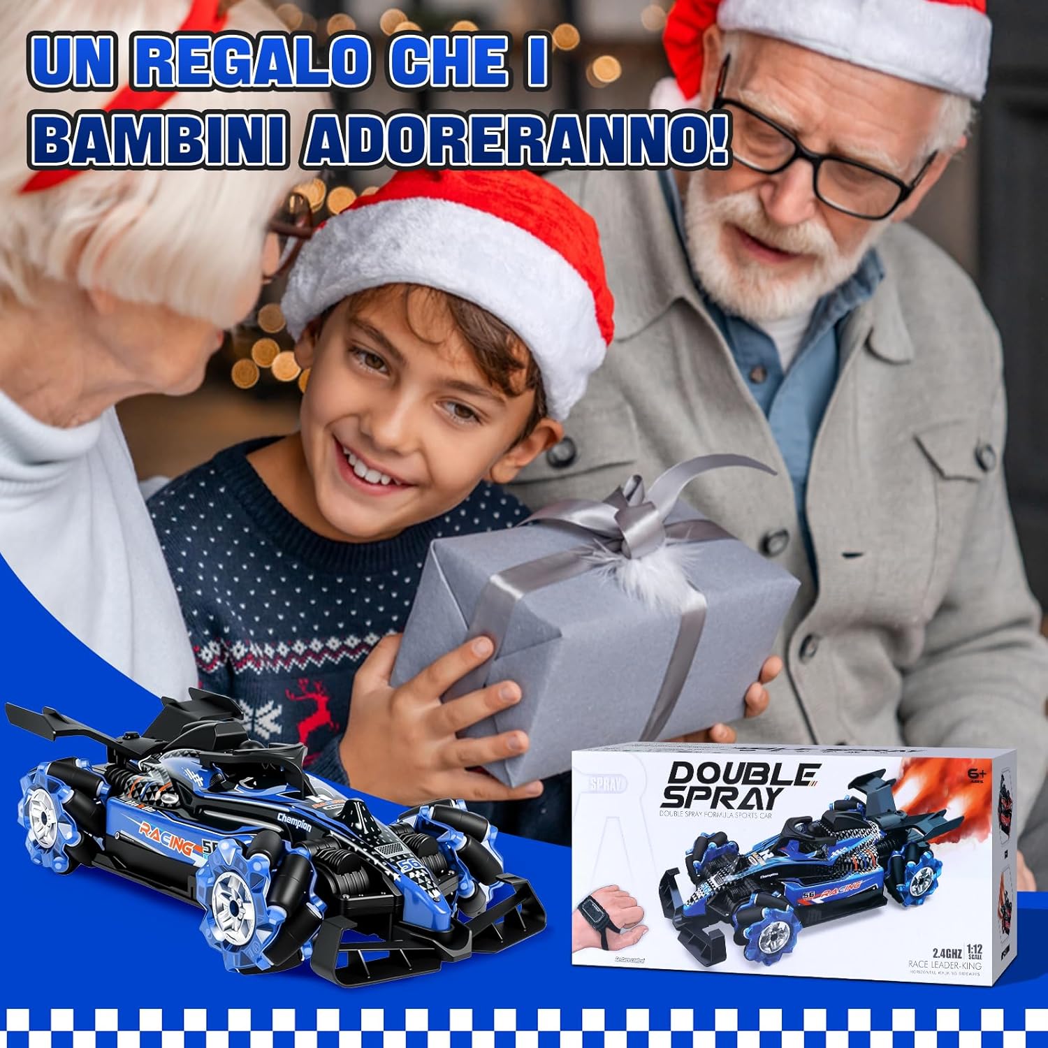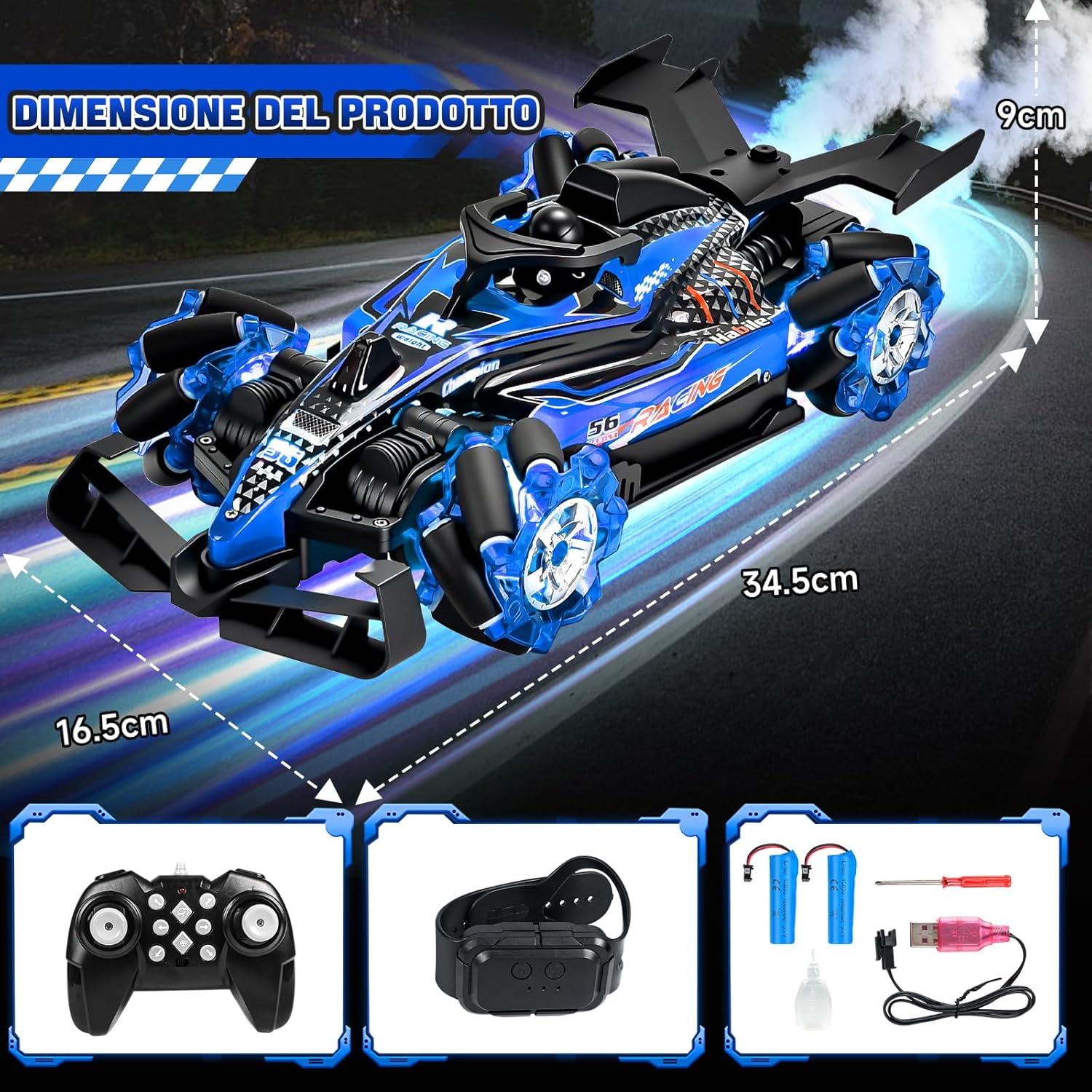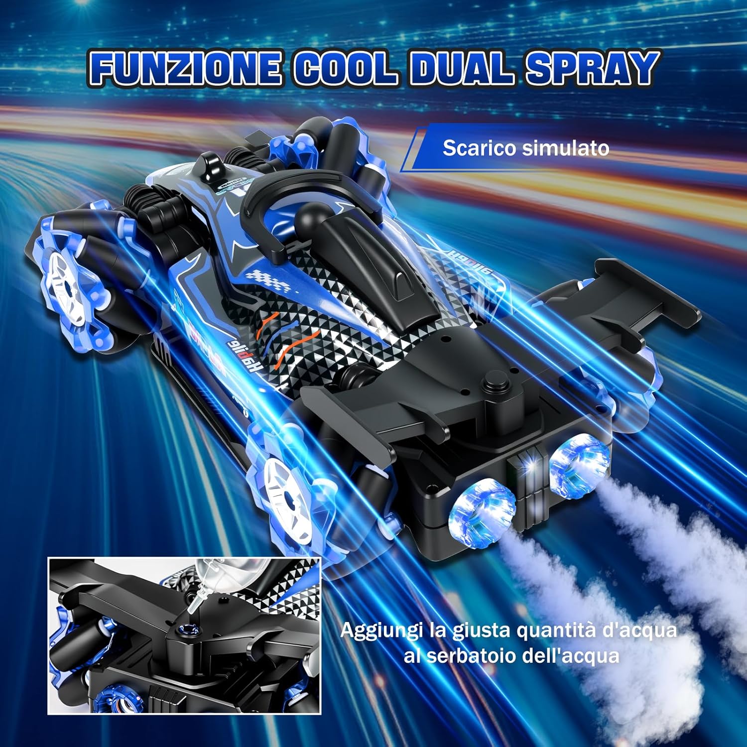 🚗 【Due Modalità Di Controllo】Questa macchina radiocomandata RC Stunt Car è dotata di un telecomando 2,4 GHz ad alta precisione e di un orologio con controllo gestuale innovativo, con un’impressionante portata fino a 50 metri. Può eseguire rotazioni a 360°, movimenti avanti e indietro e manovre di drift complesse. Più macchine radiocomandate possono correre contemporaneamente senza interferenze, permettendo gare emozionanti con famiglia e amici. Il controllo intuitivo tramite l’orologio da polso consente a bambini e adulti di guidare facilmente e con divertimento. 💨 【Effetto Doppio Spruzzo Aggiornato】Il design moderno a doppio ugello crea una nebbia di spruzzo realistica e fine, attiva per circa 10 secondi con arresto automatico per proteggere il motore dal surriscaldamento. La nebbia esce delicatamente dalla parte posteriore della macchina, combinata con luci LED multicolori sulla carrozzeria e sulle ruote, facendo sembrare la macchina una vera auto da corsa su una pista notturna. Questo spettacolo visivo rende ogni gara dinamica ed emozionante, ideale per chi ama l’azione e gli effetti spettacolari, sia bambini che adulti. ⚡ 【Motore Potente 4WD】La carrozzeria robusta in ABS ecologico garantisce durata e stabilità. Dotata di ruote anteriori e posteriori ammortizzate, affronta in sicurezza diversi terreni come erba, sabbia, asfalto o superfici irregolari. Il potente motore doppio consente di raggiungere una velocità massima di 25 km/h e offre prestazioni impressionanti, perfette per accelerazioni rapide e superamento di ostacoli. Questa macchina radiocomandata 4WD unisce velocità, potenza e stabilità per un’esperienza di guida impareggiabile. 🎁 【Accessori Completi】Il set include tutto il necessario per divertirsi subito: macchina radiocomandata ×1, telecomando 2,4 GHz ×1, orologio con controllo gestuale ×1, batterie al litio per la macchina ×2, batterie per telecomando ×2, batterie per orologio ×2, iniettore d’acqua ×1, cacciavite ×1, cavo di ricarica USB ×1. Nessun acquisto aggiuntivo richiesto. Basta aprire la confezione, caricare e iniziare subito la gara. 🏁 【Regalo Per Tutte Le Età】Questa macchina radiocomandata Stunt Car entusiasma sia bambini che adulti grazie alle sue funzioni versatili e all’esperienza di guida coinvolgente. È il regalo perfetto per compleanni, festività, feste, Halloween, Capodanno o Natale. Condividi la gioia della velocità, delle derapate precise e della nebbia spettacolare con i tuoi cari e crea momenti indimenticabili pieni di divertimento ed emozioni.