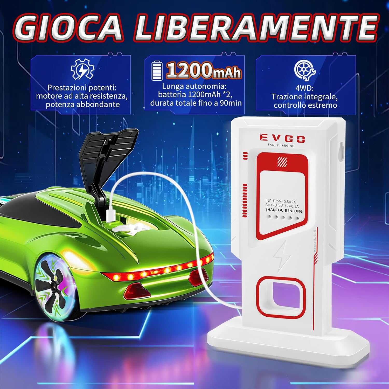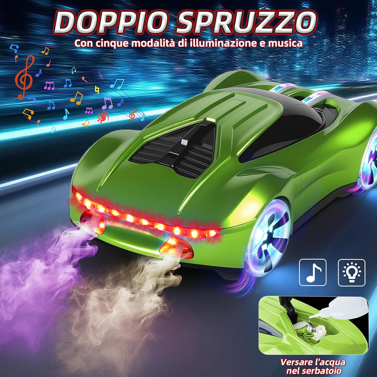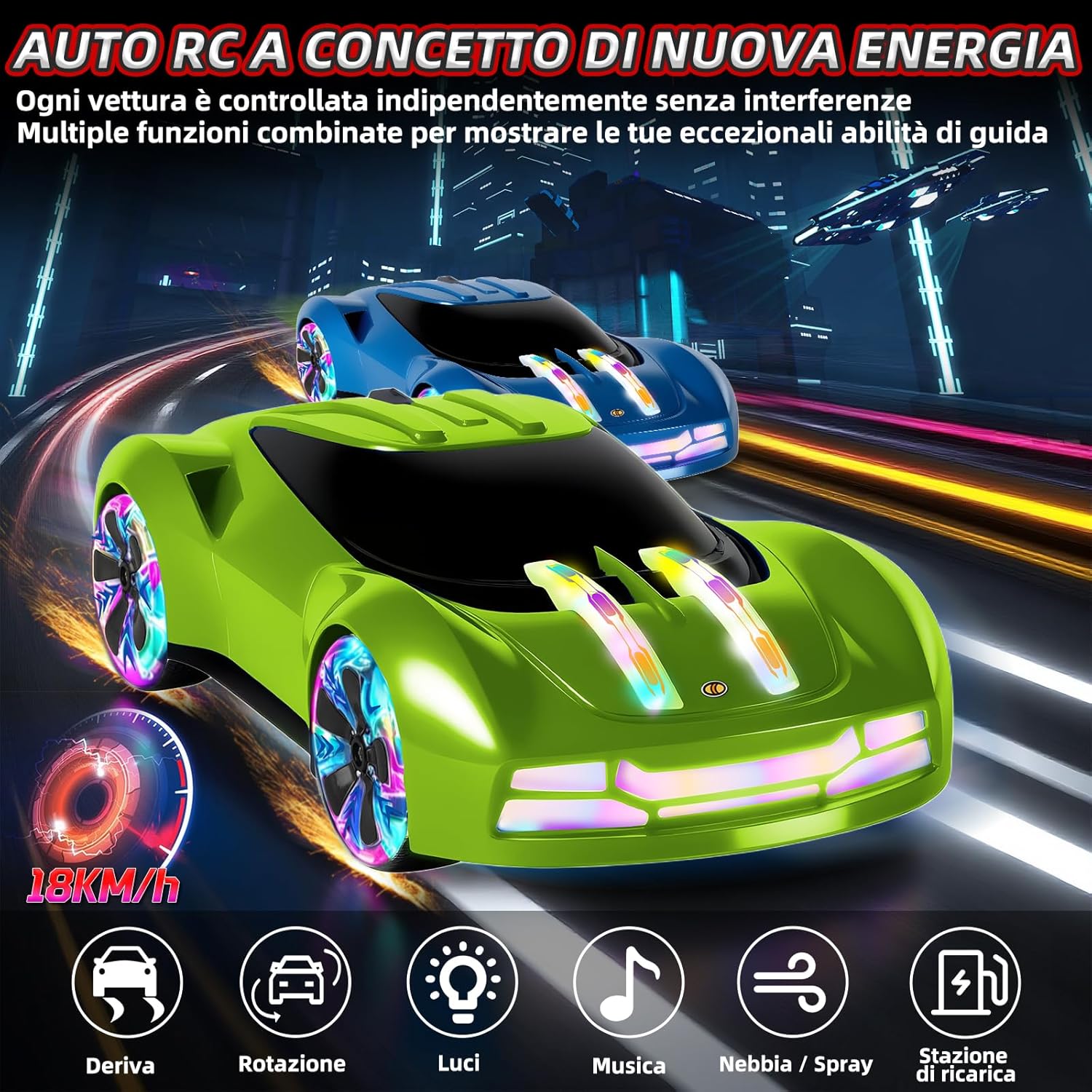 🚙【Modellazione cool】Questa macchina telecomandata è modellata sul nuovo concetto di futuro energetico con una tecnologia di guida innovativa! La carrozzeria dell'RC drift car è dotata di fantastici effetti luminosi, il bordo anteriore dell'auto, i parafanghi superiori e i pneumatici sono dotati di luci a LED e ci sono cinque modalità di illuminazione che possono essere liberamente commutate per sperimentare effetti visivi fantastici. L'auto radiocomandata è anche dotata di un doppio spruzzatore. Basta iniettare acqua pulita nel serbatoio posteriore per rilasciare una nebbia d'acqua fredda durante la corsa, rendendo ogni controllo uno spettacolo visivo che lascia! 🚗【Emozionante auto acrobatica】Questa macchina telecomandata drift può eseguire una virata ad angolo morto di 360°, sprint/inversione, deriva a destra e a sinistra e altre acrobazie difficili, con musica dinamica, effetti di luce brillanti e rilascio di doppio spray per creare un'esperienza di gara coinvolgente con luci e ombre che si intrecciano sullo schermo d'acqua. Il nostro telecomando utilizza un'alta frequenza di 2,4 GHz, in grado di fornire un segnale stabile entro 40 metri, e consente a più persone di controllare l'auto da RC drift contemporaneamente senza interferire l'una con l'altra. Il telecomando richiede due batterie AA (non incluse). 🚙【Performance ad alta velocità】Questa macchina telecomandata per bambini è dotata di un sistema di trazione 4WD con un motore ad alte prestazioni, forte potenza, forte forza motrice, velocità fino a 18km/h, con tecnologia di controllo omnidirezionale a 360 °, sia che si tratti di uno sprint in linea retta, estrema deriva o serpentina a piedi, può mostrare la sterzata liscia come la seta e il controllo preciso, che può lasciare che i vostri bambini per mostrare le loro abilità in una gara con gli amici. Questa deriva RC, adatta ai bambini dai 6 anni in su, offre ai bambini divertimento e sorprese come mai prima d'ora! 🚗【Nuova colonna di ricarica】Questa auto giocattolo macchinina telecomandata ha una porta Type-C, che può essere caricata direttamente attraverso la colonna di ricarica, o la batteria può essere rimossa e caricata con un cavo di ricarica. Forniamo due batterie ricaricabili da 1200 mAh macchina radiocomandata per bambini, ogni batteria può essere completamente caricata per 40 minuti di gioco, quando la prima batteria è vuota, la seconda batteria ha già finito di immagazzinare energia nella colonna di ricarica, i bambini possono godere di inscenare una gara di resistenza alla deriva per 80 minuti +, creando un'esperienza di guida coinvolgente per i bambini! 🚙【Regalo perfetto per i bambini】Questa auto telecomandata da 6 anni è realizzata in materiale ABS di alta qualità, flessibile e antiurto, non facile da essere danneggiato da un impatto, in modo che i tuoi bambini possano giocare a casa, in giardino, al parco e in altri luoghi senza preoccupazioni. Questa macchinina è perfetta come regalo di compleanno, sorpresa per la festa dei bambini o regalo di Natale. Adatto per i bambini di età superiore ai 6 anni o gli adulti possono facilmente iniziare gli appassionati di drifting per sperimentare il controllo fresco, i principianti possono anche rapidamente padroneggiare il divertimento di guida, aprire la gioia del tempo di corsa illimitato!