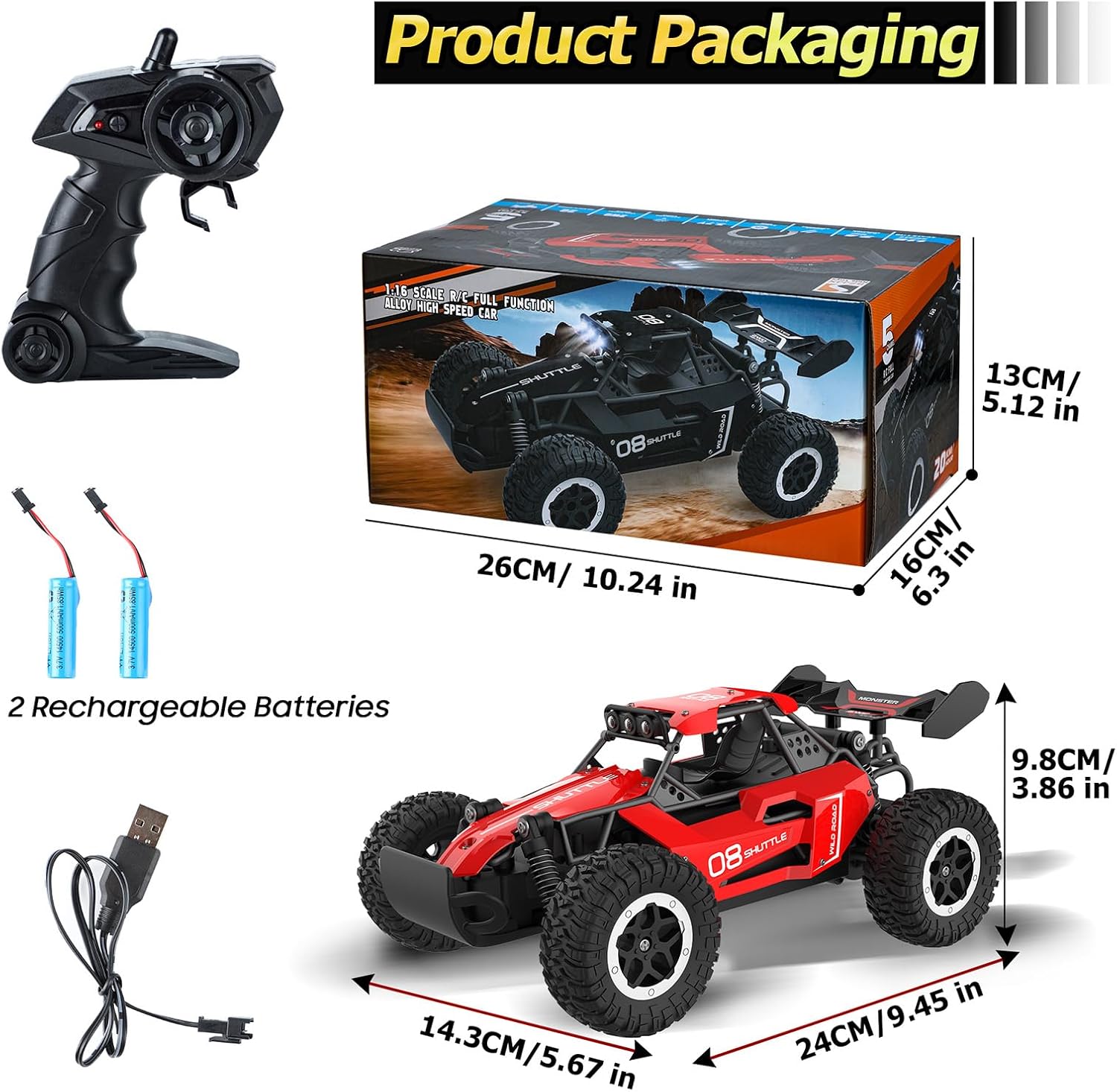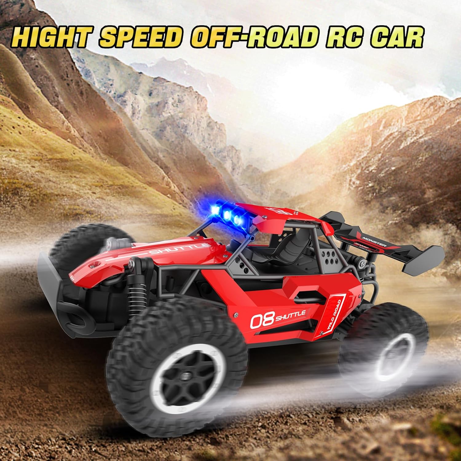 🚗 Fari a LED dinamici: questa macchinina radiocomandata è dotata di 3 fari a LED colorati con 4 modalità (blu, rosso, verde e spento) per aggiungere ulteriore entusiasmo durante il gioco. Guarda le luci brillare mentre i bambini sfrecciano nelle loro avventure! 🏎️ Corpo in lega stabile e prestazioni su tutti i terreni: costruita con un robusto corpo in lega, questa macchinina radiocomandata è progettata per durare a lungo. Le ruote ammortizzanti garantiscono una guida fluida su tutte le superfici, inclusi terra, erba e ghiaia, così il divertimento non finisce mai, né all'interno né all'esterno. 🎮 Telecomando avanzato a 2,4 GHz: con un sistema anti-interferenza a 2,4 GHz, questa macchinina radiocomandata permette ai bambini di gareggiare con più macchinine contemporaneamente senza interferenze. La portata di 40 metri garantisce gare emozionanti in aree di gioco più ampie. 🔋 Tempo di gioco più lungo con batterie ricaricabili: goditi 20-30 minuti di gioco con due batterie ricaricabili incluse. Il cavo di ricarica facile da usare garantisce una configurazione rapida, così il tuo bambino può entrare subito in azione! 🚀 Divertimento ad alta velocità: in grado di raggiungere i 20 km/h, questo camion radiocomandato a 2 ruote motrici offre un'esperienza di guida esaltante. Il design in scala 1:16 offre ai bambini un'esperienza di guida autentica ed emozionante. 🎁 Regalo perfetto per bambini dai 3 anni in su: questo monster truck telecomandato è un regalo ideale per bambini e bambine dai 3 ai 8 anni, perfetto per compleanni, Natale, la Festa dei Bambini o qualsiasi occasione speciale. Regala velocità, divertimento ed emozione!
