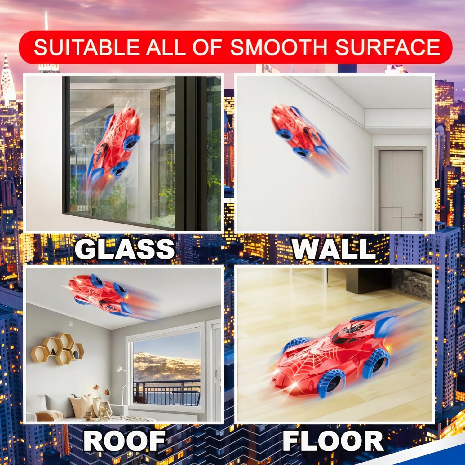 1. Guida su pareti o pavimenti: questa macchina telecomandata si muove su tutte le superfici lisce, inclusi muri, soffitti, finestre, specchi e armadi, ogni luogo può essere utilizzato come campo di gioco. 2. La macchina telecomandata può muoversi in diverse direzioni, andare avanti, indietro, girare a sinistra, a destra sul muro e a terra. Offrono un'esperienza diversa. 3. Luce brillante: le luci anteriori evidenziate e le luci nere della macchina telecomandata, giocano al buio, senza ostacoli. I fanali anteriori e posteriori si accendono quando si gira a sinistra; le luci sul lato destro si accendono quando si gira a destra. Creando un divertimento senza fine per i bambini. 4. Realizzata con materiali leggeri di alta qualità in modo che la macchina radiocomandata possa guidare saldamente e stabilmente sulla parete, materiali ABS resistenti che garantiscono un'elevata resistenza agli urti e una carrozzeria robusta e antiurto. 5. È possibile caricare la macchina telecomandata tramite il telecomando dotato di cavo di ricarica, ma può anche essere ricaricata tramite la spina, la batteria del laptop, il laptop, ecc. Con il cavo USB incluso.