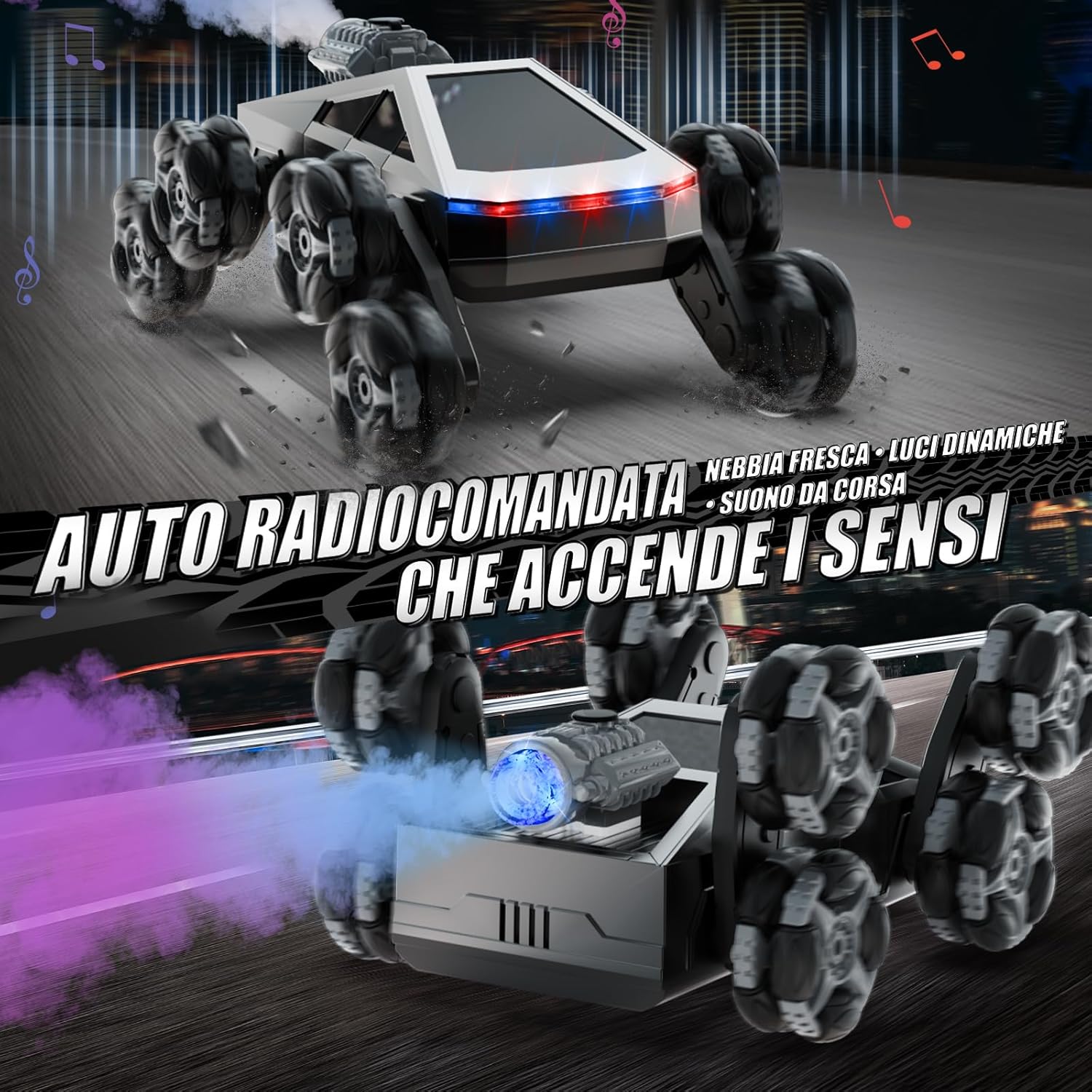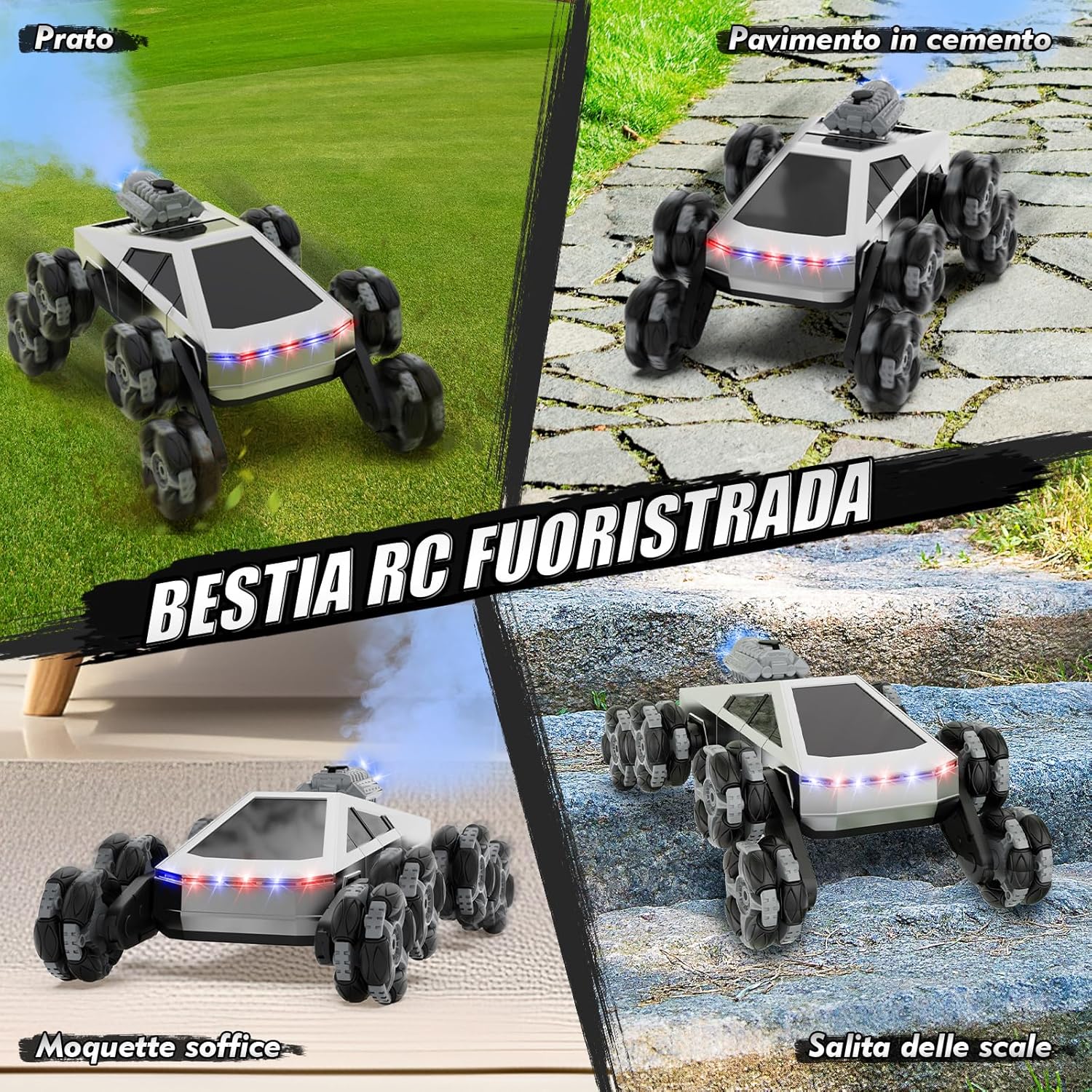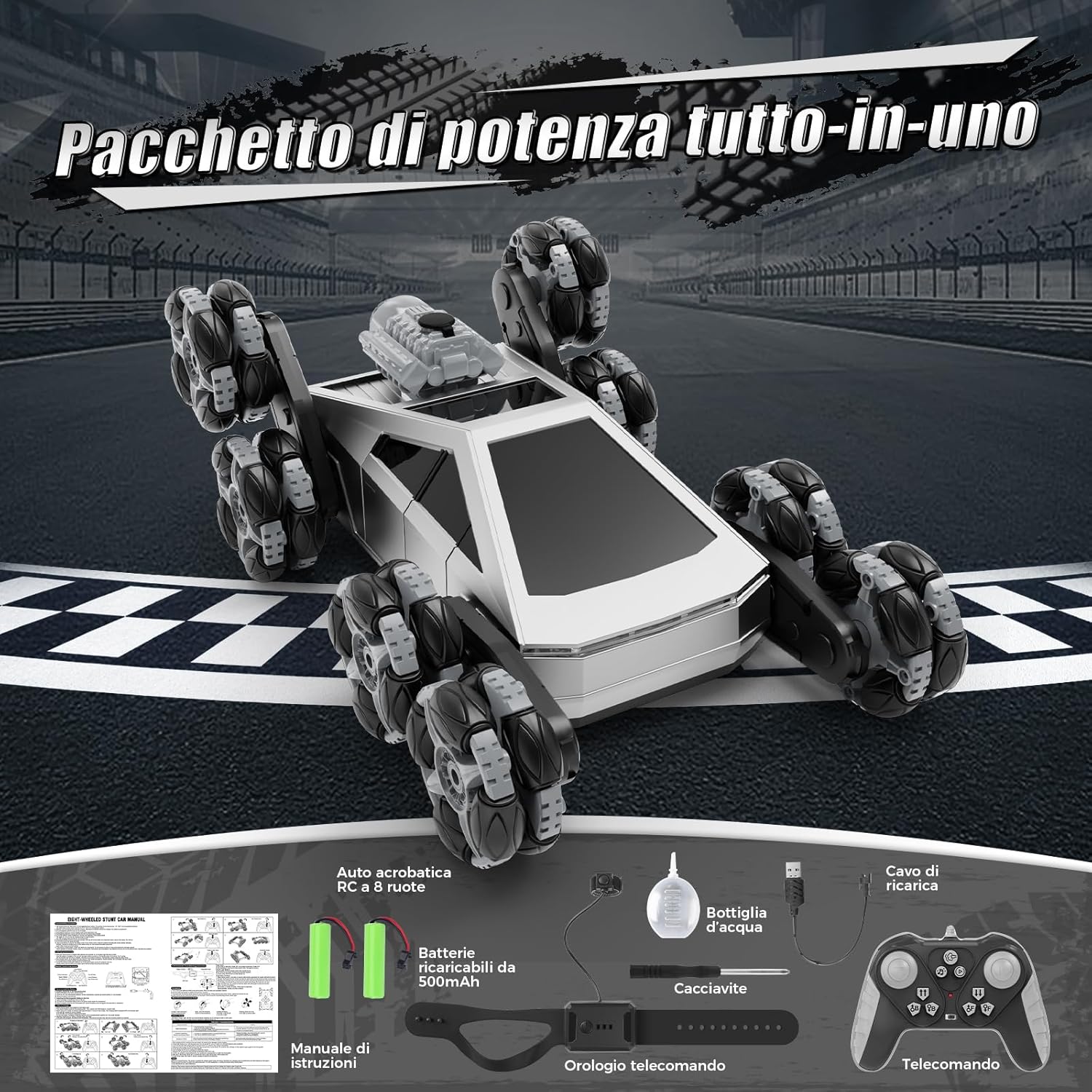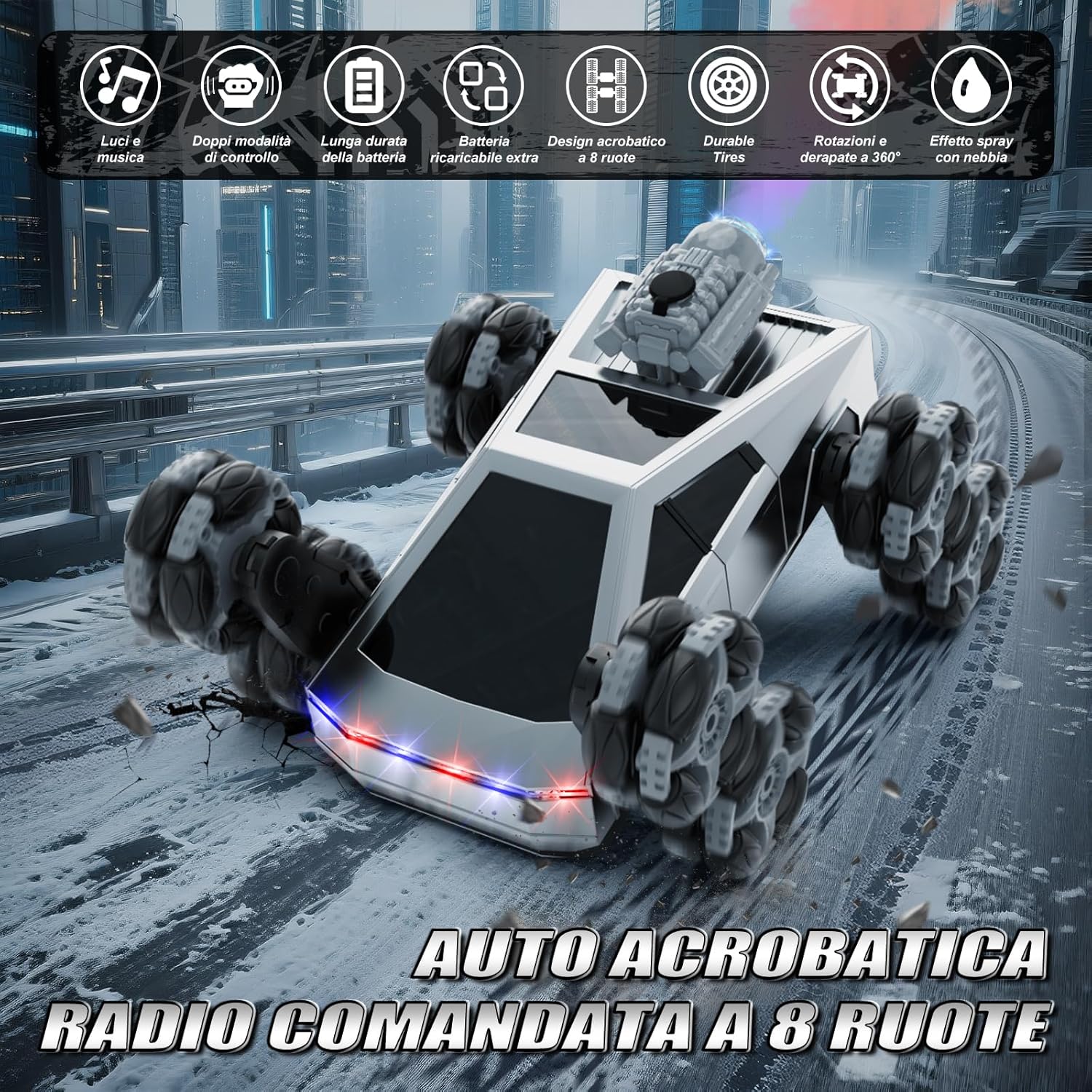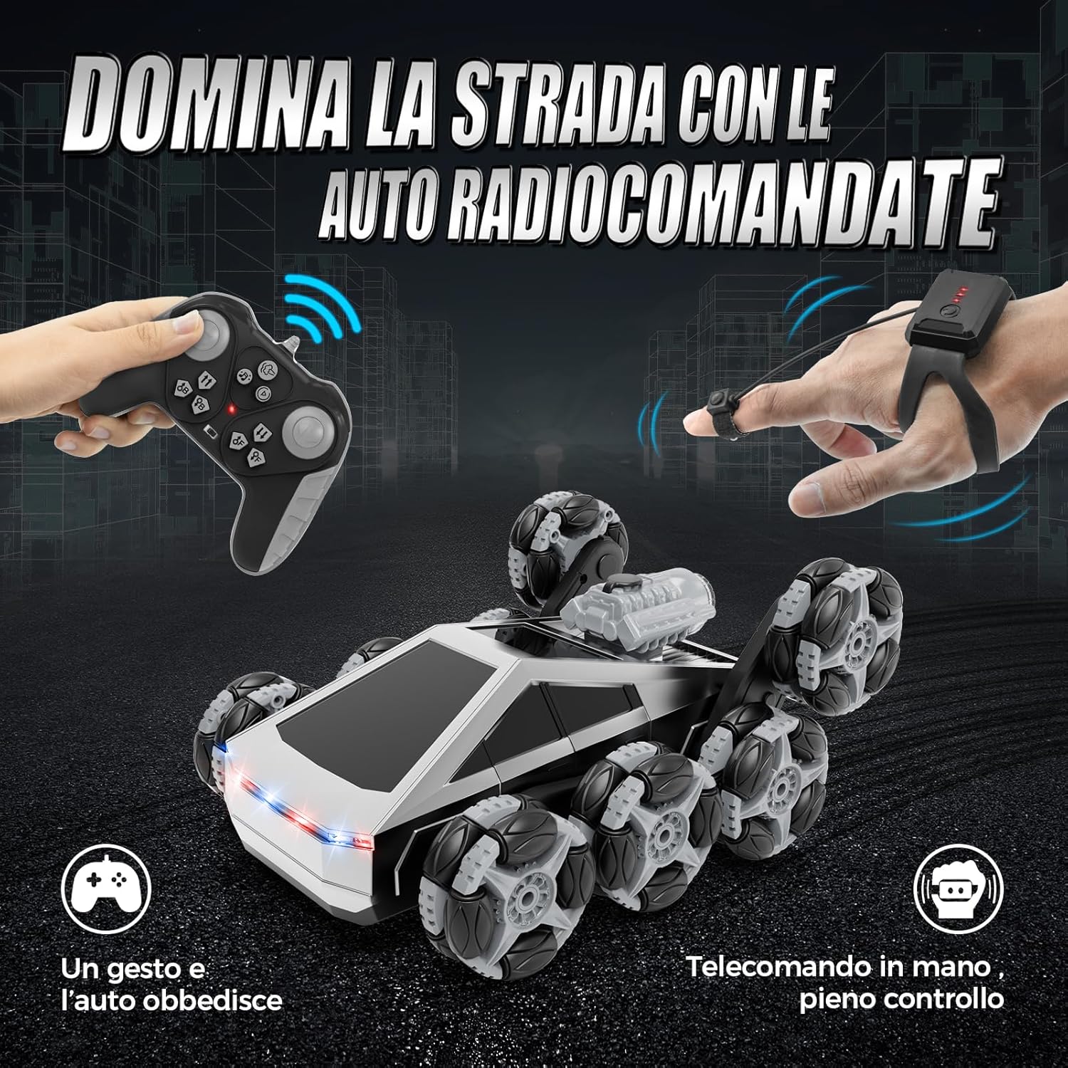 Auto RC Acrobatica 8 Ruote Tutto-Terreno: L’auto RC 8 ruote è progettata per l’azione, con ruote trasformabili che superano facilmente scale, prato, ghiaia e tappeti. I bambini possono divertirsi con rotazioni a 360°, drifting e acrobazie spettacolari – la macchina telecomandata perfetta per bambini dai 4 ai 14 anni Design Trasformabile Stunt: Questa macchina telecomandata 8 ruote può cambiare forma in più modalità, creando infinite possibilità di gare e acrobazie. Un’auto RC unica con controllo gestuale che stimola la creatività e offre divertimento senza fine ai piccoli amanti delle macchine telecomandate Nebbia, Luci & Musica: Con funzione spray, luci LED e effetti sonori, l’auto RC 8 ruote rende ogni corsa più realistica ed emozionante. I bambini adoreranno questa macchina telecomandata acrobatica, perfetta per il gioco sia in casa che all’aperto Doppia Modalità di Controllo: Dotata di telecomando 2.4GHz e di orologio con sensore di movimento, questa auto RC 8 ruote offre un controllo fluido e reattivo fino a 30 metri, senza interferenze di segnale. Più macchine RC possono correre insieme – ideale per sfide in famiglia e con gli amici Batteria Ricaricabile: Questa macchina RC include 2 batterie ricaricabili da 3.7V, per un tempo di gioco prolungato. Con la ricarica rapida USB e la protezione da sovraccarico, è sicura e facile da usare per i bambini. Nota: il telecomando richiede 2 batterie “AA” da 1.5V non ricaricabili (non incluse), mentre l’orologio telecomando include 1 batteria “AAA” da 1.5V non ricaricabile. L’auto acrobatica a 8 ruote offre un divertimento continuo sia in casa che all’aperto Regalo Perfetto per Bambini: Un regalo divertente e sorprendente per bambini dai 5 ai 12 anni – ottimo come regalo di compleanno, regalo di Natale, Halloween o altre festività. Con design resistente e tutto-terreno, questa macchina RC 8 ruote è un giocattolo ideale per ragazzi e ragazze