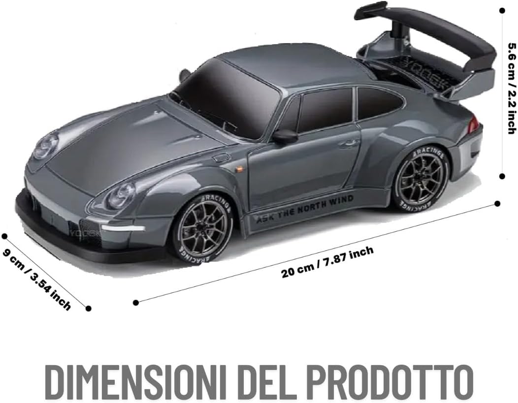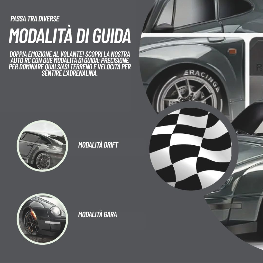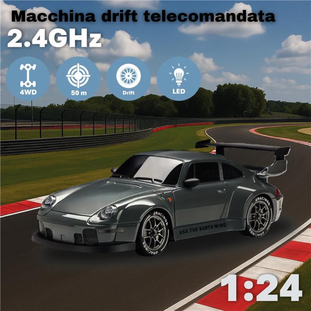 🚗 Scatena la Velocità e il macchina telecomandata! Motore potente 4WD ad alta velocità che garantisce prestazioni eccezionali e un'accelerazione rapida e incredibile. Quattro ruote motrici che distribuisce la pontenza durante la forma per una derapata fluida. noltre, puoi controllare l'auto senza interferenze, con totale stabilità per una guida fluida ed emozionante su diverse superfici. 🚗 Telecomando ergonomico e wireless a 2,4 GHz. Assicura una connessione stabile, con una portata fino a 50 metri, permettendo un'ampia area di gioco senza perdita di segnale. lunga durata. Goditi ore di gioco continuo con una sola carica (500 mAh) Struttura resistente e design curato. Progettata per resistere a gare intense e urti, garantendo una lunga durata grazie al materiale ABS di alta qualità. Dotata di pneumatici ad alta aderenza e color grigio elegante che le conferisce un aspetto moderno e realistico. Perfetta per drifting su diverse superfici, con un’aderenza eccezionale e grande stabilità. ✨ Illuminazione realistica e dettagli sorprendenti. Illumina le tue gare notturne con luci LED anteriori e posteriori integrate, che aggiungono realismo e stile alla tua auto. Aggiungi sfide personalizzate con le barriere stradali incluse per un’esperienza di gioco ancora più completa. Auto telecomanda drift dotato di fari, luci posteriori e luci sottoscocca. ¡Migliora di notte! 🛠️ Auto drift ad alta velocitá. Dimensioni e scala 1:24. Dimensioni compatte ma dettagliate, perfette per spazi ridotti e facili da maneggiare per i bambini. Circa 20 cm di lunghezza, 10 cm di larghezza e 8 cm di altezza, con un ottimo equilibrio tra maneggevolezza e realismo. Sospensione regolabile per assorbire gli impatti e mantenere stabilità durante i salti e le manovre veloci. 🚗 Funzioni extra. Progettata specificamente per il drifting, consente derapate spettacolari e curve strette. Il controllo della velocità ti permette di adattare la corsa al tuo livello e alle tue preferenze. 🚗 Divertimento e intrattenimento. Ore di divertimento attivo, lunga durata, telecomando intuitivo, design ecologico ed ergonomico. Il regalo perfetto per ogni occasione, ideale per bambini appassionati di tecnologia e velocità. 🎁 Il regalo perfetto per piccoli avventurieri. Macchina Telecomandata RC Drift per Bambini e bambine dagli 8 anni in su. Favorisce la coordinazione, le abilità motorie e la creatività. Perfetto per compleanni, Natale o Halloween.