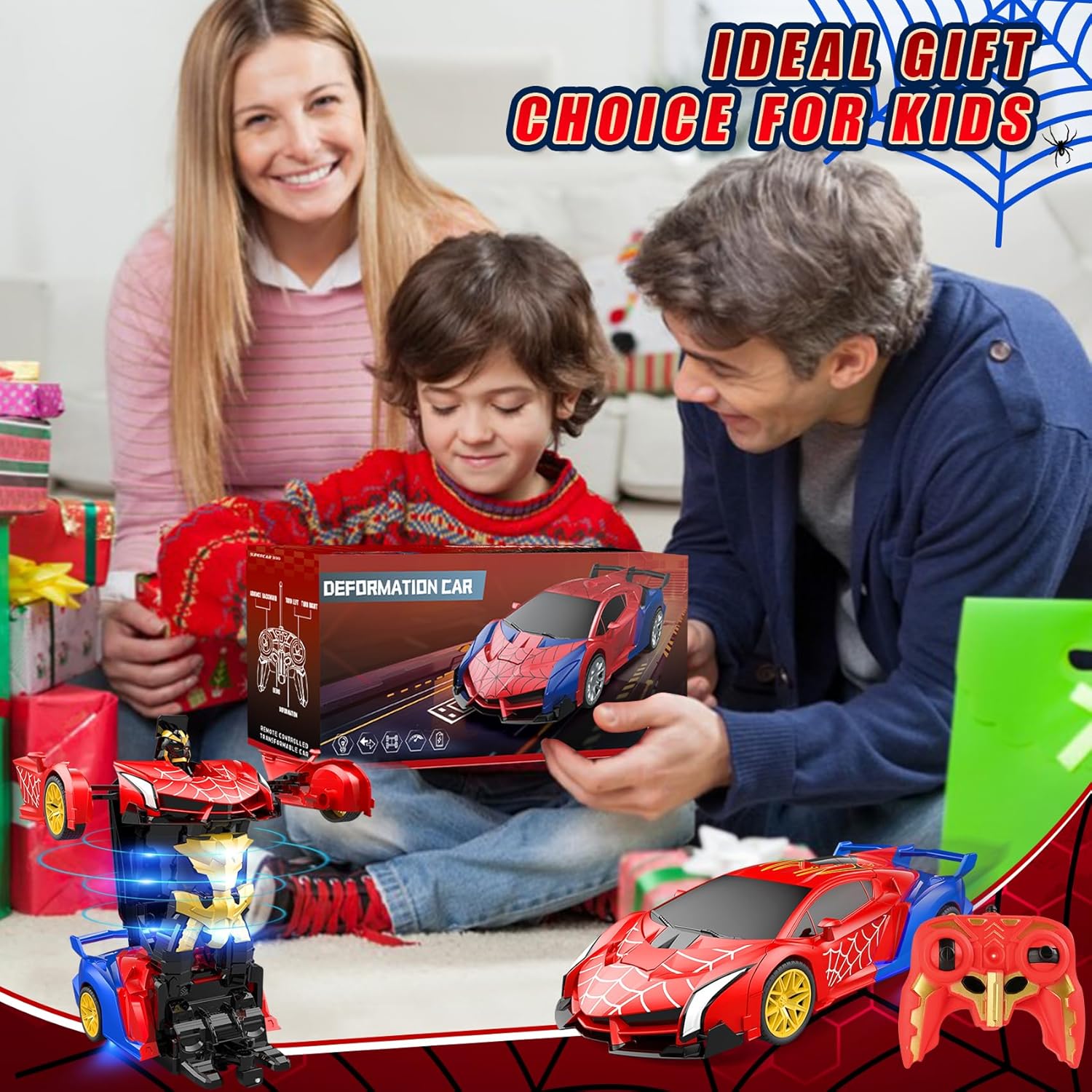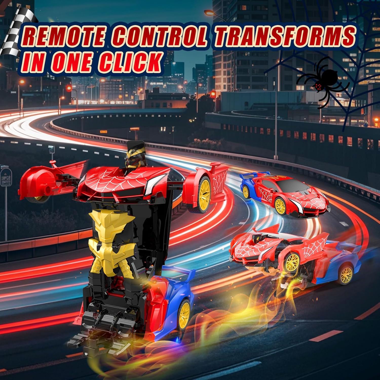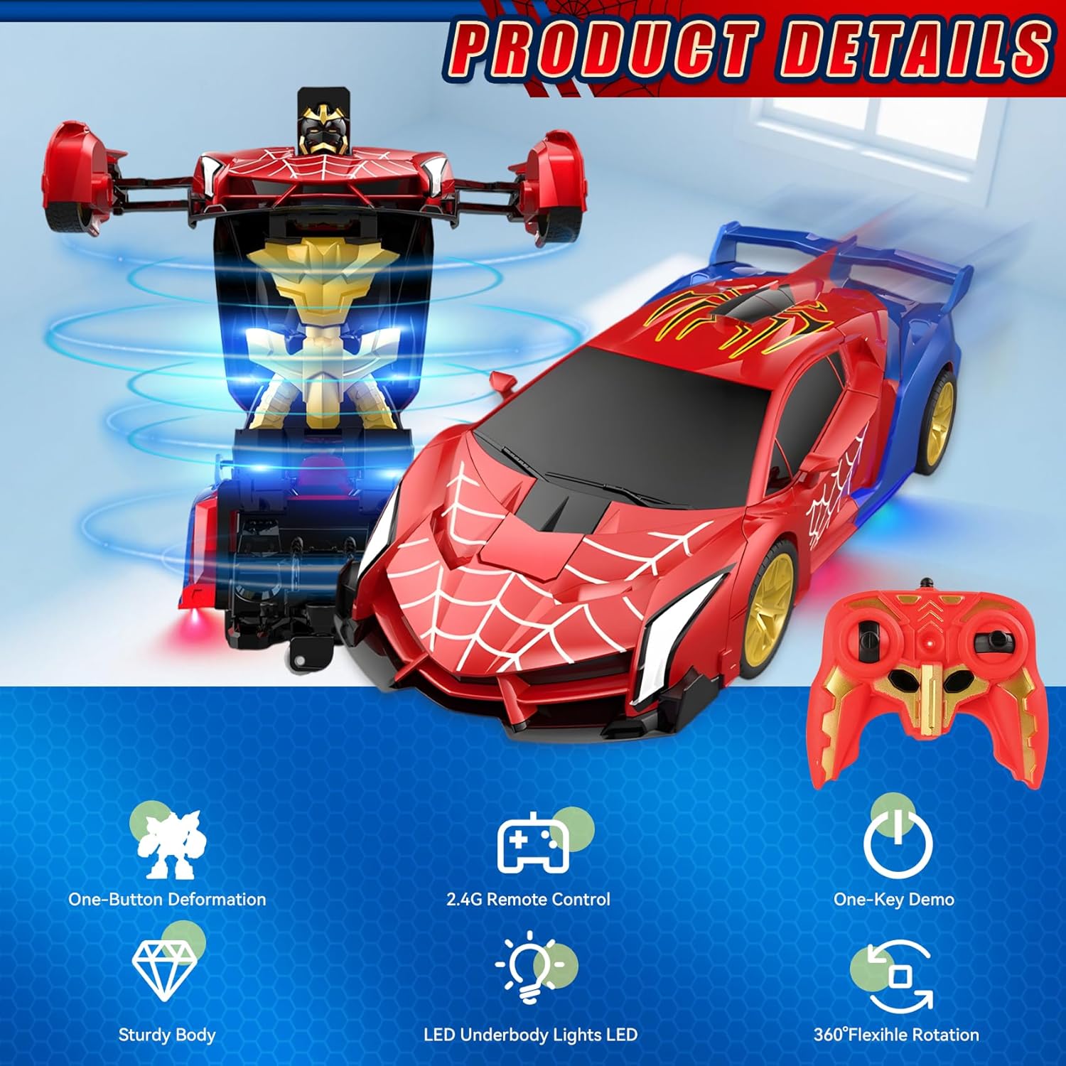 Robot Auto Telecomandata 2 in 1 Trasformabile: Riceverai 1* macchina spider robot telecomandata, 1* telecomando, 1* cacciavite. Questo giocattolo RC include una batteria ricaricabile; il telecomando richiede 2 batterie AA (non incluse). La nostra macchina spider trasformabile vanta un classico schema di colori rosso e blu con vernice inodore per un'esperienza di guida unica. Design Robusto e Sicuro per i Bambini: Realizzata in materiale ABS di alta qualità, questa macchina telecomandata spider è robusta, duratura e sicura per i bambini. Il suo corpo antiurto assicura un'eccezionale resistenza agli impatti, rimanendo in condizioni eccellenti anche dopo ripetuti incidenti, garantendo un divertimento duraturo. Giocattolo Educativo per Bambini dai 3 Anni: Questo auto robot trasformabile è adatto a bambini e bambine a partire da 3 anni. Si distingue per la facilità d'uso e il design a misura di bambino. Combina le funzioni di auto e robot per un gioco creativo, stimolando l'immaginazione e le capacità motorie. Trasformazione con un Tocco & Rotazione 360°: La nostra macchina RC trasformabile cambia modalità (auto o robot) con la pressione di un solo tasto. Una ruota omnidirezionale flessibile sotto il veicolo permette una rotazione 360° in entrambe le modalità, lasciando i bambini a bocca aperta con le sue dinamiche capacità. Spettacolare Illuminazione LED per Avventure Notturne: La nostra macchina telecomandata trasformabile è dotata di luci LED sotto il telaio, che proiettano fasci di luce rossa e blu alternati, illuminando ogni avventura, giorno e notte. Perfetta per emozionanti missioni notturne o come attrazione principale alle feste di compleanno. Sistema Radio 2.4 GHz per Gare senza Interferenze: Questo robot trasformabile 2 in 1 è equipaggiato con un sistema 2.4 GHz che garantisce un segnale stabile e una portata estesa. Permette a più bambini di giocare contemporaneamente senza interferenze. Il Regalo Perfetto per Piccoli Appassionati di Auto RC: Progettata per bambini dai 3 ai 9 anni, questo giocattolo telecomandato unisce una finitura squisita a funzionalità super cool. È il regalo ideale per compleanni, Natale, Pasqua o la Festa del Bambino, e farà brillare gli occhi dei piccoli piloti.