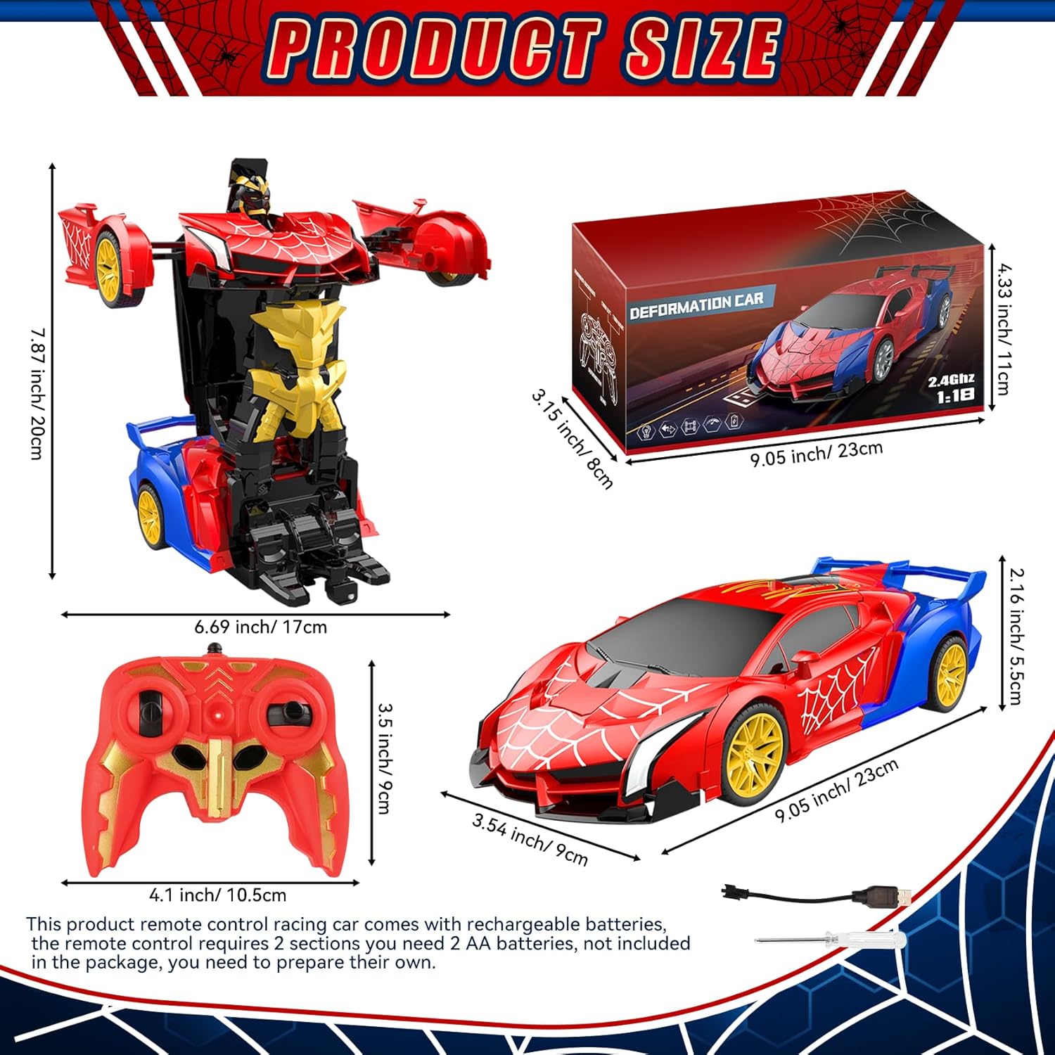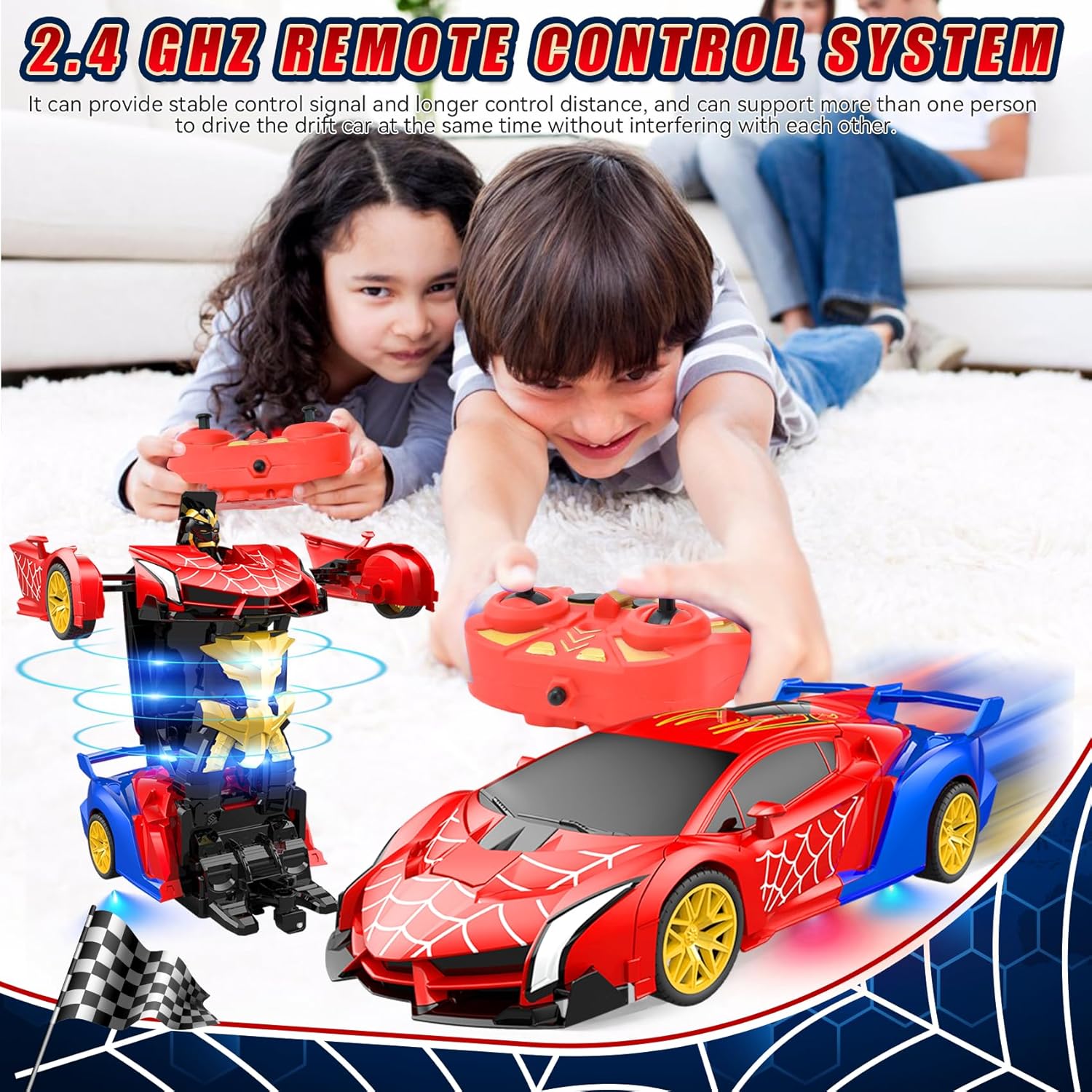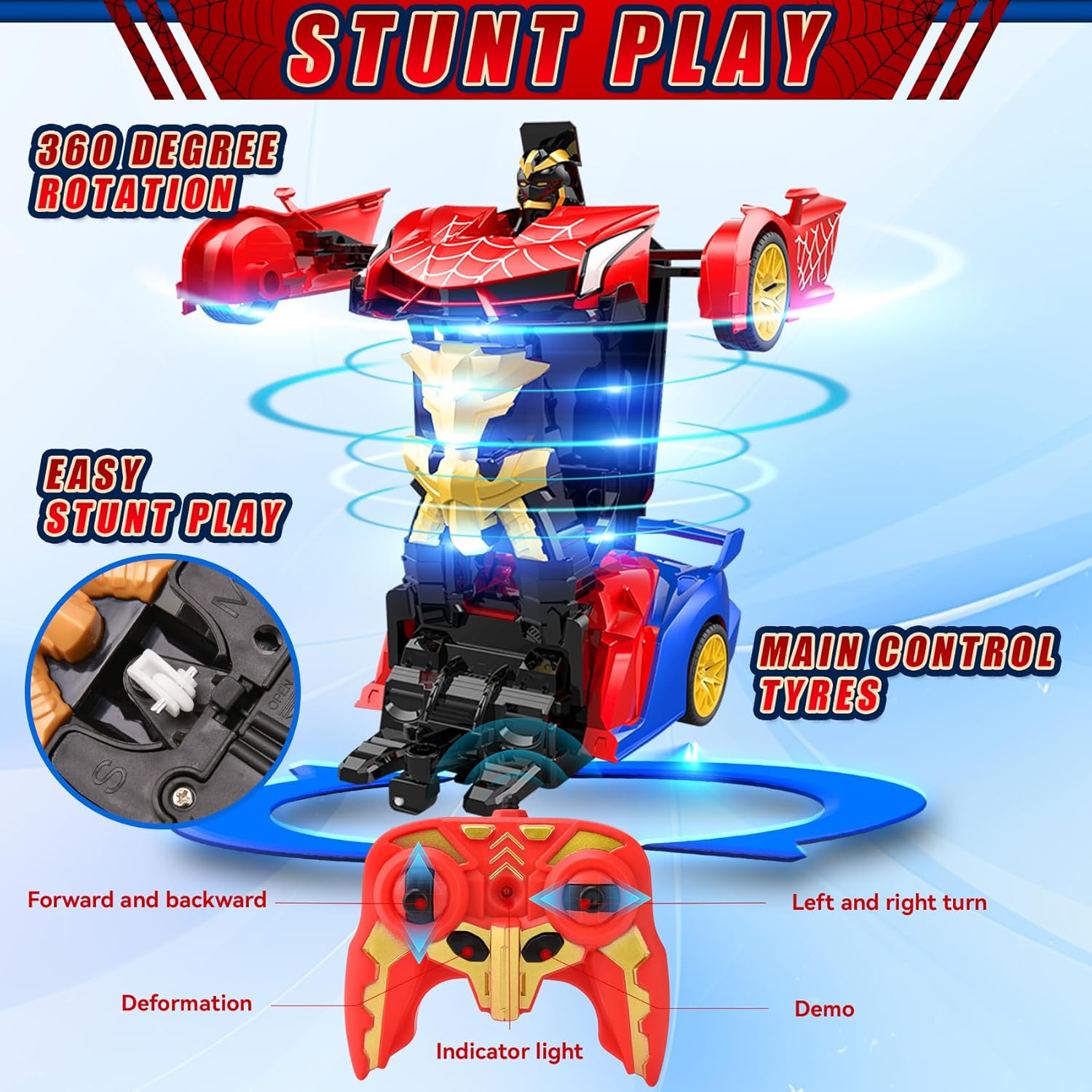Robot Auto Telecomandata 2 in 1 Trasformabile: Riceverai 1* macchina spider robot telecomandata, 1* telecomando, 1* cacciavite. Questo giocattolo RC include una batteria ricaricabile; il telecomando richiede 2 batterie AA (non incluse). La nostra macchina spider trasformabile vanta un classico schema di colori rosso e blu con vernice inodore per un'esperienza di guida unica. Design Robusto e Sicuro per i Bambini: Realizzata in materiale ABS di alta qualità, questa macchina telecomandata spider è robusta, duratura e sicura per i bambini. Il suo corpo antiurto assicura un'eccezionale resistenza agli impatti, rimanendo in condizioni eccellenti anche dopo ripetuti incidenti, garantendo un divertimento duraturo. Giocattolo Educativo per Bambini dai 3 Anni: Questo auto robot trasformabile è adatto a bambini e bambine a partire da 3 anni. Si distingue per la facilità d'uso e il design a misura di bambino. Combina le funzioni di auto e robot per un gioco creativo, stimolando l'immaginazione e le capacità motorie. Trasformazione con un Tocco & Rotazione 360°: La nostra macchina RC trasformabile cambia modalità (auto o robot) con la pressione di un solo tasto. Una ruota omnidirezionale flessibile sotto il veicolo permette una rotazione 360° in entrambe le modalità, lasciando i bambini a bocca aperta con le sue dinamiche capacità. Spettacolare Illuminazione LED per Avventure Notturne: La nostra macchina telecomandata trasformabile è dotata di luci LED sotto il telaio, che proiettano fasci di luce rossa e blu alternati, illuminando ogni avventura, giorno e notte. Perfetta per emozionanti missioni notturne o come attrazione principale alle feste di compleanno. Sistema Radio 2.4 GHz per Gare senza Interferenze: Questo robot trasformabile 2 in 1 è equipaggiato con un sistema 2.4 GHz che garantisce un segnale stabile e una portata estesa. Permette a più bambini di giocare contemporaneamente senza interferenze. Il Regalo Perfetto per Piccoli Appassionati di Auto RC: Progettata per bambini dai 3 ai 9 anni, questo giocattolo telecomandato unisce una finitura squisita a funzionalità super cool. È il regalo ideale per compleanni, Natale, Pasqua o la Festa del Bambino, e farà brillare gli occhi dei piccoli piloti.
