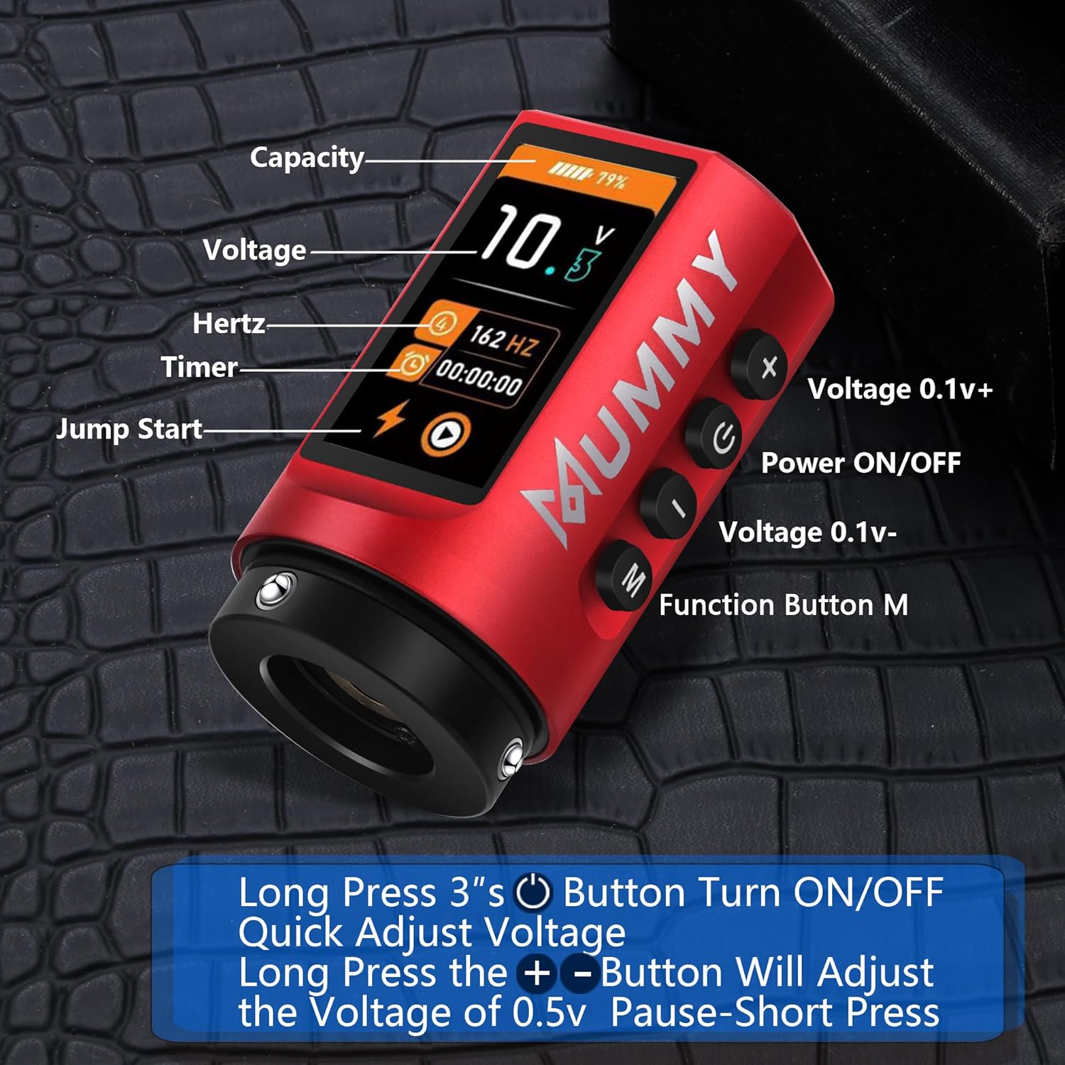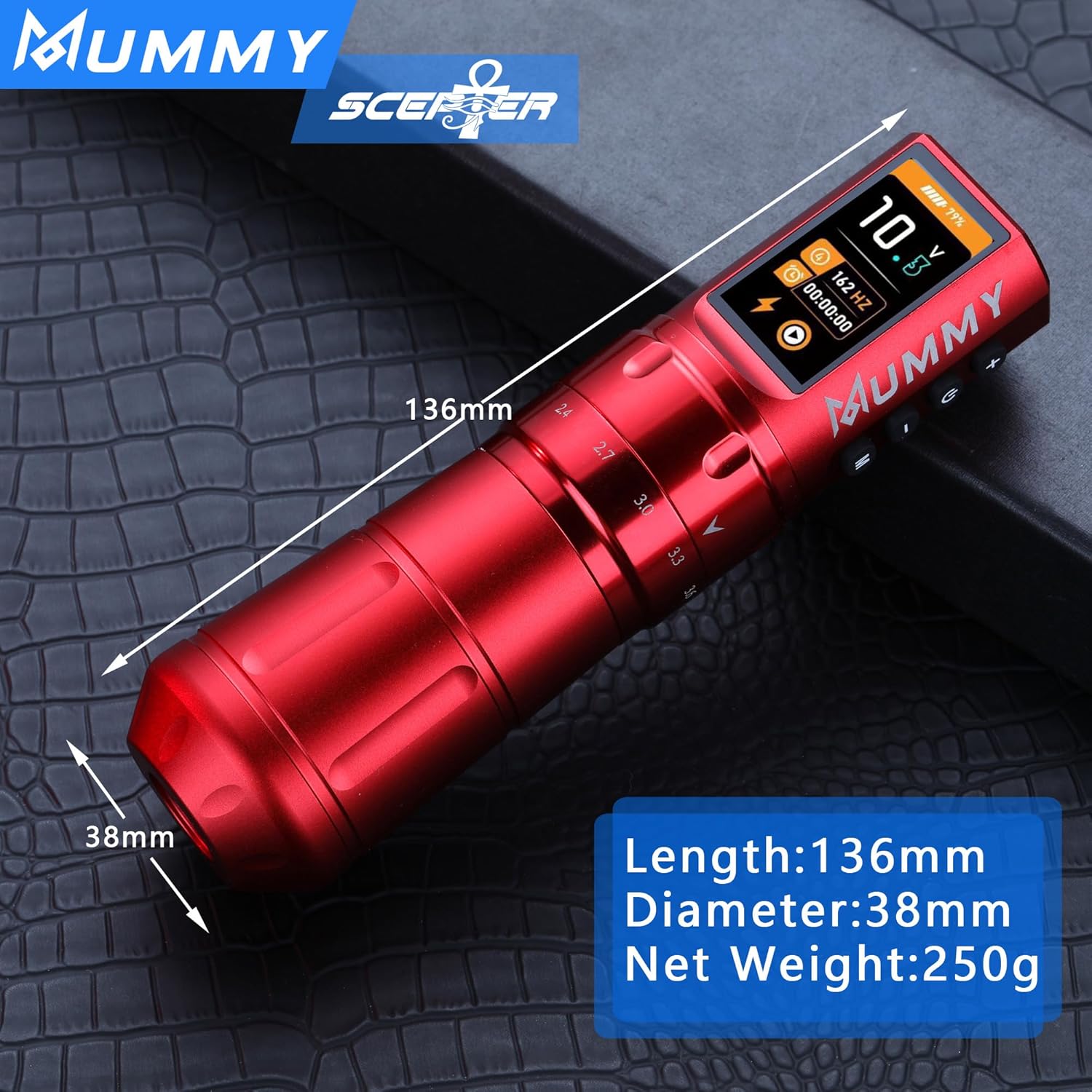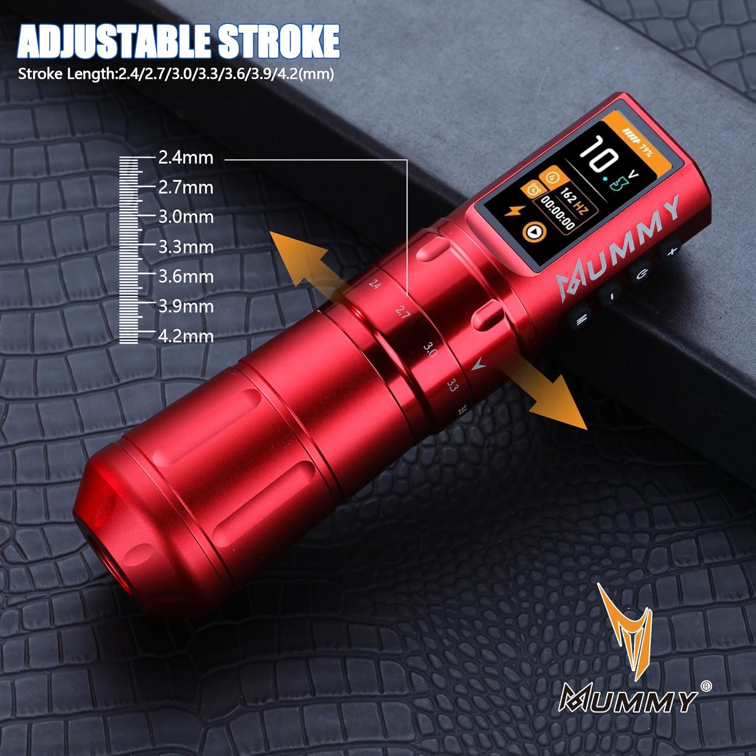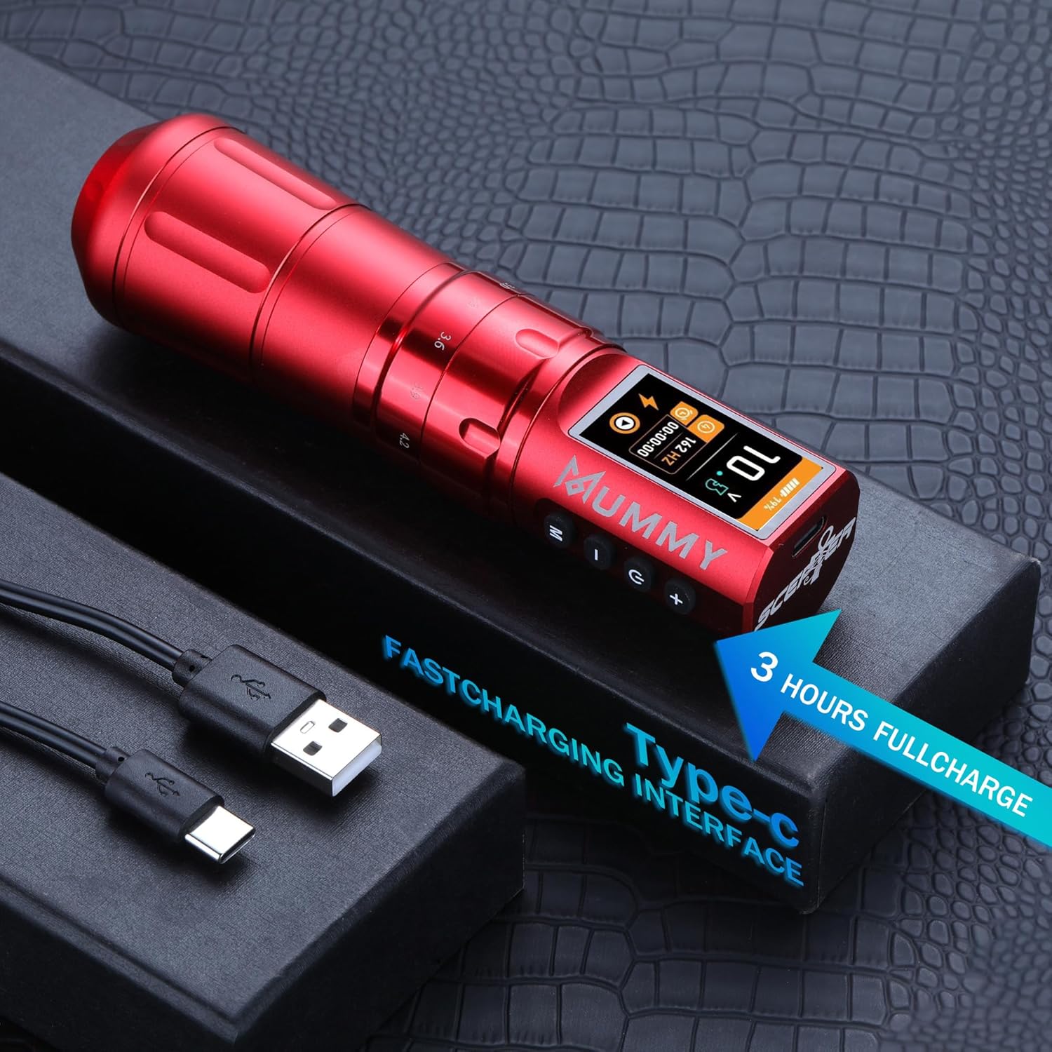 Perché sceglierla: se desideri lavorare con una penna con punta più comoda e super facile da usare, allora questa fantastica penna con corsa regolabile è la scelta migliore per te. Batteria ad alta capacità: batteria ai polimeri (1800 mAh), richiede 2-3 ore per la ricarica completa (non sovraccaricare), funziona per più di 5-7 ore. Ma il caricabatterie USB C è disponibile per ingresso: 100-240 V 50/60 Hz, tensione in uscita: 5 V/1 A, 5 V/1,5 A, 5 V/3 A; (non compatibile con caricabatterie rapidi): 9 V/1,5 A, 9 V/2 A, 12 V/1,5 A, 12 V/2 A, ecc. Tatuaggi, PMU e SMP con macchinetta per tatuaggi - Mummy Scepter offre 7 tratti: 2,4/2,7/3,0/3,3/3,6/3,9/4,2 mm, cambia la corsa ruotando la manopola di regolazione, ti consente di tatuare in qualsiasi stile con facilità Custom Swiss Motore Mummy 12V 8500 RPM con un motore ultra potente e anti-intoppo che consente potenza e durata eccezionali e scivola attraverso la pelle senza impigliarsi o tirare, conferisce alla macchina un eccellente equilibrio tra rivestimento e ombreggiatura ed è perfetto per rivestimenti esigenti e confezionamento di colori. Tensione di avvio: 5 V. Tensione di funzionamento: 4-12 V. Contenuto della confezione: 1 x penna per tatuaggio scettro della mummia + 1 x cavo di ricarica rapida USB-C.