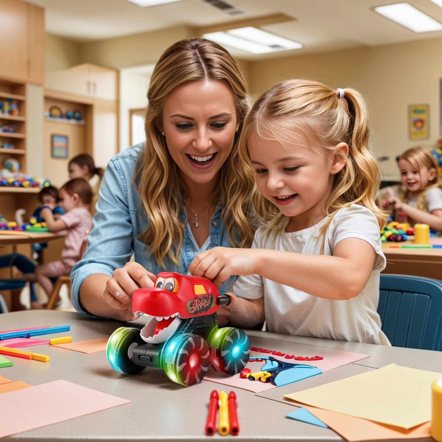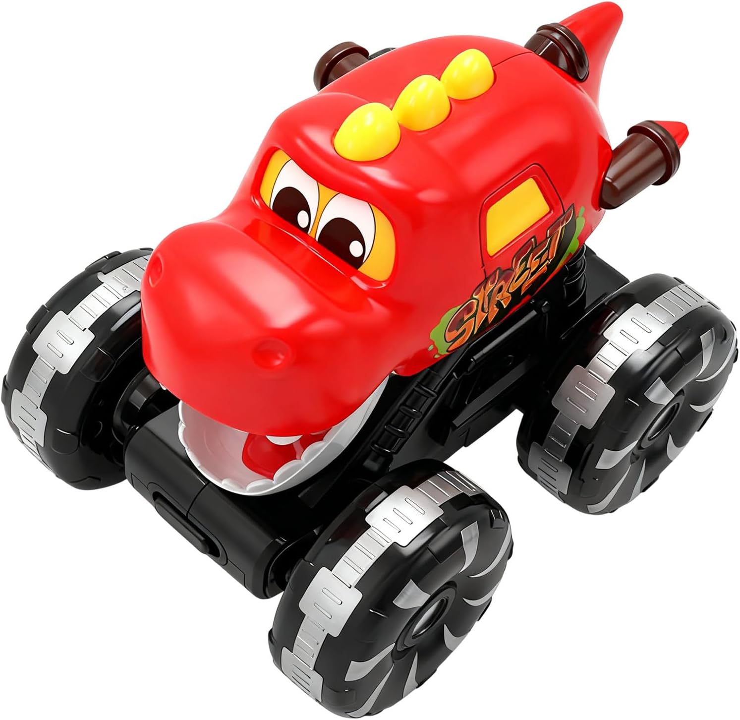 Giocattolo universale per tutti: i camion dei dinosauri offrono un'ampia compatibilità con l'età e incoraggiano il gioco fantasioso nei bambini piccoli, negli adolescenti e negli adulti. Stimolano la curiosità e migliorano le capacità di coordinazione attraverso attività interattive durante feste di compleanno o viaggi del fine settimana. Ciò consente a tutti di partecipare facilmente alle avventure dinamiche dei dinosauri e di essere pienamente coinvolti nell'azione per creare esperienze condivise. Effetti di luce interattivi: il giocattolo dell'auto dinosauro è dotato di ruote multicolori che creano accattivanti effetti di luce e ombra. Questi effetti migliorano le esperienze sensoriali dei bambini e catturano la loro attenzione mentre giocano in ambienti chiusi in condizioni di scarsa illuminazione. Ideale per l'intrattenimento fantasioso in aree scarsamente illuminate, offre un'esperienza di gioco unica che incoraggia la percezione sensoriale e stimola la creatività dei bambini. Il vibrante Lich, regalo insolito e significativo: il giocattolo del camion dei dinosauri è progettato per deliziare i bambini di tutti i tipi ed è un regalo significativo per compleanni, occasioni festive o Natale. Consente ai genitori e ai propri cari di trasmettere il proprio affetto attraverso il gioco interattivo, mentre le sue caratteristiche coinvolgenti garantiscono esperienze divertenti durante le festività natalizie e momenti speciali in famiglia, rendendolo una scelta arricchente per le attività condivise. Macchinina interattiva con dinosauri: la macchinina con dinosauri offre trigger di feedback tattile combinati con una funzione di ruggito push-and-control. Supporta le esigenze del gioco di ruolo e migliora la coordinazione occhio-mano. Ciò garantisce esperienze di gioco dinamiche e coinvolgenti per i giovani esploratori in ambienti diversi. Robuste prestazioni in caso di incidente: le auto dei dinosauri per bambini sono dotate di robusti materiali delle ruote che garantiscono durata e corse fluide su varie superfici, migliorando il tempo di gioco con giochi di avventura simulati. Resistono all'usura dovuta a incidenti ad alta energia e manovre a motore all'interno e all'esterno, garantendo prestazioni affidabili per ore di divertimento in scenari ricchi di azione.