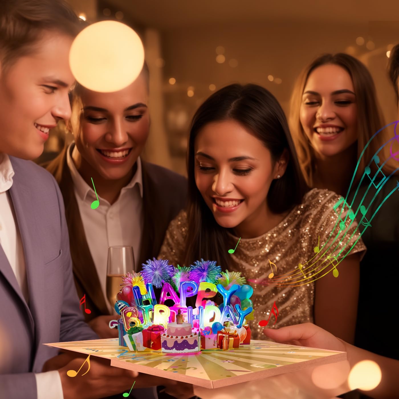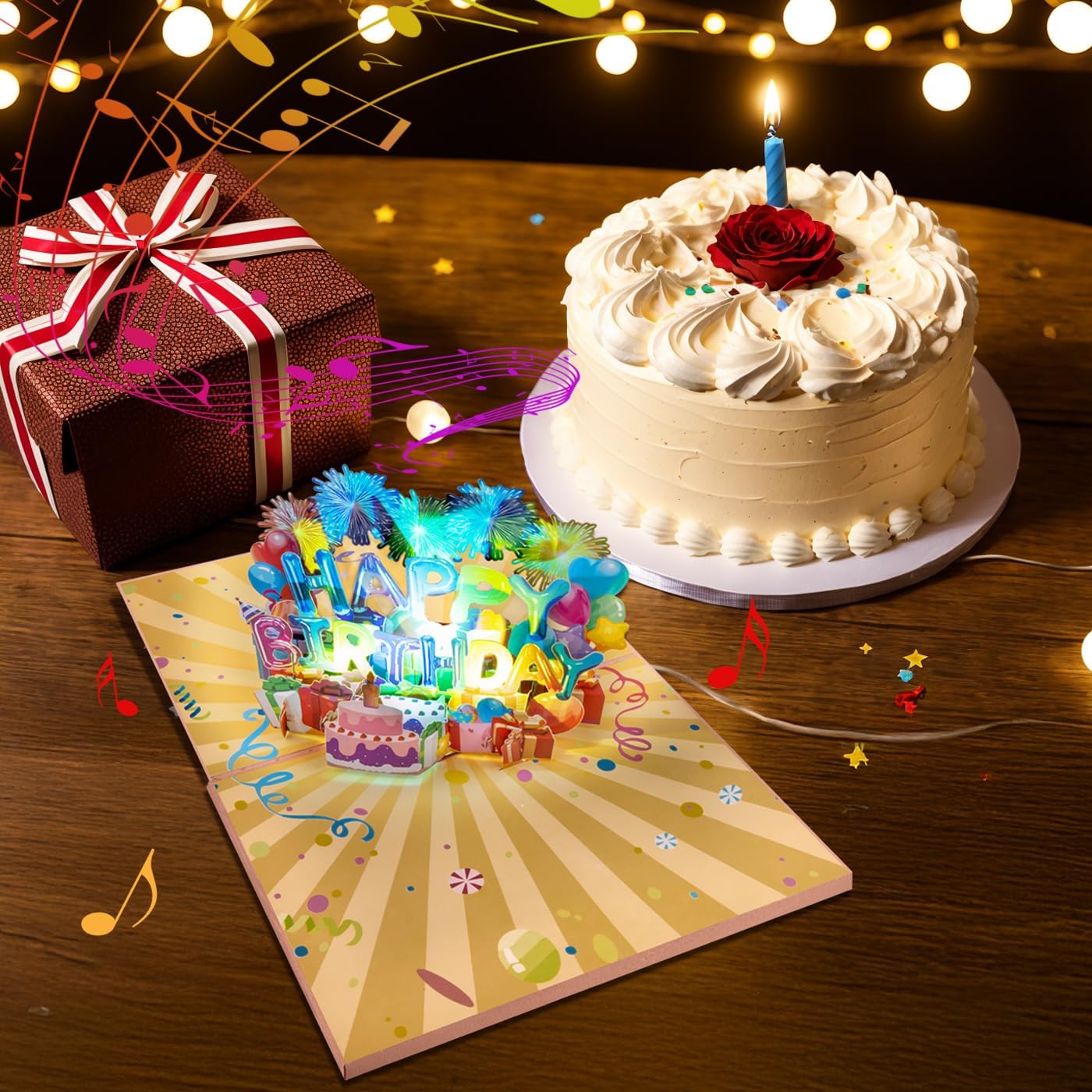 Sorpresa musicale e luminosa: apri il biglietto e dai il benvenuto con un'incantevole melodia "Happy Birthday" e luci luminose che mettono in risalto il design pop-up 3D. Perfetto per creare momenti di compleanno indimenticabili. Design 3D unico: il biglietto presenta un pop-up vivido e dettagliato con "Happy Birthday", regali colorati, palloncini e fuochi d'artificio, che lo rendono un ricordo eccezionale. ARTIGIANATO DI ALTA QUALITÀ: realizzato con carta di alta qualità e una precisa tecnologia di taglio laser che garantisce un biglietto durevole e meravigliosamente dettagliato che sarà apprezzato per gli anni a venire. Perfetto per tutte le età: che sia per un bambino, un amico, un genitore o un nonno, questo biglietto è adatto a qualsiasi festa di compleanno e porta gioia e magia a quella persona speciale. Pronto per la spedizione: viene fornito con una busta abbinata per poterlo inviare o regalare personalmente.