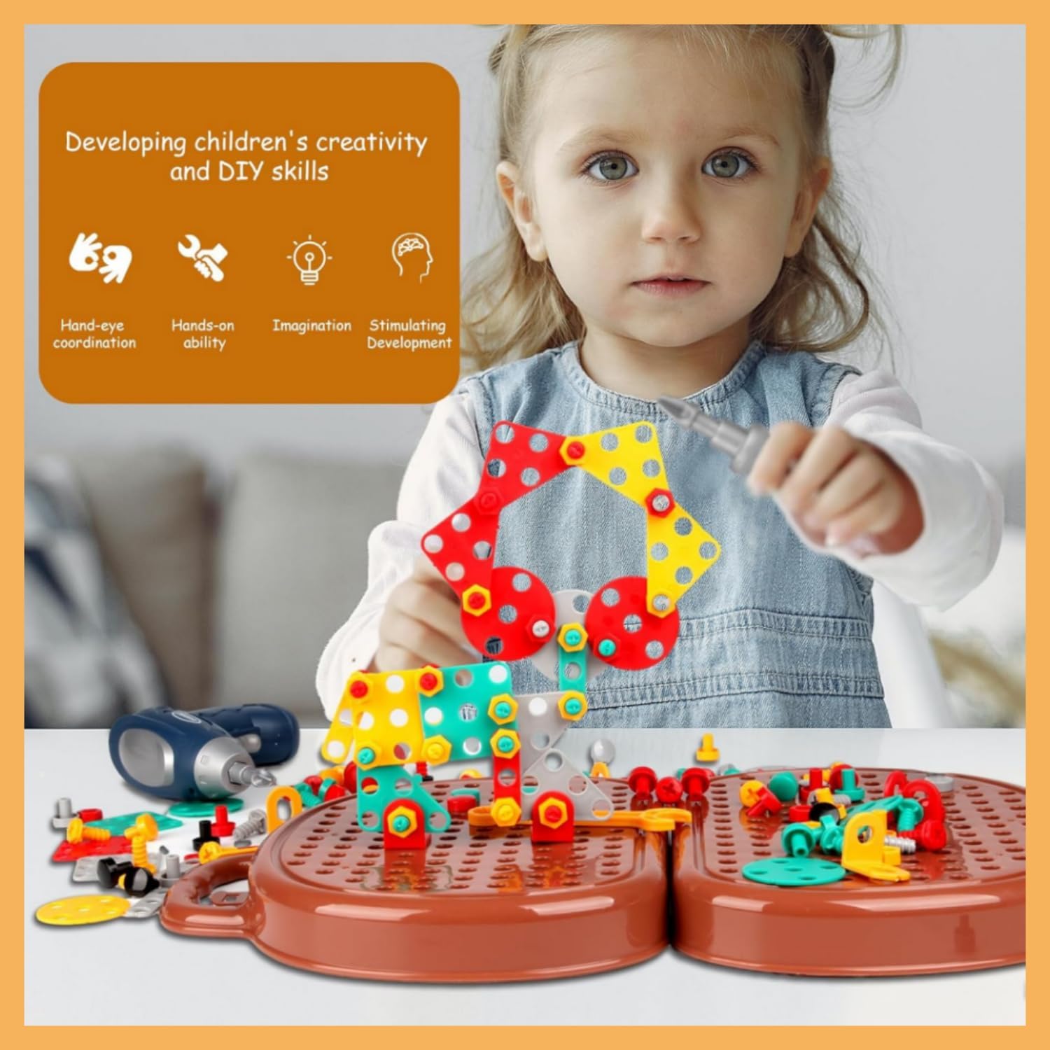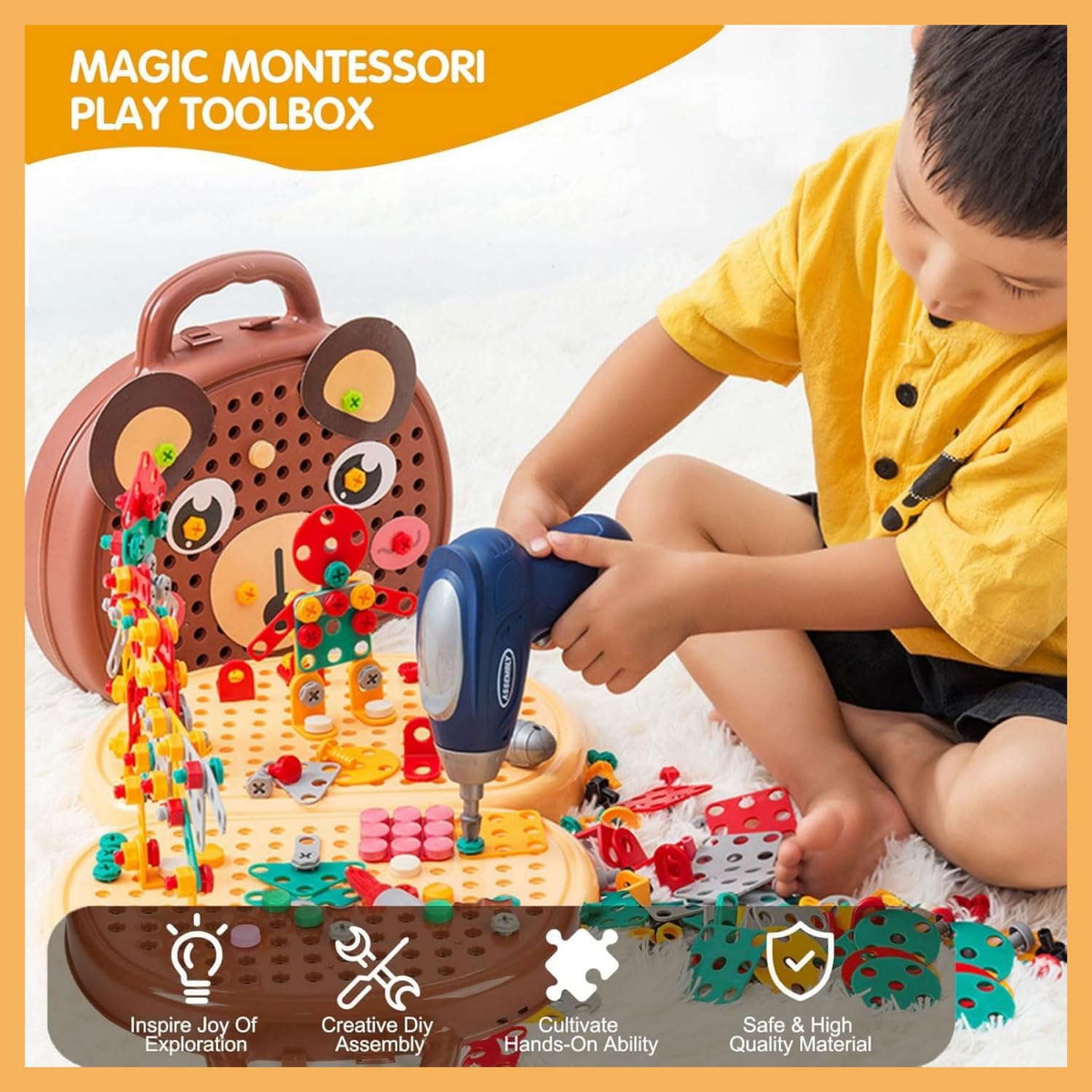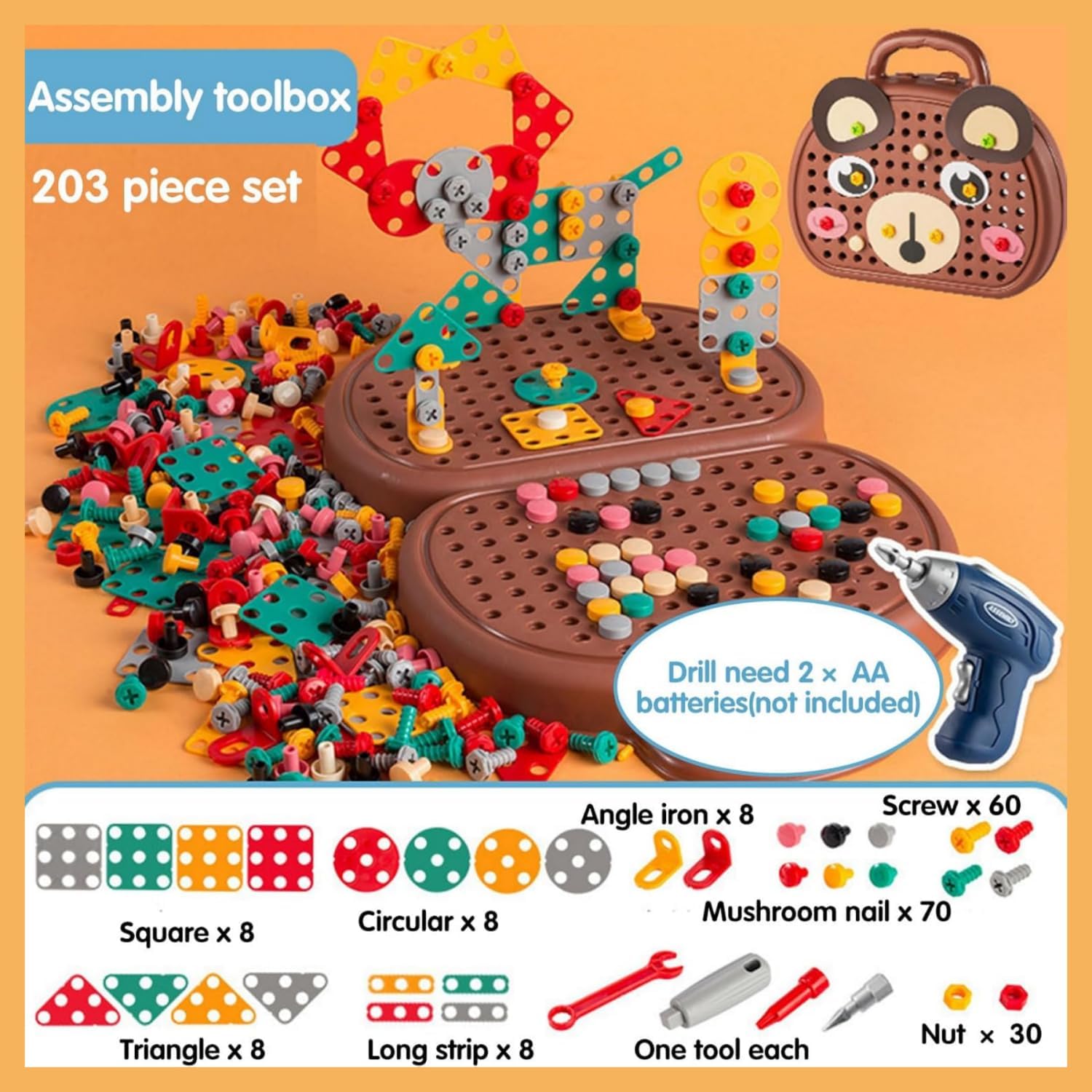 【Cassetta degli attrezzi per bambini tutto in uno per costruire Montessori】 Scatena il divertimento pratico con la magica scatola dei giocattoli Montessori: un laboratorio di gioco di finzione completo progettato per giovani costruttori curiosi dai 4 agli 8 anni. Include un trapano elettrico realistico (a batteria, velocità sicura), un cacciavite giocattolo e una chiave inglese per incoraggiare l'esplorazione degli strumenti nel mondo reale. Guarda il tuo bambino torcere, stringere e assemblare le proprie creazioni, sviluppando sicurezza e capacità motorie complesse attraverso giochi di costruzione fantasiosi. 【Apprendimento STEM attraverso il gioco - Sviluppa abilità critiche】 Molto più che semplici giocattoli: questo kit di ingegneria da 207 pezzi favorisce lo sviluppo STEM precoce nei bambini. Promuove la creatività, il pensiero logico, la coordinazione occhio-mano, la consapevolezza spaziale, il riconoscimento della forma e le capacità di risoluzione dei problemi. Perfetto per l'apprendimento ispirato a Montessori a casa o in ambienti prescolari, aiutando i bambini ad apprendere i concetti meccanici di base divertendosi. 【Design sicuro, durevole e adatto ai bambini】 Realizzato in plastica ABS di alta qualità, priva di BPA: leggera, resistente agli urti e con bordi lisci per la sicurezza. Colori brillanti e vibranti catturano l'attenzione e stimolano il coinvolgimento visivo. Il trapano elettrico è dotato di rotazione a bassa velocità per garantire un gioco sicuro, rendendolo ideale per neonati e bambini piccoli. Richiede 2 batterie AA (non incluse). 【Scatena l'immaginazione e la costruzione creativa】 Con oltre 200 pezzi colorati tra cui viti, dadi e connettori, i bambini possono progettare infiniti mosaici 2D o strutture 3D. Incoraggia il gioco aperto, aumentando la creatività, la concentrazione e la narrazione. Che si tratti di costruire robot, veicoli o opere d'arte astratta, questo set trasforma il tempo di gioco in un'esperienza di apprendimento dinamica che imita le attività di ingegneria della vita reale. 【Regalo educativo perfetto per ogni occasione】 Un regalo ideale per compleanni, Natale, Ringraziamento o vacanze! Questo coinvolgente set di costruzione supporta lo sviluppo cognitivo e sociale offrendo ore di intrattenimento senza schermo. Amato sia dai ragazzi che dalle ragazze, è un regalo premuroso per ogni bambino che ama costruire, creare ed esplorare. Ottimo per la casa, l'aula o il viaggio!