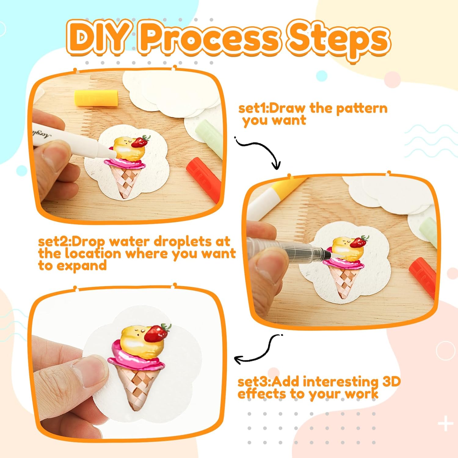 Sicuro e affidabile: la texture a bolle della carta da disegno è sicura e affidabile, adatta per l'uso a casa, in classe e alle feste. La trama della superficie è unica e può essere dipinta. Sicuro e artistico allo stesso tempo, offre diversi scenari un'espressione creativa. Effetto 3D: la carta magica a bolle può essere utilizzata per dipingere. Le opere attivate dalle bolle d'acqua si espandono e formeranno un effetto 3D. Combinando colore e consistenza, è possibile creare opere d'arte uniche con effetto stratificazione. La confezione include: 12 matite acquerellabili, 10 pezzi di cotone, 3 pennelli e 1 cavalletto, che possono essere utilizzati per creare opere d'arte ricche e uniche grazie allo strato di colore, all'attrito in cotone e al bordo con pennelli acquerello. Flessibile da usare: compatibile con una varietà di strumenti di scrittura e disegno come pennarelli, pastelli, penne, ecc. È adatto per biglietti di auguri, poster, progetti scolastici e regali fatti a mano, offrendo un veicolo versatile e adattabile per l'espressione creativa. AMPIA APPLICAZIONE La vernice magica in schiuma è adatta per l'artigianato fai da te per bambini, progetti di decorazione domestica e attività scolastiche che stimolano l'immaginazione, il gioco e l'apprendimento e forniscono supporto per la trama per la pratica creativa in diversi scenari.