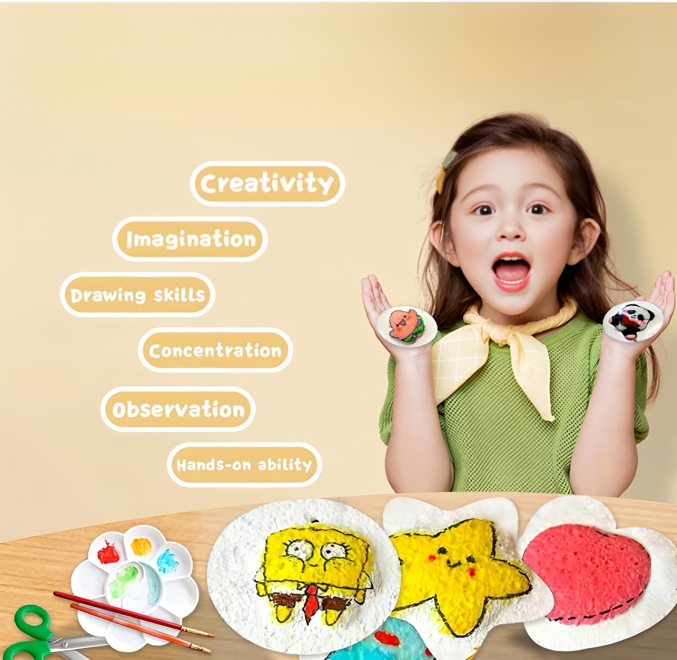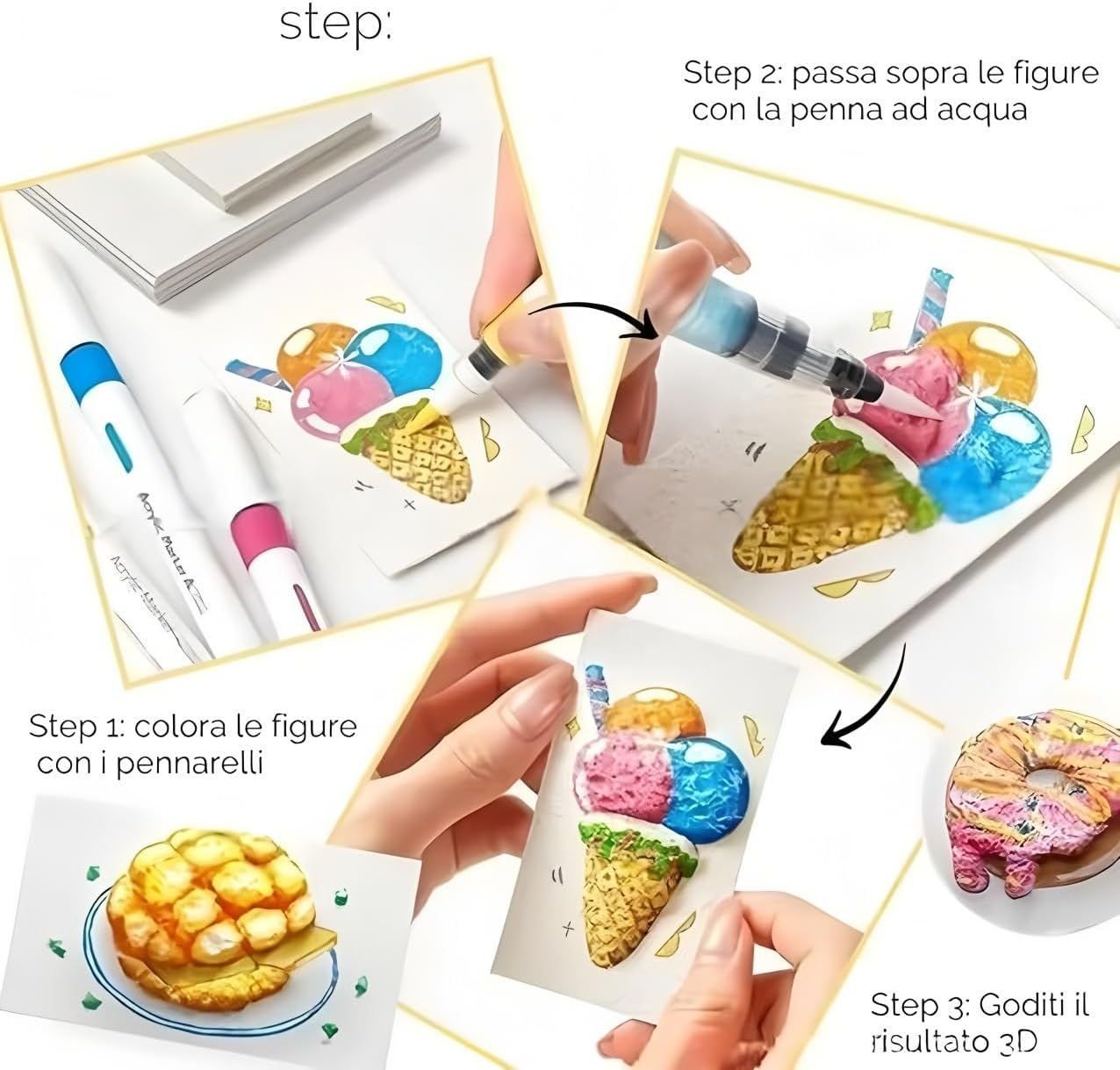 Include: 10 fogli di texture in schiuma, 24 pennarelli colorati, 3 matite acquerellabili vuote con punta morbida, 10 catene di perle 1 x mini cavalletto per presentare il tuo capolavoro. Basta mettere il set compatto in tasca – per escursioni, lezioni d'arte o tranquilli pomeriggi a casa. Magic Puffy Paint Effetto 3D: Utilizzando una formula unica in schiuma, questa vernice si espande quando viene a contatto con l'acqua, creando una texture artistica morbida e tridimensionale che trasforma i dipinti 2D in opere di rilievo 3D! I bambini possono immergersi nella creatività stratificando colori e trame, dando vita a pezzi finiti vivaci e interessanti che ispirano l'immaginazione spaziale e l'esplorazione artistica Materiali: la vernice è atossica e inodore. Dopo l'espansione, ha una consistenza morbida che non si spezza; una volta asciugati, i colori sono vivaci e duraturi senza sbiadire. Il design accurato della confezione lo rende facile da riporre, con spugne e spazzole riutilizzabili che sono sia ecologici che economici. Colore magico gonfio fai da te: perfetto per artigianato per bambini, progetti fai da te, decorazioni natalizie o rilassante terapia artistica. Che tu stia cercando un inseguimento giocoso o un progetto creativo per coinvolgere i tuoi bambini, questo set di vernici dalla consistenza soffice è la scelta perfetta. Crea una splendida arte 3D: disegna prima su carta e poi spazzola gocce d'acqua, e il tuo design si espanderà come per magia! Trasforma le opere d'arte piatte in capolavori 3D dinamici! Un modo fantastico per stimolare l'immaginazione e tenere tutti occupati per ore.