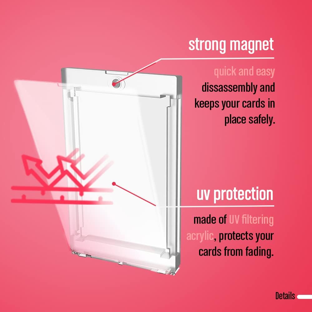 BUSTE PER CARTE IN ACRILICO: Custodia per carte collezionabili Pok e tutti i tipi di carte collezionabili. Conserva la tua collezione ed esponi le tue carte più belle con queste cornici acriliche che le proteggeranno dalla polvere, dal sole e dall'umidità. APERTURA E CHIUSURA MAGNETICA: Sul coperchio è presente un potente magnete che fissa la carta all'interno con un solo tocco, tenendola in posizione e facilitando l'incorniciatura. Non hai bisogno di un cacciavite o di altri strumenti per montarlo e avrai la tua collezione pronta da esporre in un attimo. DIMENSIONE STANDARD: si adatta alle dimensioni standard delle carte collezionabili (2,5 x 3,5 pollici) fino a 35 pt di spessore. Puoi usarlo per carte collezionabili di calcio, baseball, basket, hockey e altre collezioni. ANGOLI SATINATI: Queste cornici sono progettate pensando ai collezionisti e ogni dettaglio serve a preservare preziose carte collezionabili, ecco perché sono dotate di angoli a forma di diamante per evitare che gli angoli si pieghino o si spezzino. MATERIALE RESISTENTE: realizzato in plastica acrilica, è molto più resistente del vetro. Le carte mostreranno fedelmente i loro colori grazie alla sua trasparenza e inoltre filtra i raggi del sole, proteggendo le tue carte dallo sbiadimento dovuto all'esposizione ai raggi UV.T11