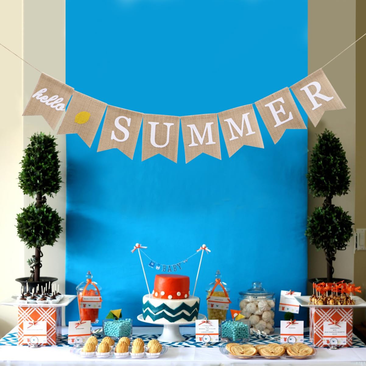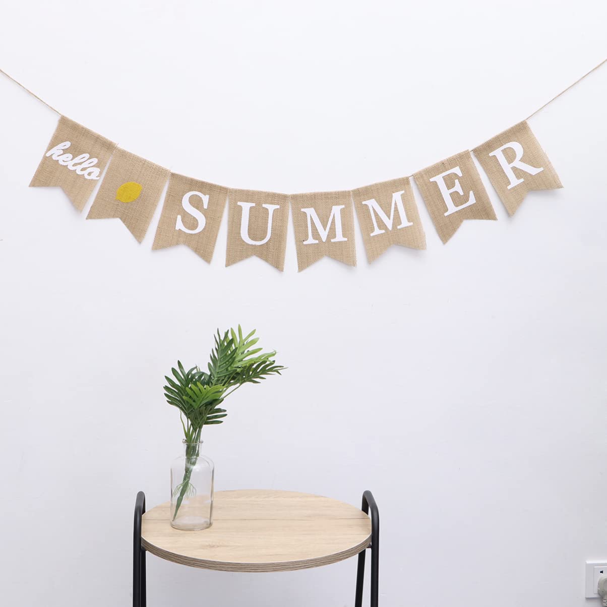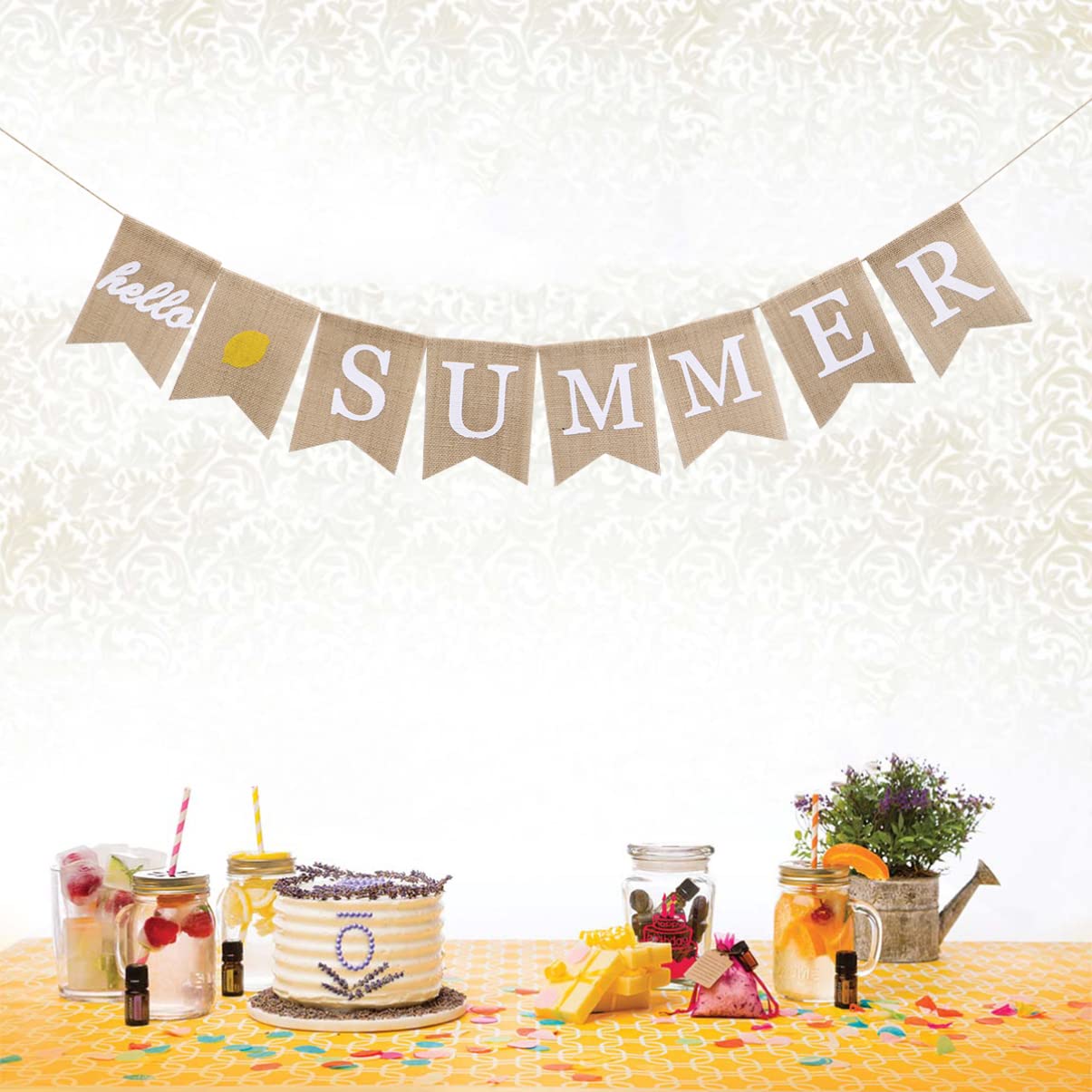 Bandiere che celebrano l'estate: decorazioni estive e la stagione più felice dell'anno, striscione estivo. Ciao striscione estivo: crea un'atmosfera forte per una torta o un tavolo da dessert, una camera da letto o come sfondo all'arrivo di un evento estivo. Bandiera ghirlanda: carta perlescente e nastro di seta, ogni misura: ca. 13 x 17 cm. Ghirlanda estiva: realizzata in tela di juta naturale, le lettere sono stampate con vernice bianca vivace e un e un vengono utilizzati per separare le parole. Ghirlanda: prova ad appenderla sul dessert o sul tavolo, sullo sfondo della parete, sull'arredamento della casa, la nostra decorazione attirerà l'attenzione di tutti gli ospiti alla tua festa o ad un'occasione speciale.