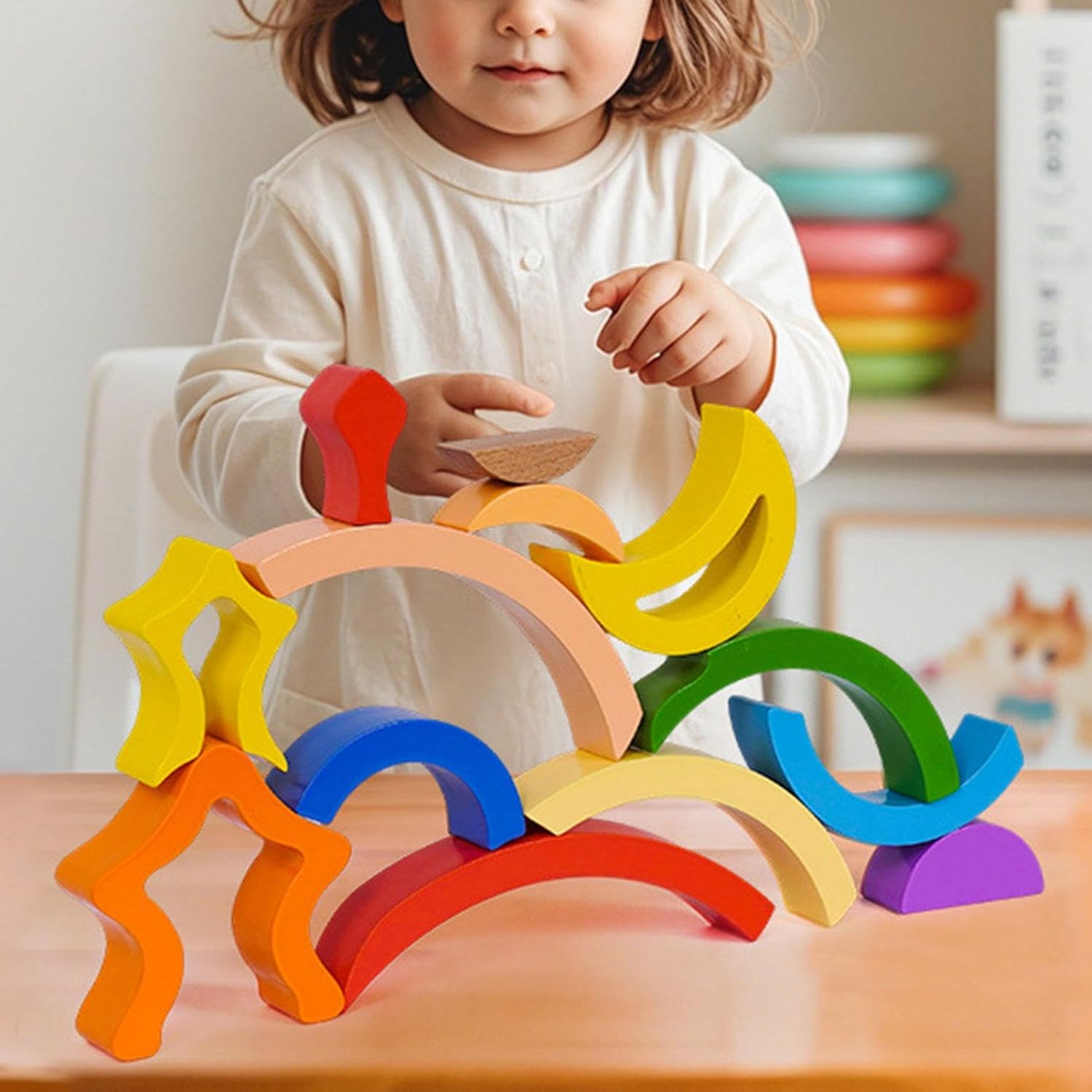 【Gioco di impilamento divertente e stimolante】I bambini bilanciano e impilano blocchi arcobaleno, migliorando la coordinazione occhio-mano e le capacità motorie fini attraverso l'apprendimento 【Stimola la creatività e la risoluzione dei problemi】 Nessuna regola fissa! I bambini costruiscono liberamente forme uniche, stimolando l'immaginazione, la consapevolezza spaziale e il pensiero indipendente. 【Sviluppa le abilità chiave della prima infanzia】 Migliora l'equilibrio, la concentrazione e il riconoscimento dei colori con tenui tonalità arcobaleno che catturano l'attenzione dei più piccoli, insegnando al contempo i concetti base sui colori 【Design in legno di alta qualità】 arcobaleno in legno è realizzata in legno robusto (12,60 pollici x 5,12 pollici), delle dimensioni perfette per essere afferrata e impilata dalle manine dei più piccoli 【 regalo】 Include un set completo di giocattoli impilabili arcobaleno per un gioco creativo senza fine, ideale per compleanni, vacanze o educazione della prima infanzia a casa o a scuola
